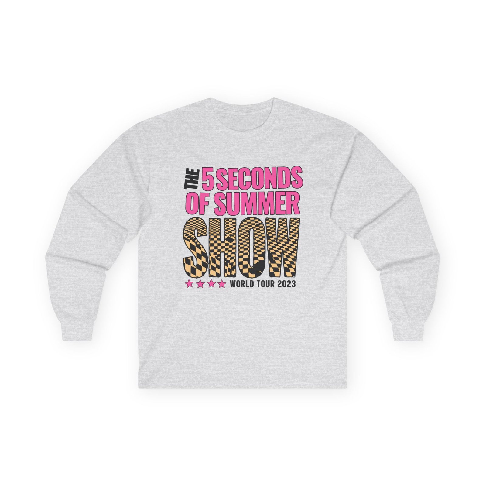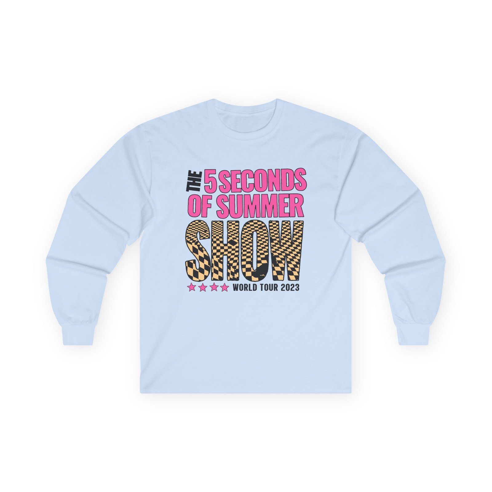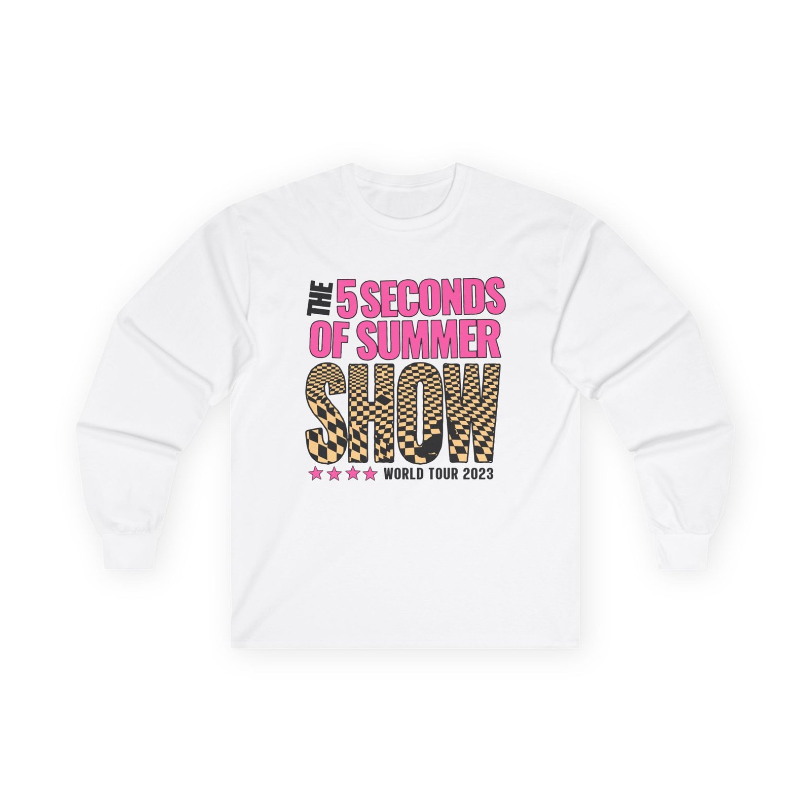 A bit more formal than a standard-issue t-shirt, the 5sos Tour ultra cotton long sleeve tee is a clear comfort winner. The sleeves also act as a nice frame. There are no side seams. The shoulders are taped for improved durability. This makes for a good fitting around the shoulders and neck. The cotton used for these shirts is environmentally friendly.