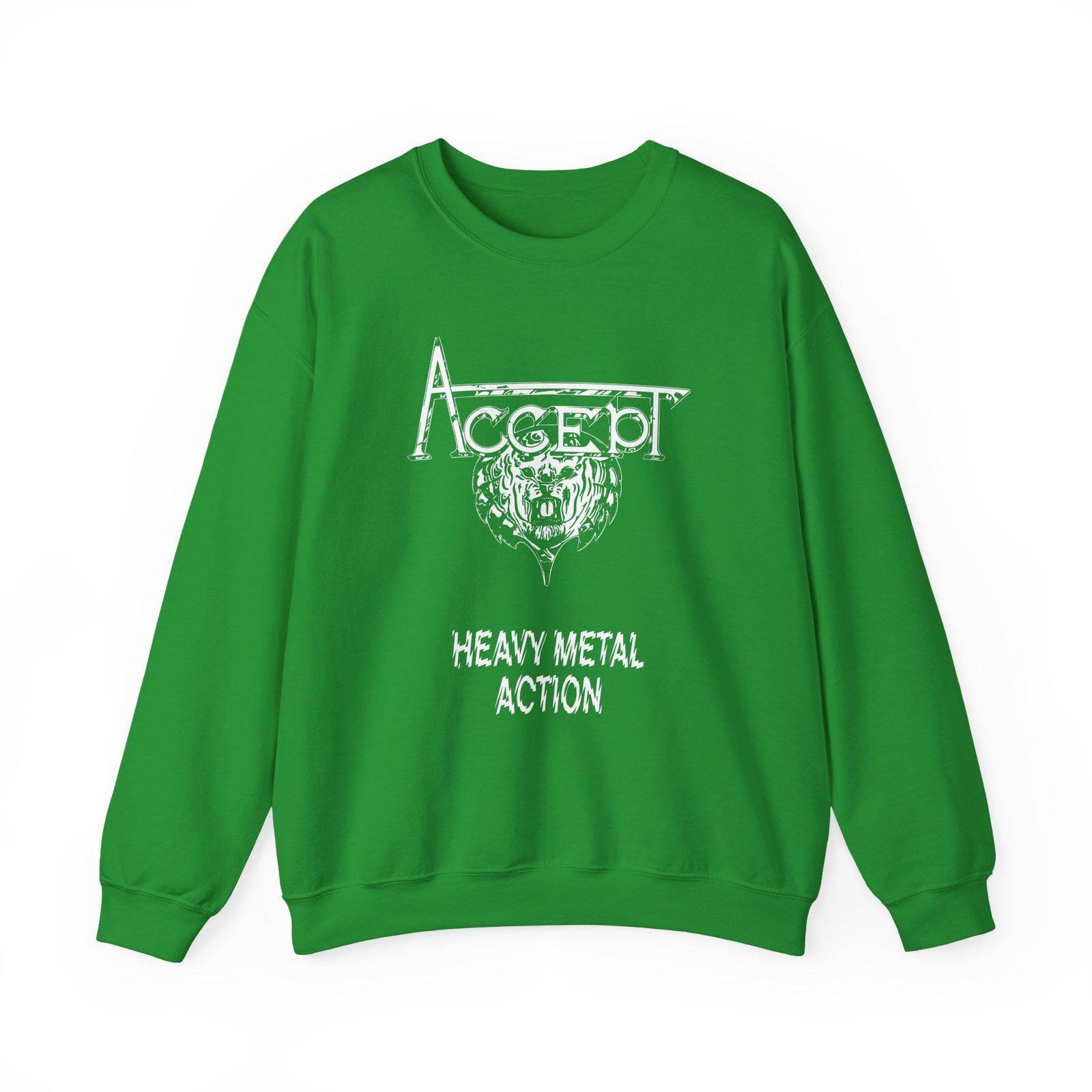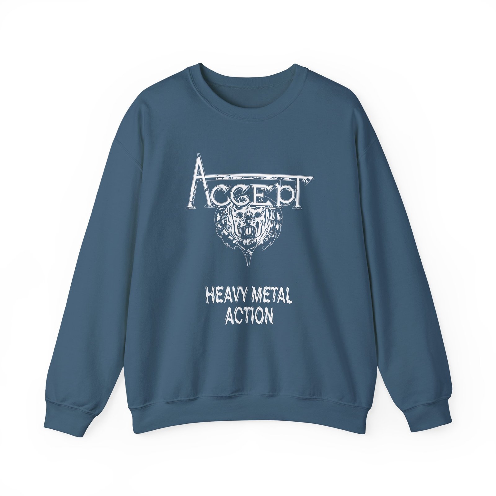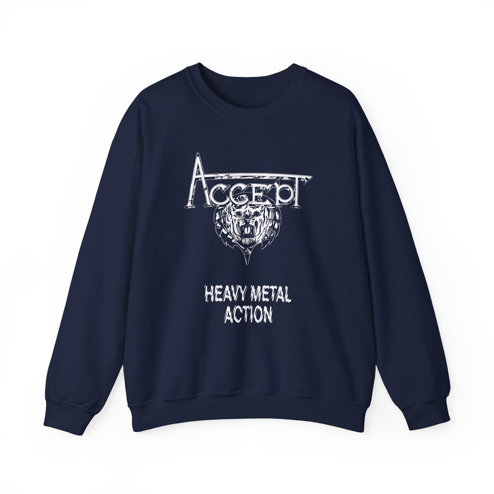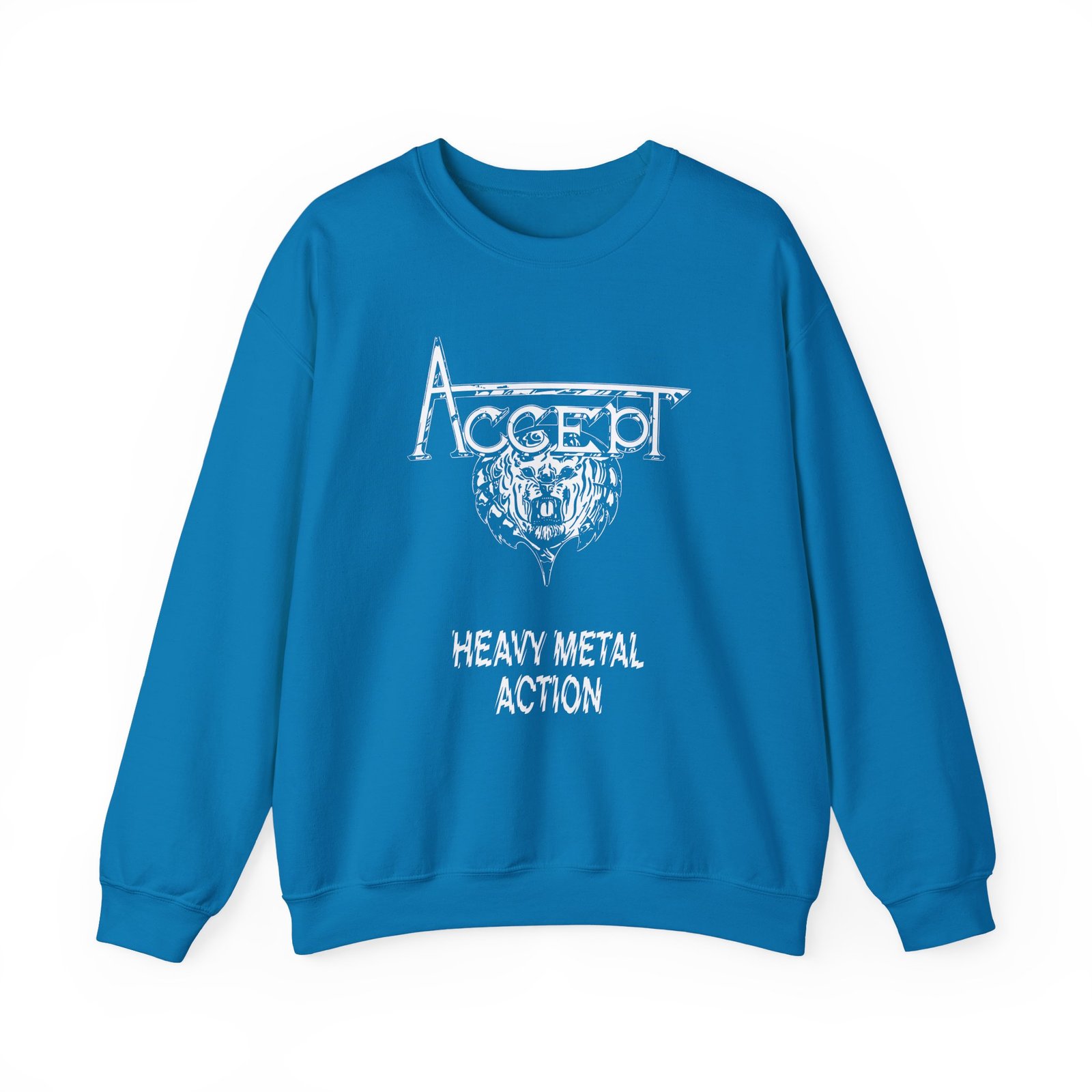 Ideal for any situation, a Accept Heavy Metal Action unisex heavy blend crewneck sweatshirt is pure comfort. These garments are made from polyester and cotton. This combination helps designs come out looking fresh and beautiful. The collar is ribbed knit, so it retains its shape even after washing. There are no itchy side seams on these sweaters.