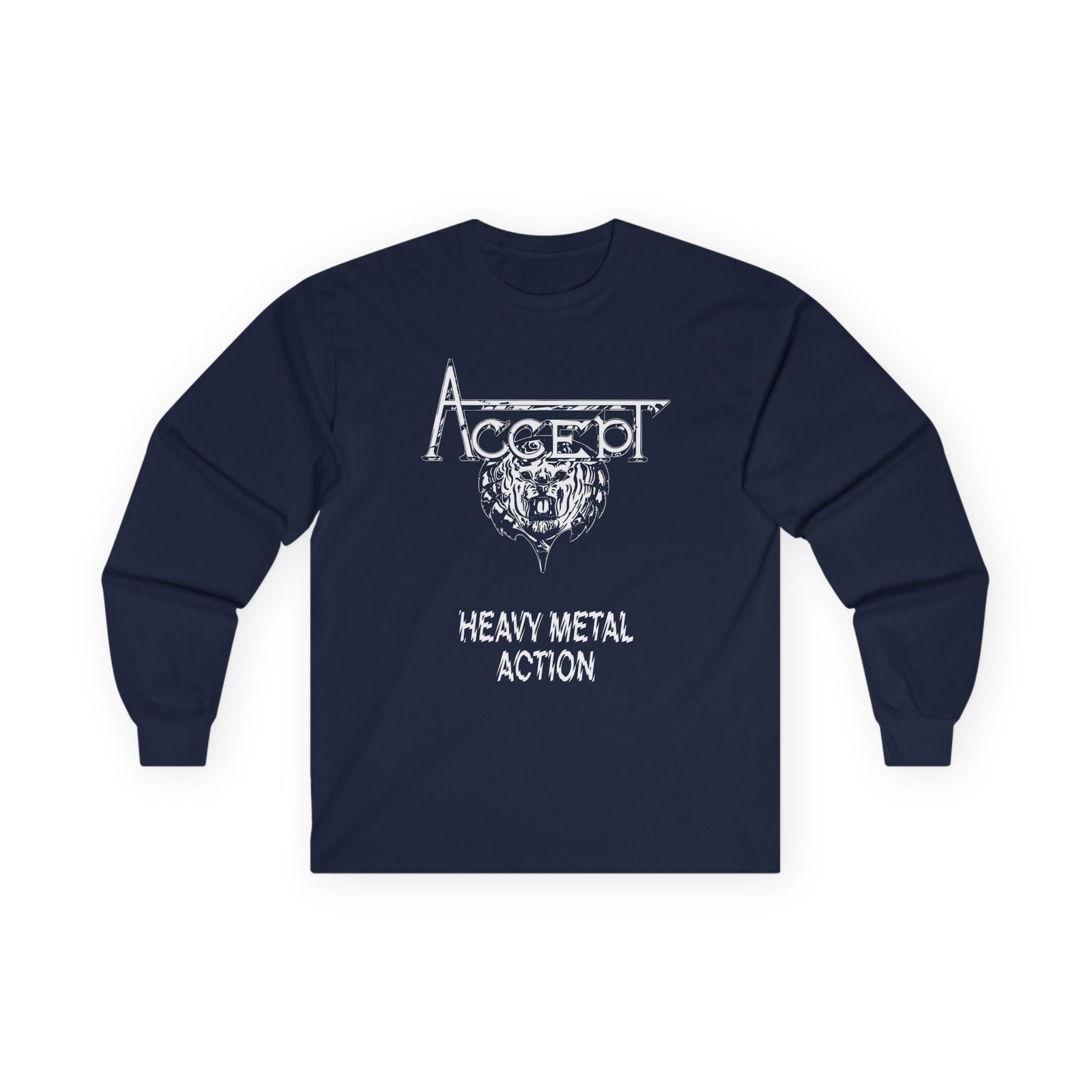 A bit more formal than a standard-issue t-shirt, the Accept Heavy Metal Action ultra cotton long sleeve tee is a clear comfort winner. The sleeves also act as a nice frame. There are no side seams. The shoulders are taped for improved durability. This makes for a good fitting around the shoulders and neck. The cotton used for these shirts is environmentally friendly.