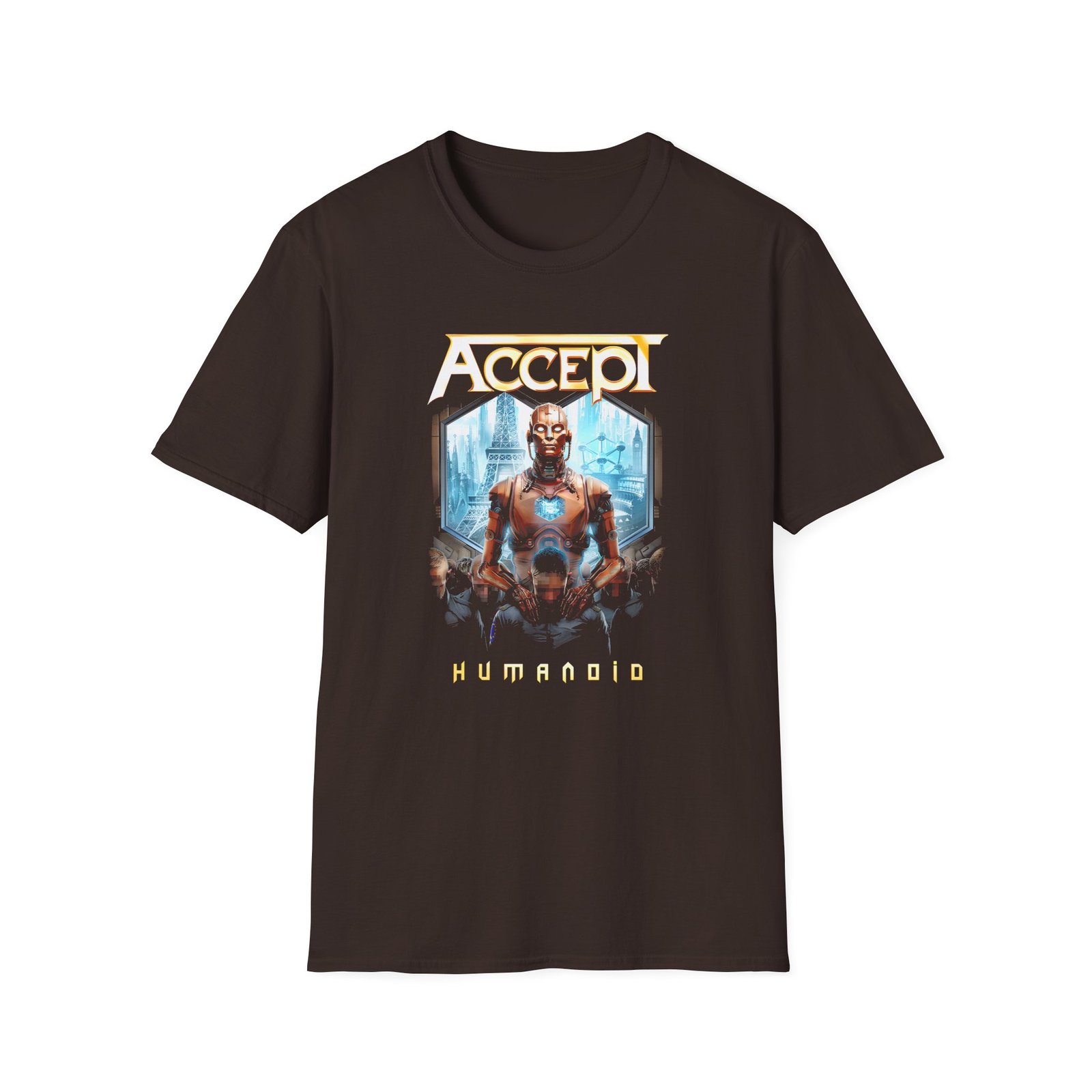 The Accept Humanoid Cover unisex soft-style t-shirt puts a new spin on casual comfort. Made from very soft materials, this tee is 100% cotton for solid colors. Heather colors and sports grey include polyester. The shoulders have twill tape for improved durability. There are no side seams. The collar is made with ribbed knitting to prevent curling damage.