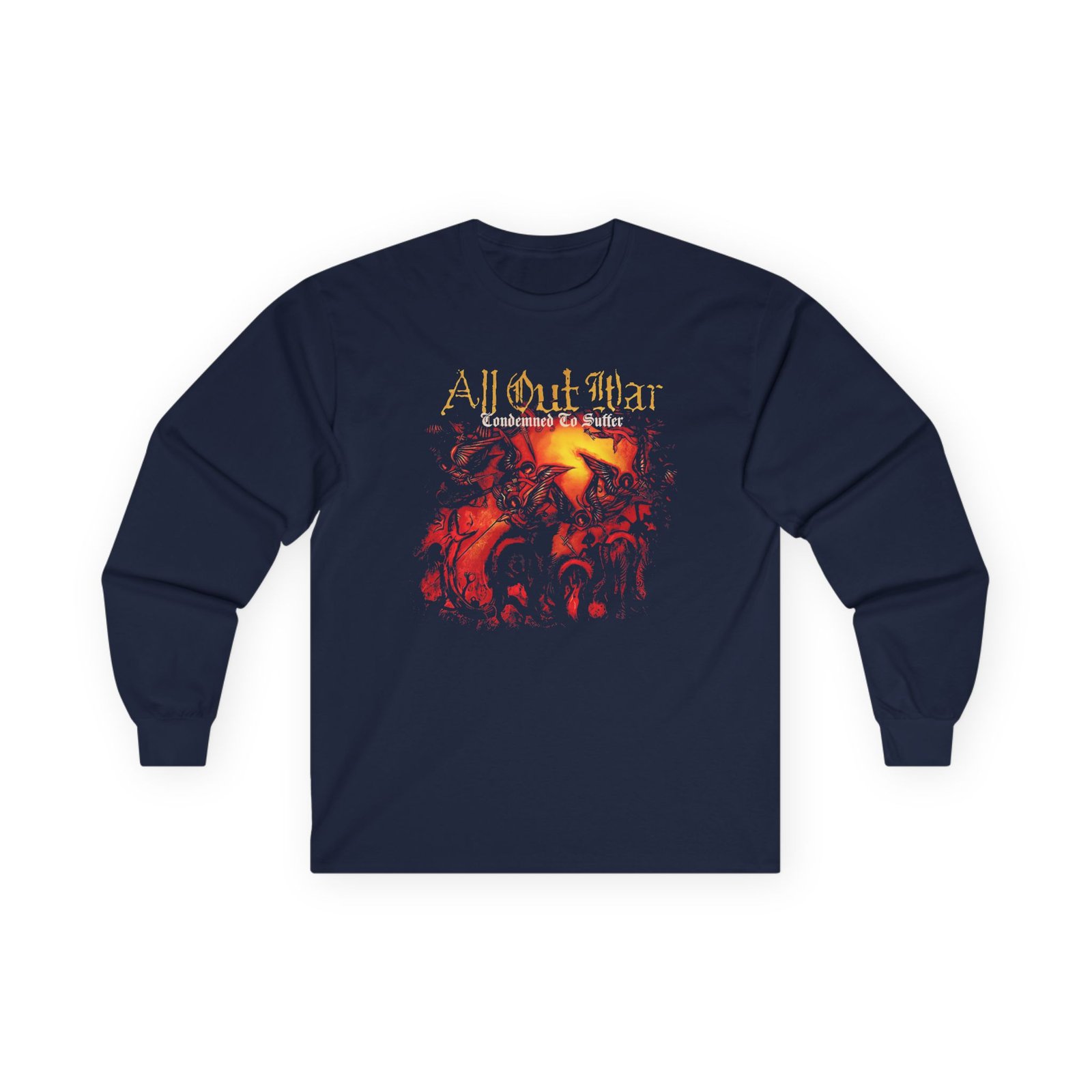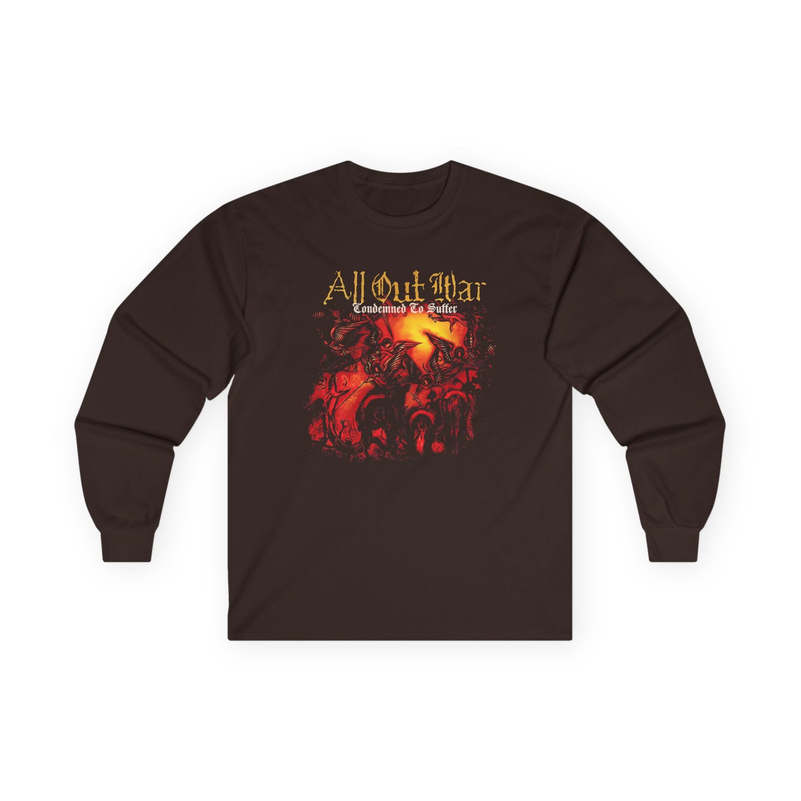 A bit more formal than a standard-issue t-shirt, the All Out War Condemned to Suffer ultra cotton long sleeve tee is a clear comfort winner. The sleeves also act as a nice frame. There are no side seams. The shoulders are taped for improved durability. This makes for a good fitting around the shoulders and neck. The cotton used for these shirts is environmentally friendly.