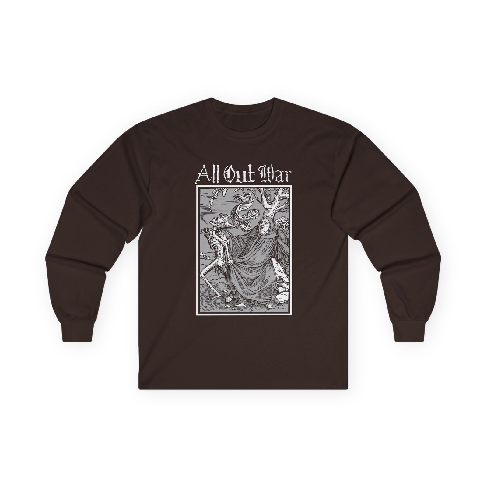 A bit more formal than a standard-issue t-shirt, the All Out War Dance of Death ultra cotton long sleeve tee is a clear comfort winner. The sleeves also act as a nice frame. There are no side seams. The shoulders are taped for improved durability. This makes for a good fitting around the shoulders and neck. The cotton used for these shirts is environmentally friendly.