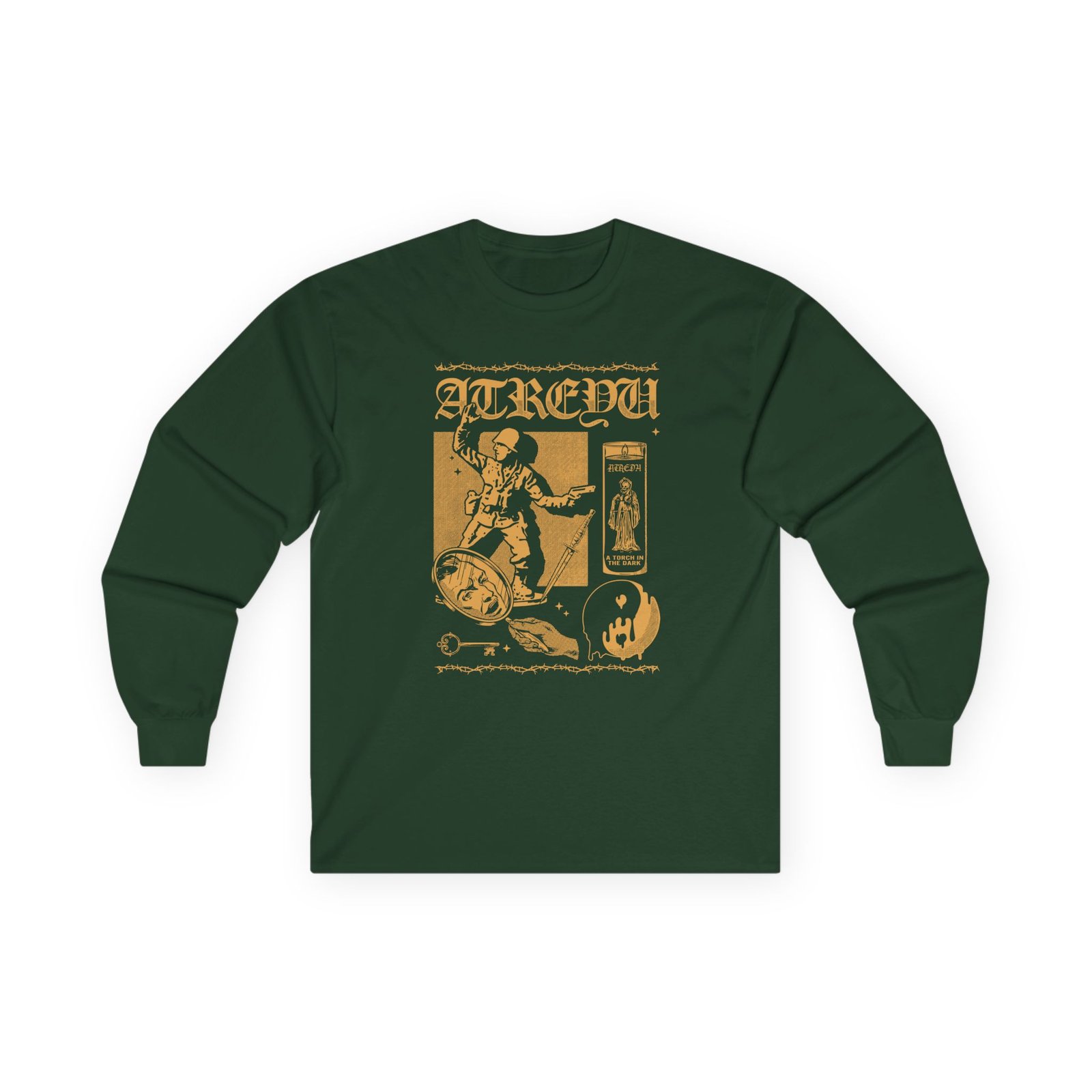 A bit more formal than a standard-issue t-shirt, the Atreyu Atitd Torch Light ultra cotton long sleeve tee is a clear comfort winner. The sleeves also act as a nice frame. There are no side seams. The shoulders are taped for improved durability. This makes for a good fitting around the shoulders and neck. The cotton used for these shirts is environmentally friendly.