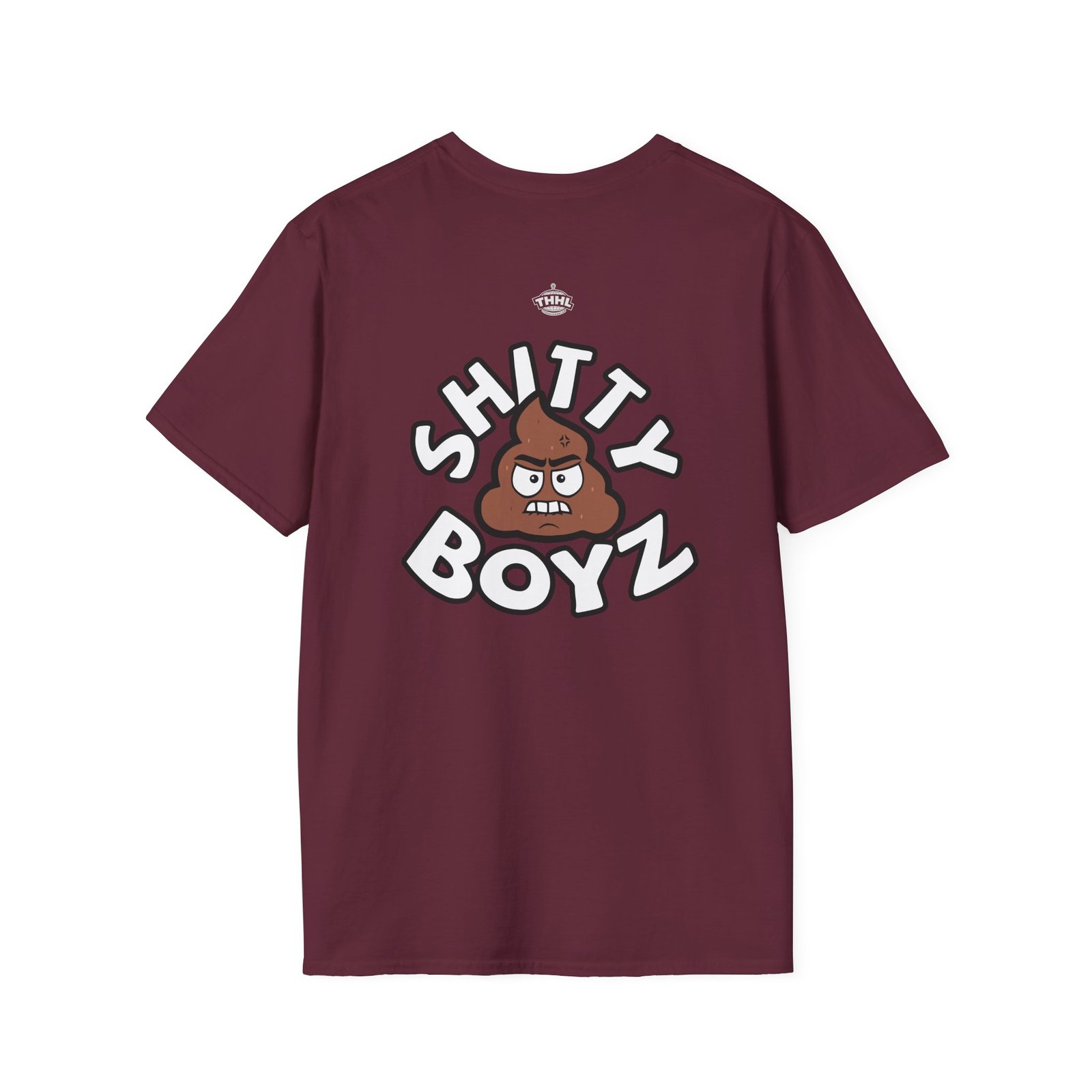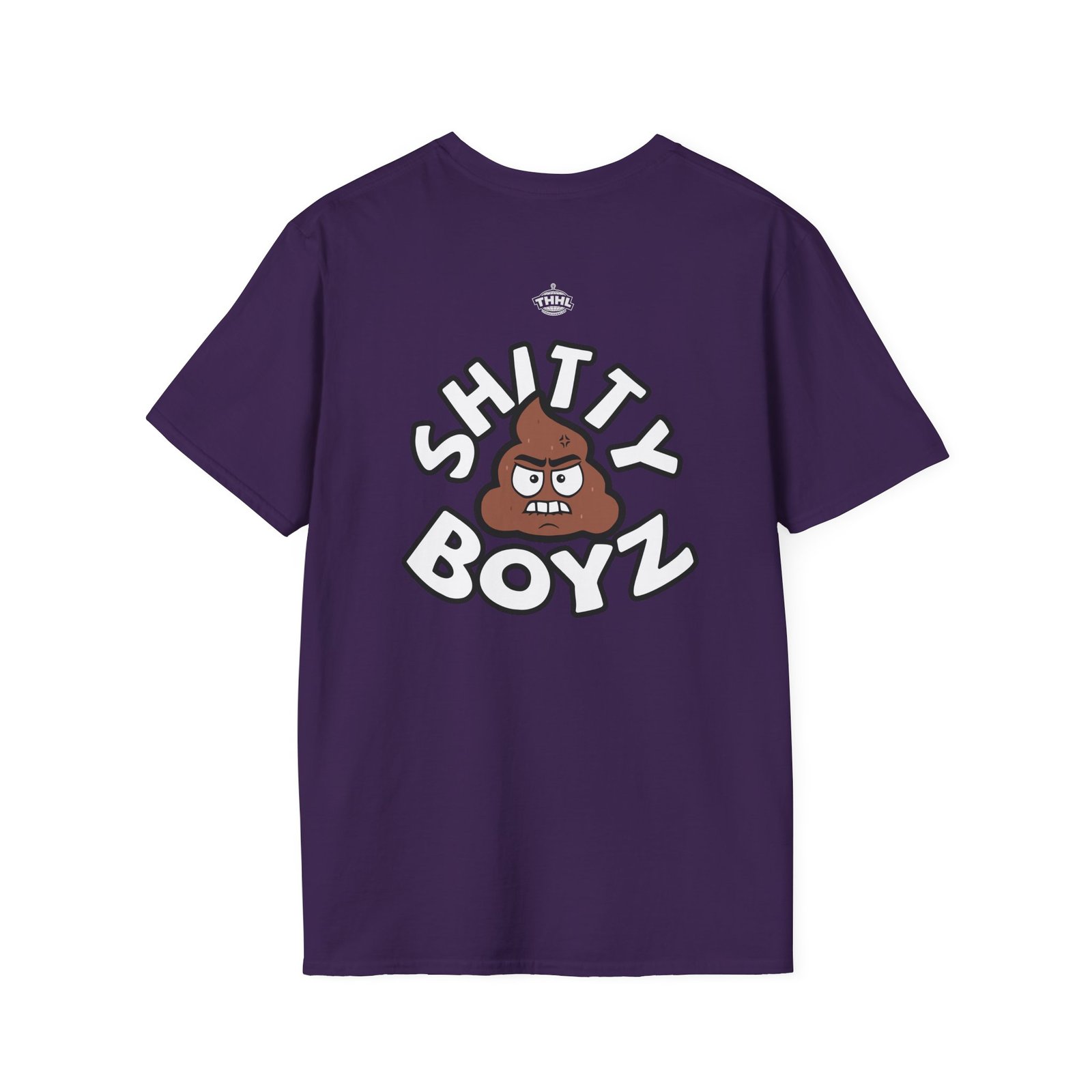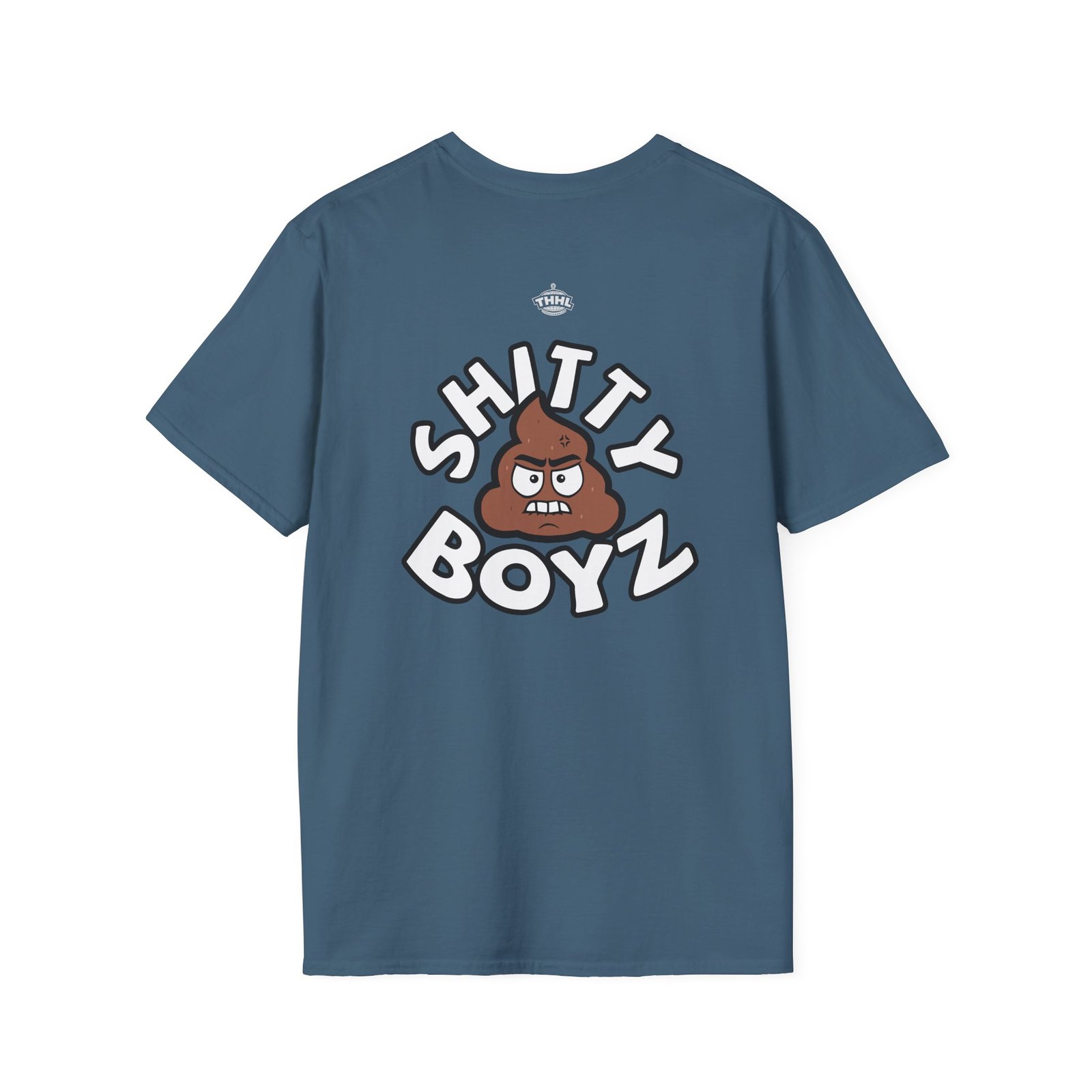 The Babytron Shittyboyz Logo unisex soft-style t-shirt puts a new spin on casual comfort. Made from very soft materials, this tee is 100% cotton for solid colors. Heather colors and sports grey include polyester. The shoulders have twill tape for improved durability. There are no side seams. The collar is made with ribbed knitting to prevent curling damage.