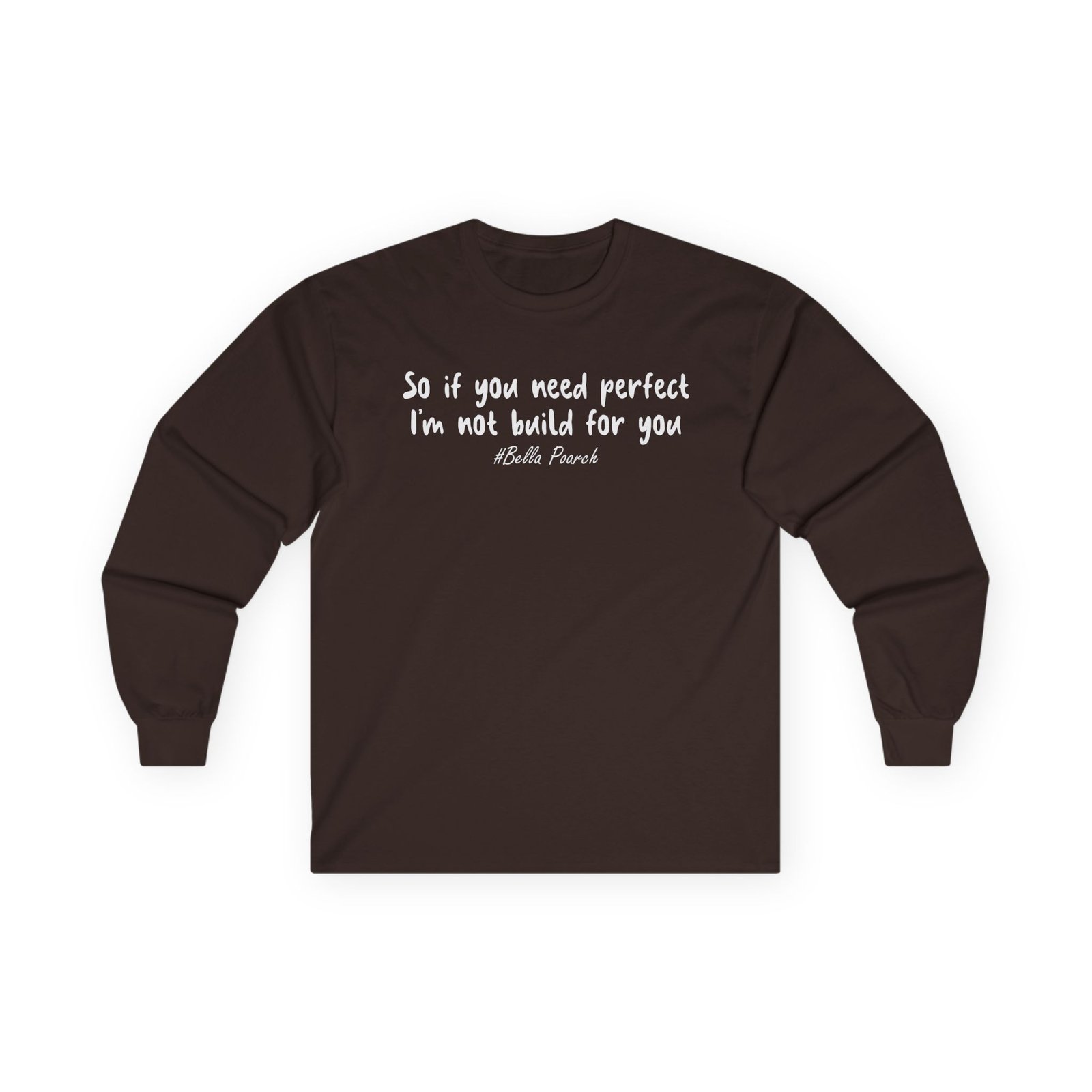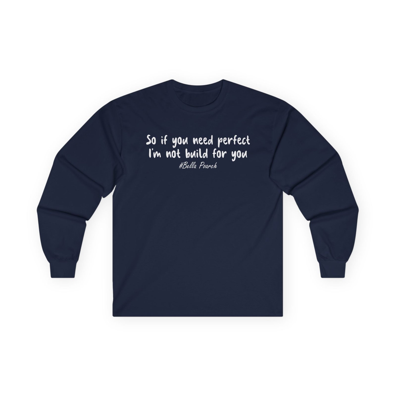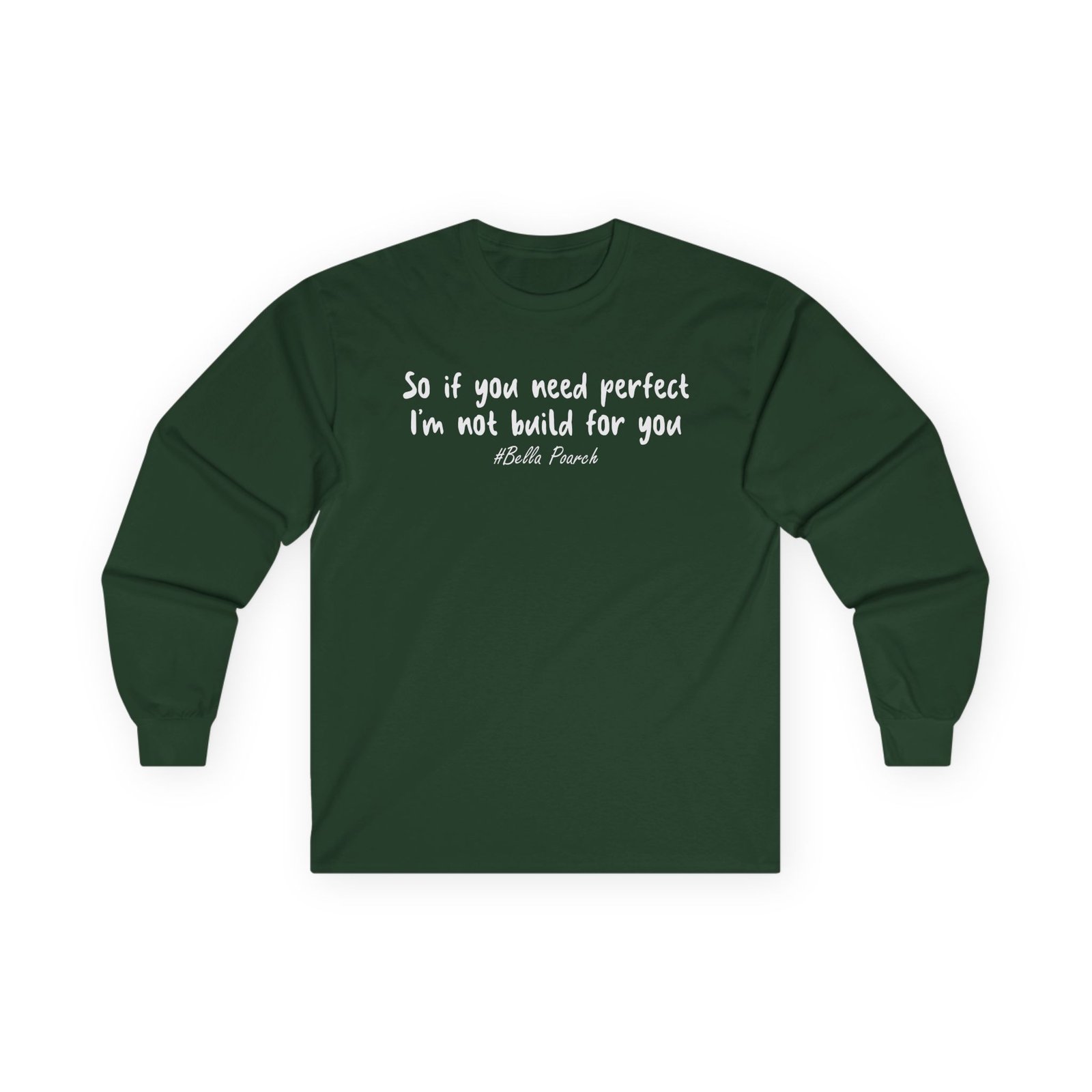 A bit more formal than a standard-issue t-shirt, the Bella Poarch So if You Need Perfect I'm Not Build for You ultra cotton long sleeve tee is a clear comfort winner. The sleeves also act as a nice frame. There are no side seams. The shoulders are taped for improved durability. This makes for a good fitting around the shoulders and neck. The cotton used for these shirts is environmentally friendly.