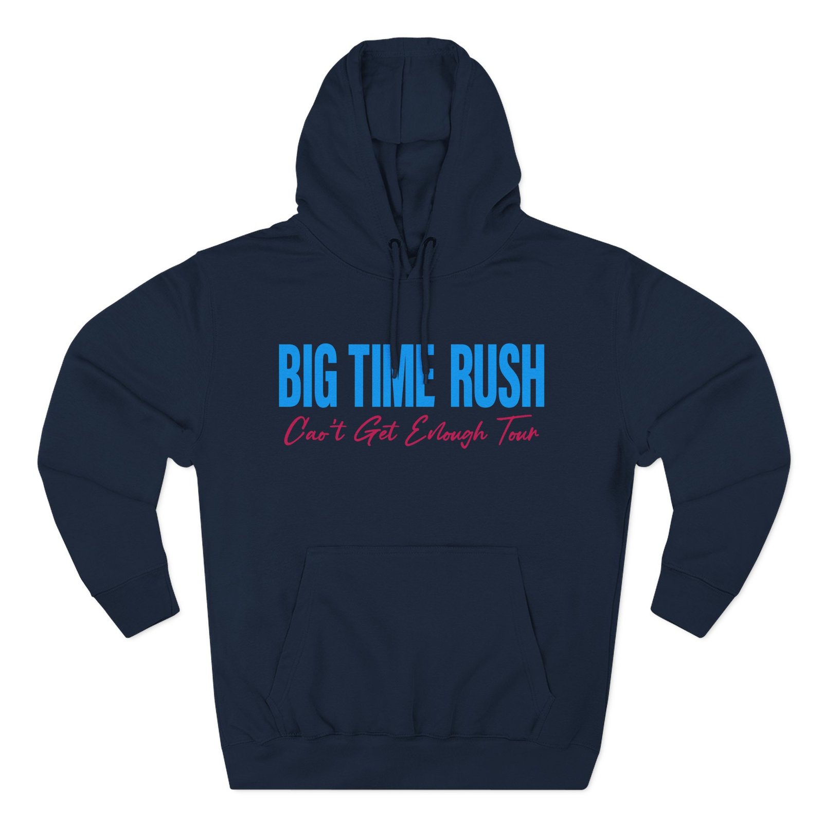 Beat the cold with this Big Time Rush Can't Get Enough Tour premium pullover hoodie that’s just the right layer of warm and cozy. Made with three-panel fleece lining, this pullover is double stitched for durability and roomy. Pick one in your favorite color to match your style.