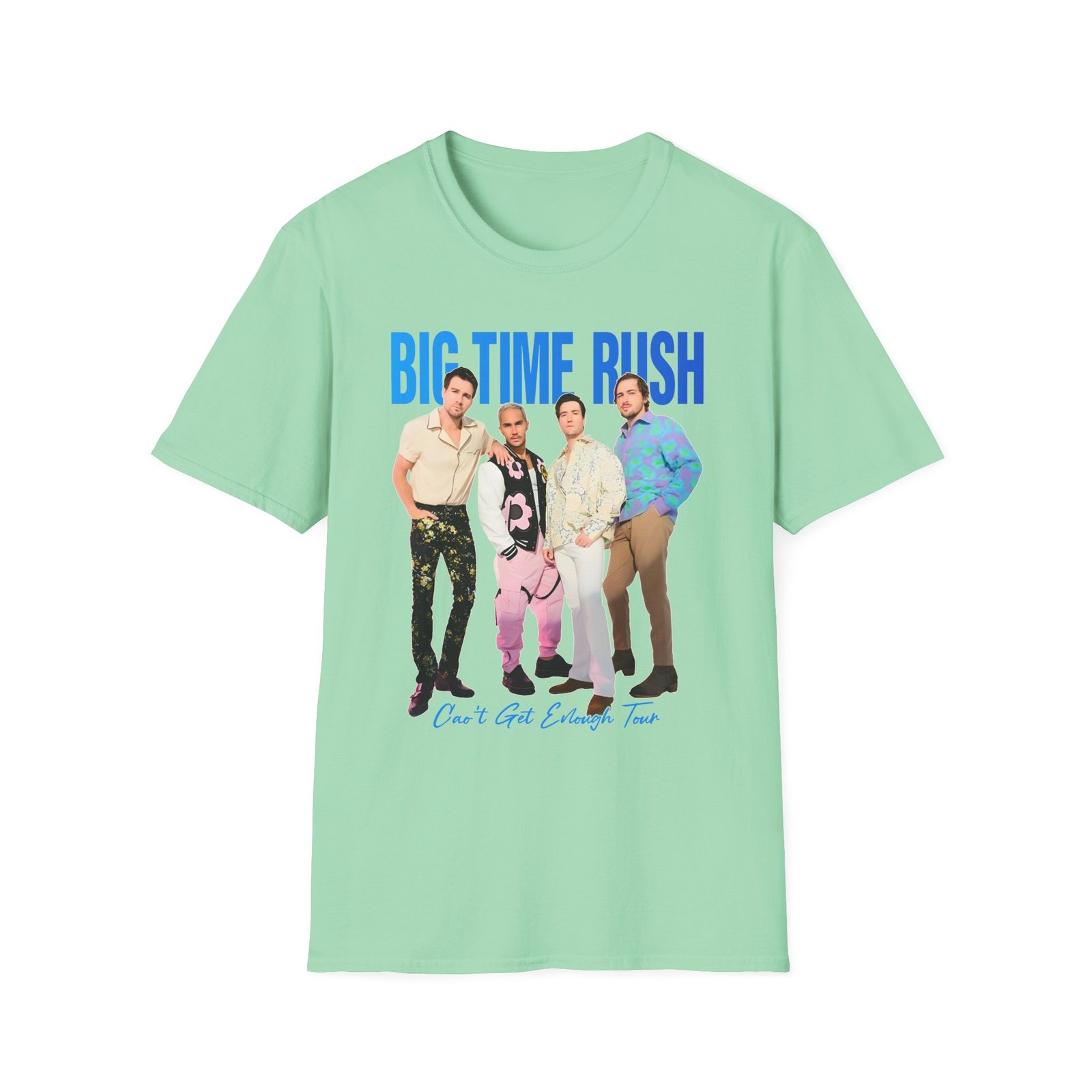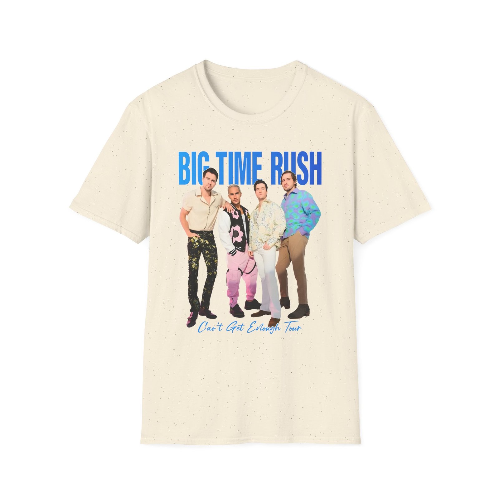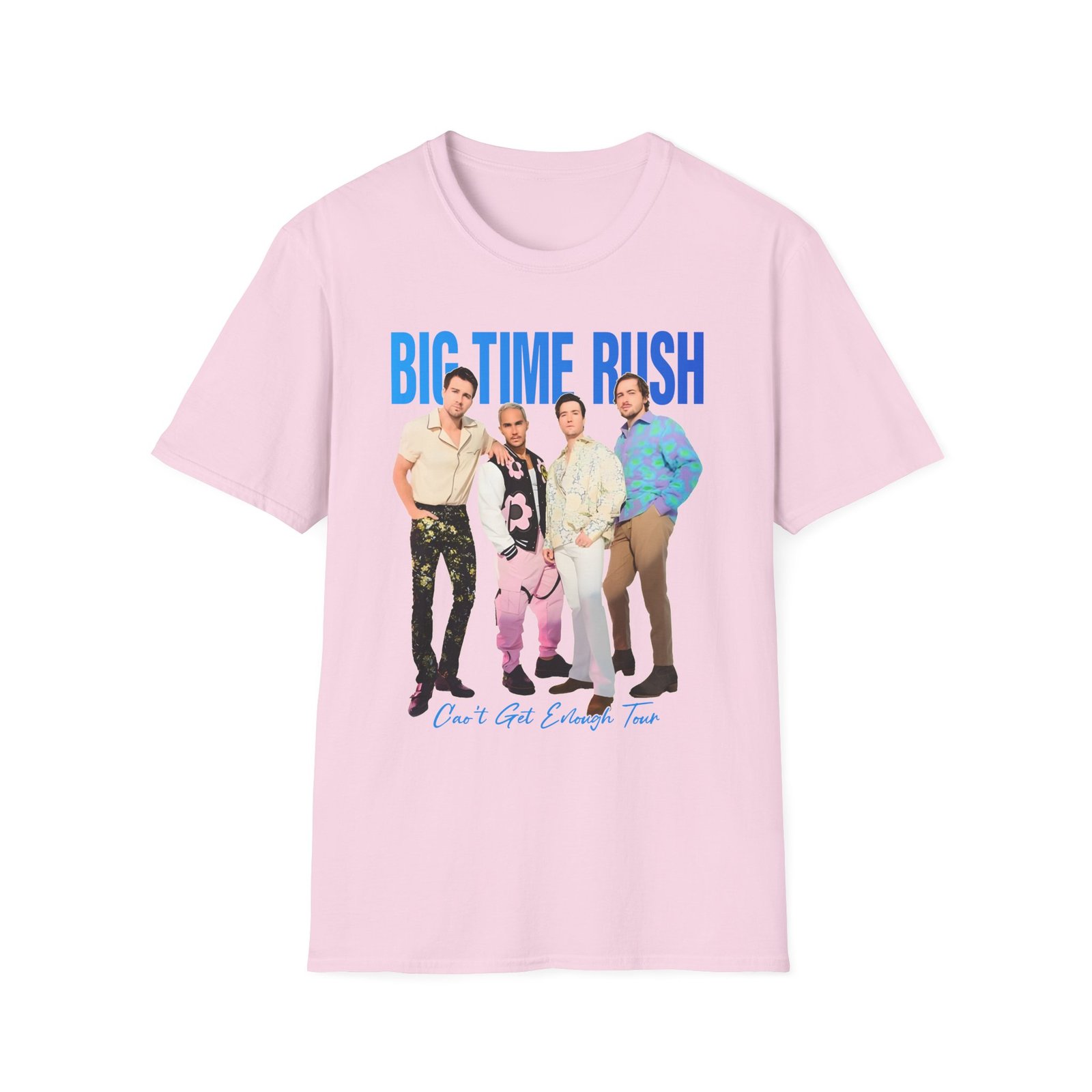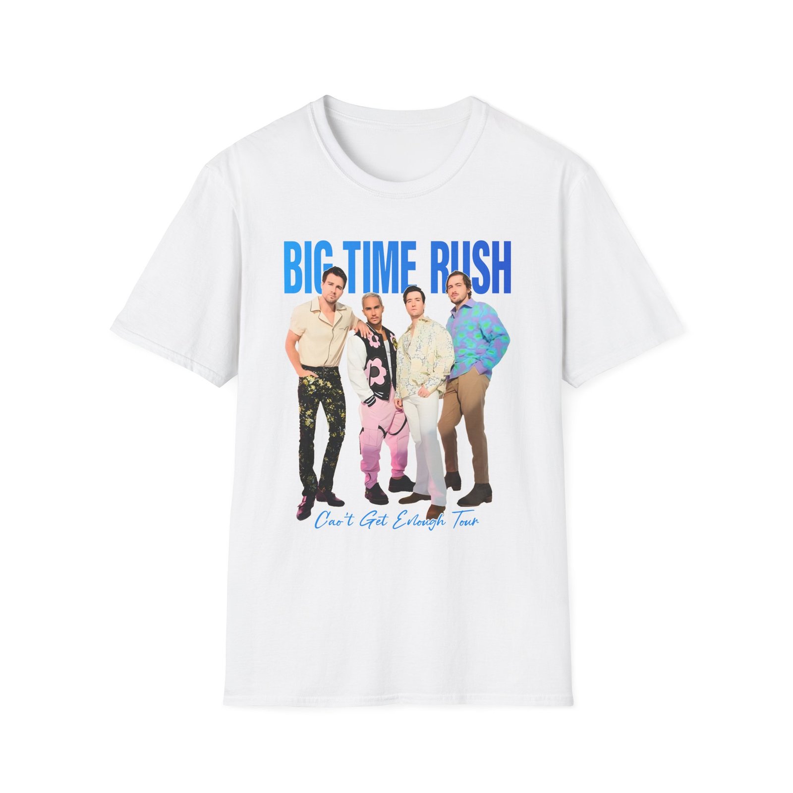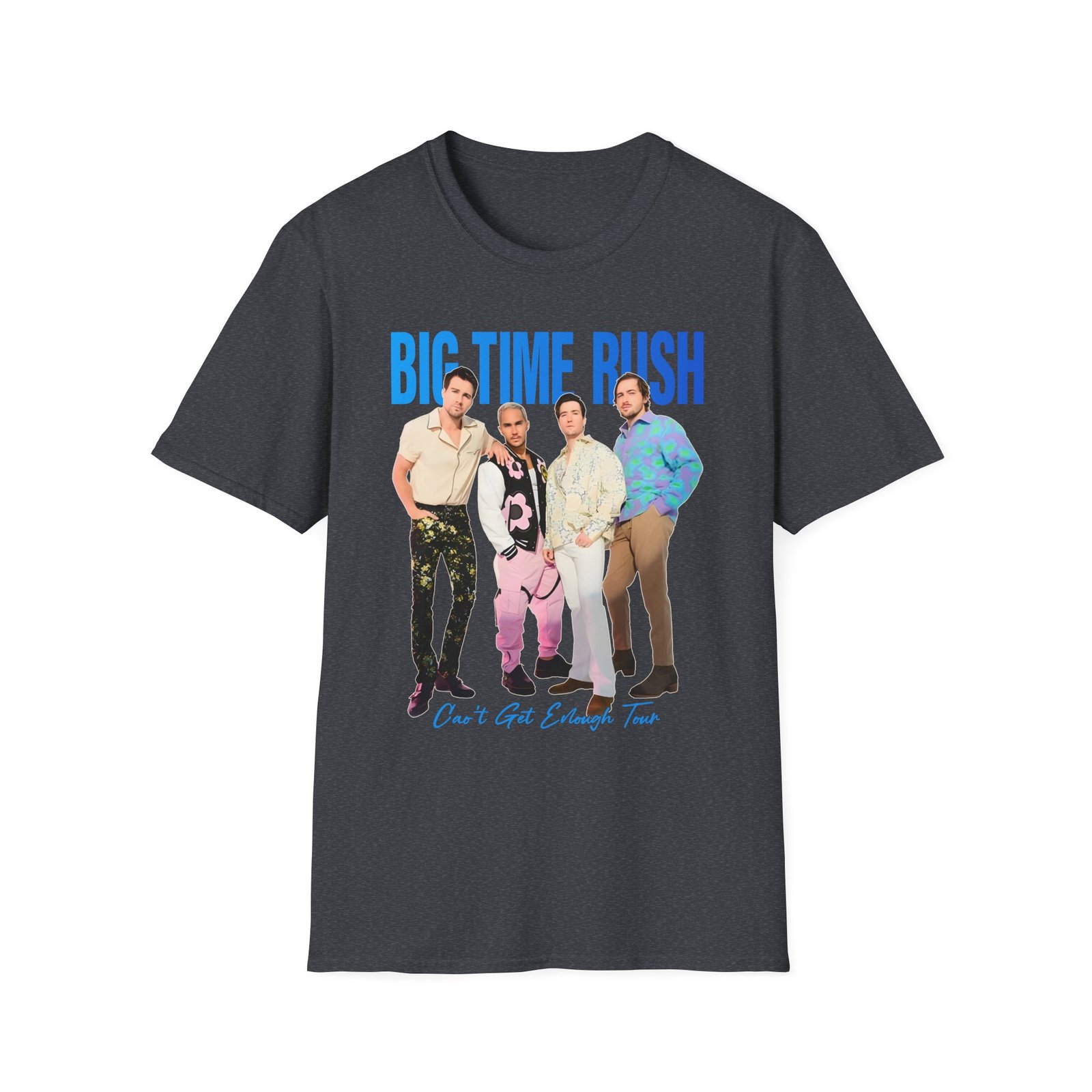 The Big Time Rush Can't Get Enough Tour unisex soft-style t-shirt puts a new spin on casual comfort. Made from very soft materials, this tee is 100% cotton for solid colors. Heather colors and sports grey include polyester. The shoulders have twill tape for improved durability. There are no side seams. The collar is made with ribbed knitting to prevent curling damage.