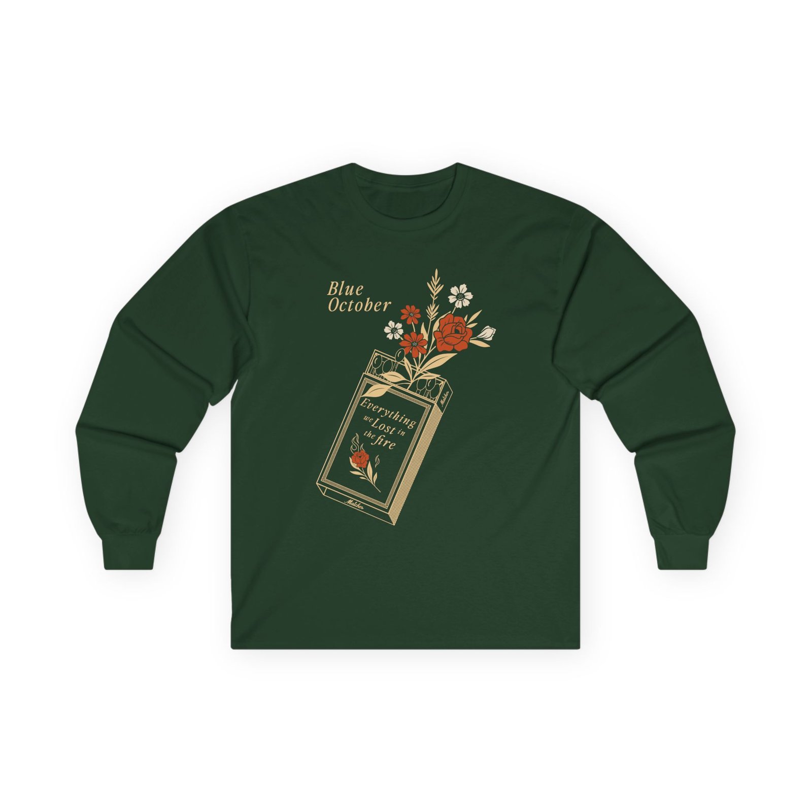 A bit more formal than a standard-issue t-shirt, the Blue October Everything We Lost in the Fire ultra cotton long sleeve tee is a clear comfort winner. The sleeves also act as a nice frame. There are no side seams. The shoulders are taped for improved durability. This makes for a good fitting around the shoulders and neck. The cotton used for these shirts is environmentally friendly.