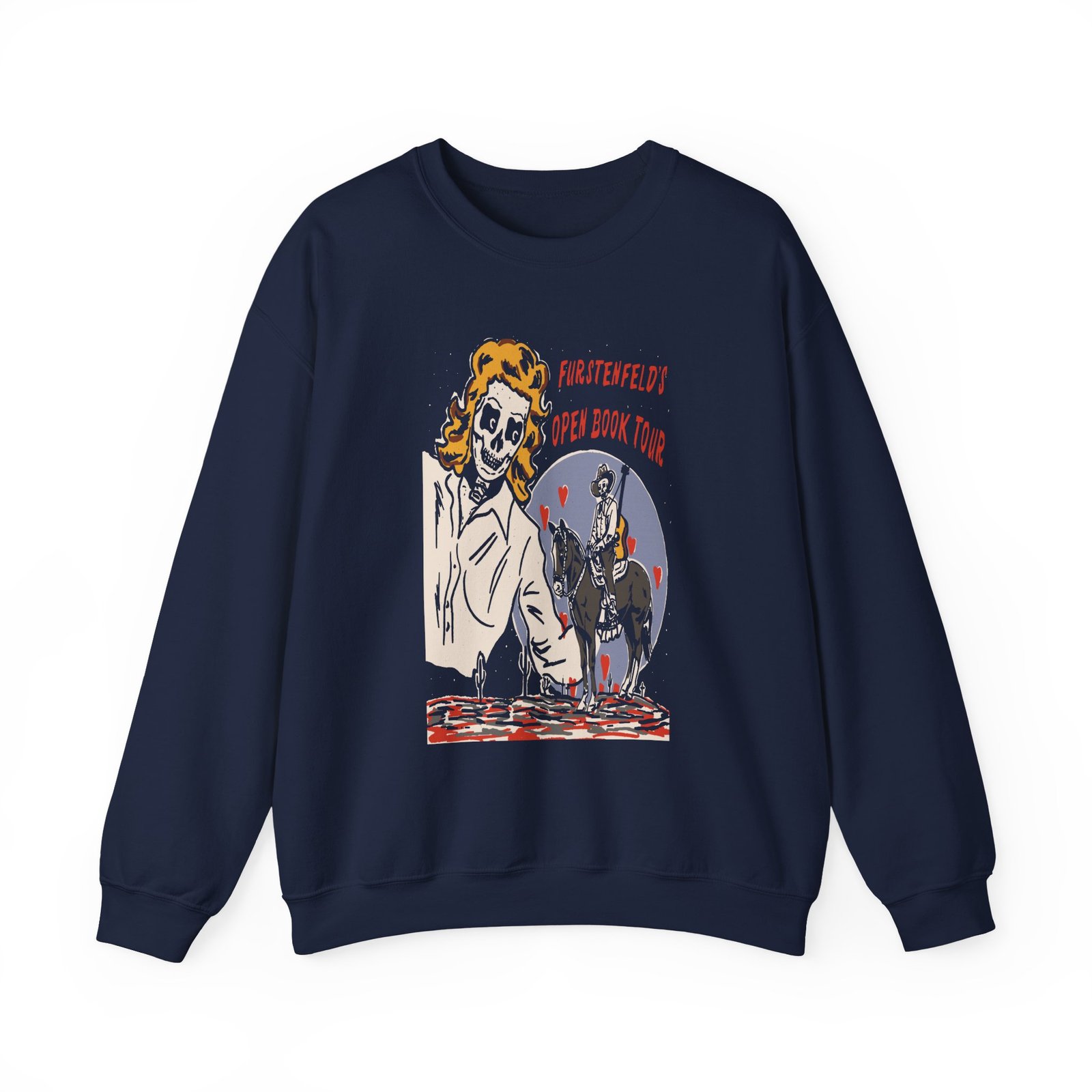Ideal for any situation, a Blue October Open Book Skeleton Cowboy unisex heavy blend crewneck sweatshirt is pure comfort. These garments are made from polyester and cotton. This combination helps designs come out looking fresh and beautiful. The collar is ribbed knit, so it retains its shape even after washing. There are no itchy side seams on these sweaters.