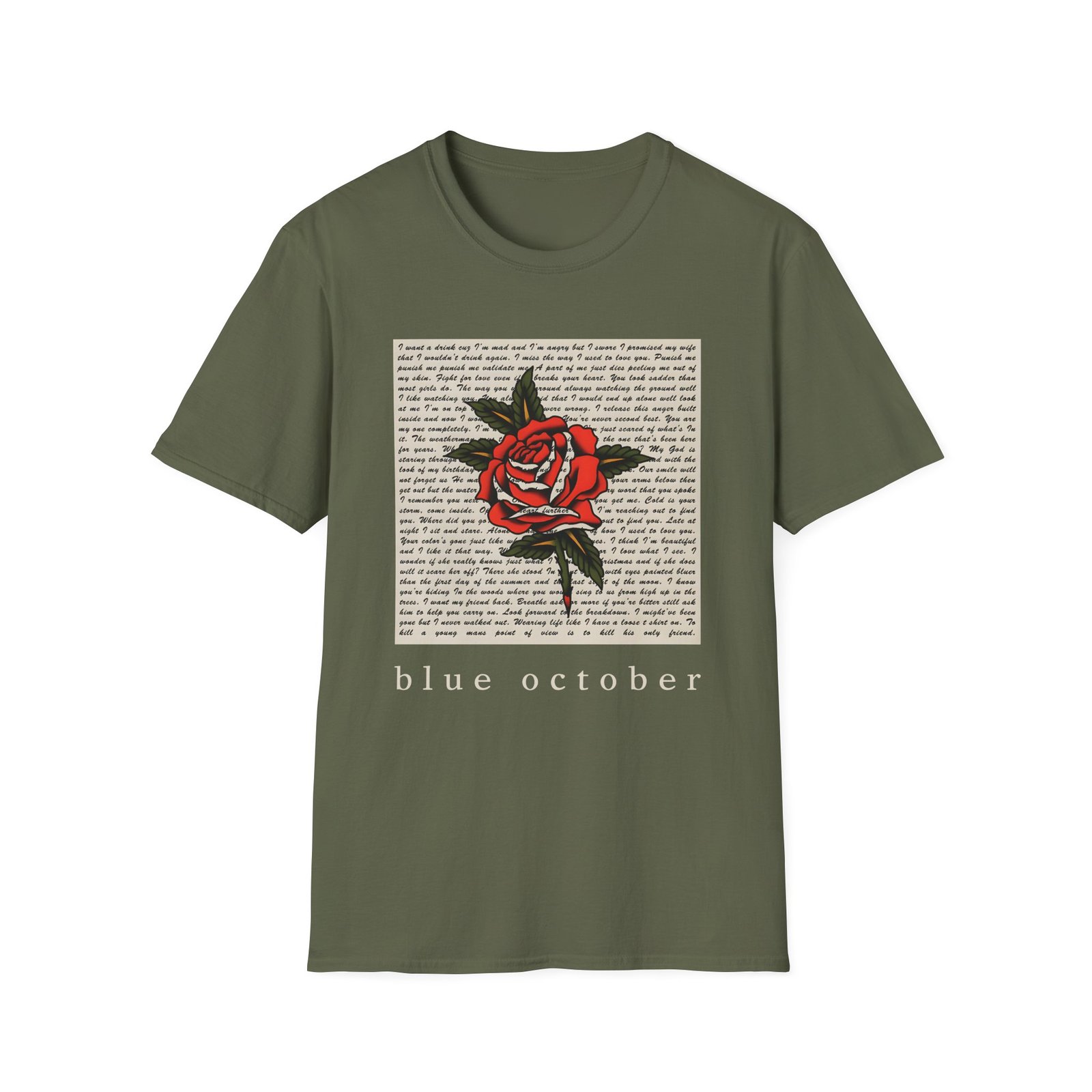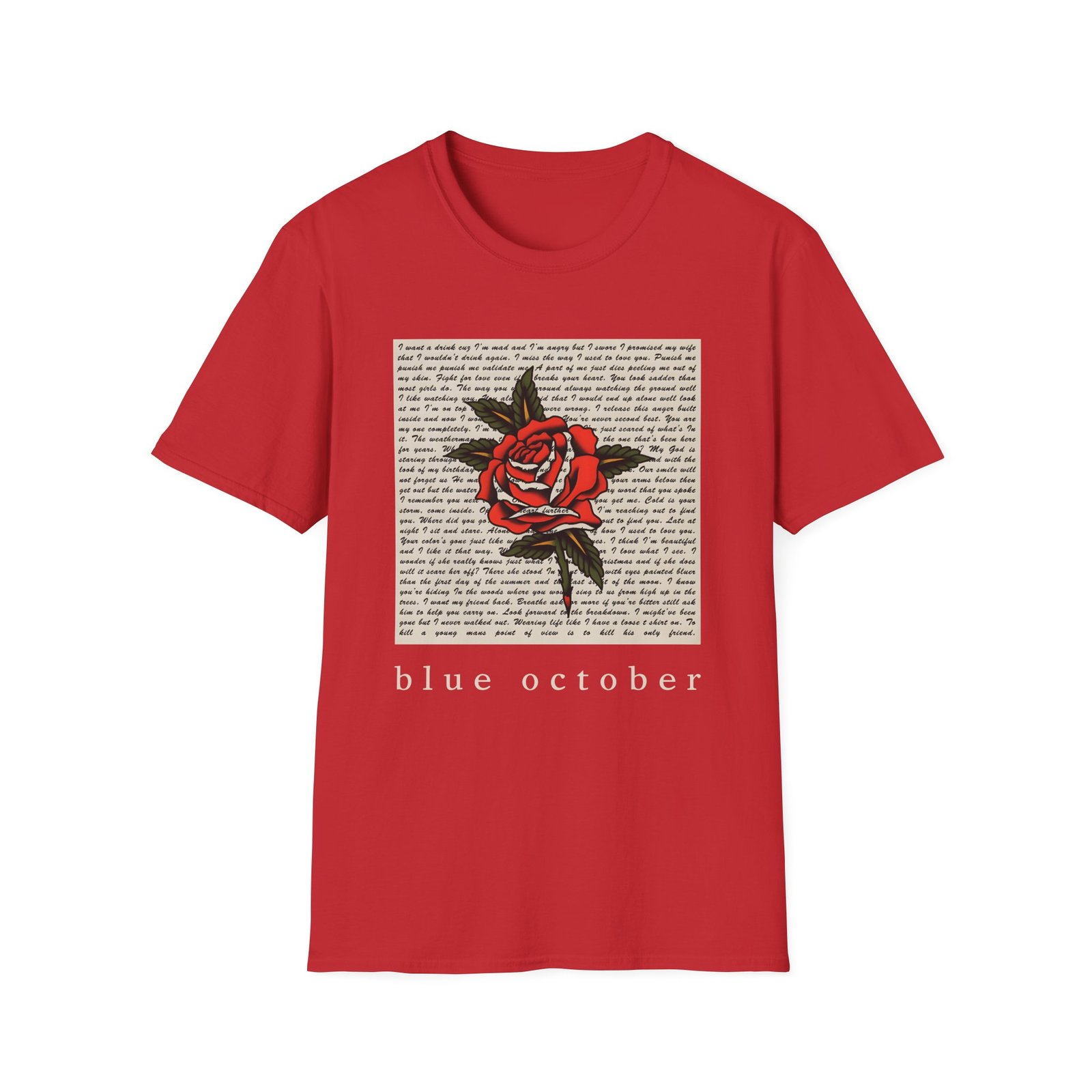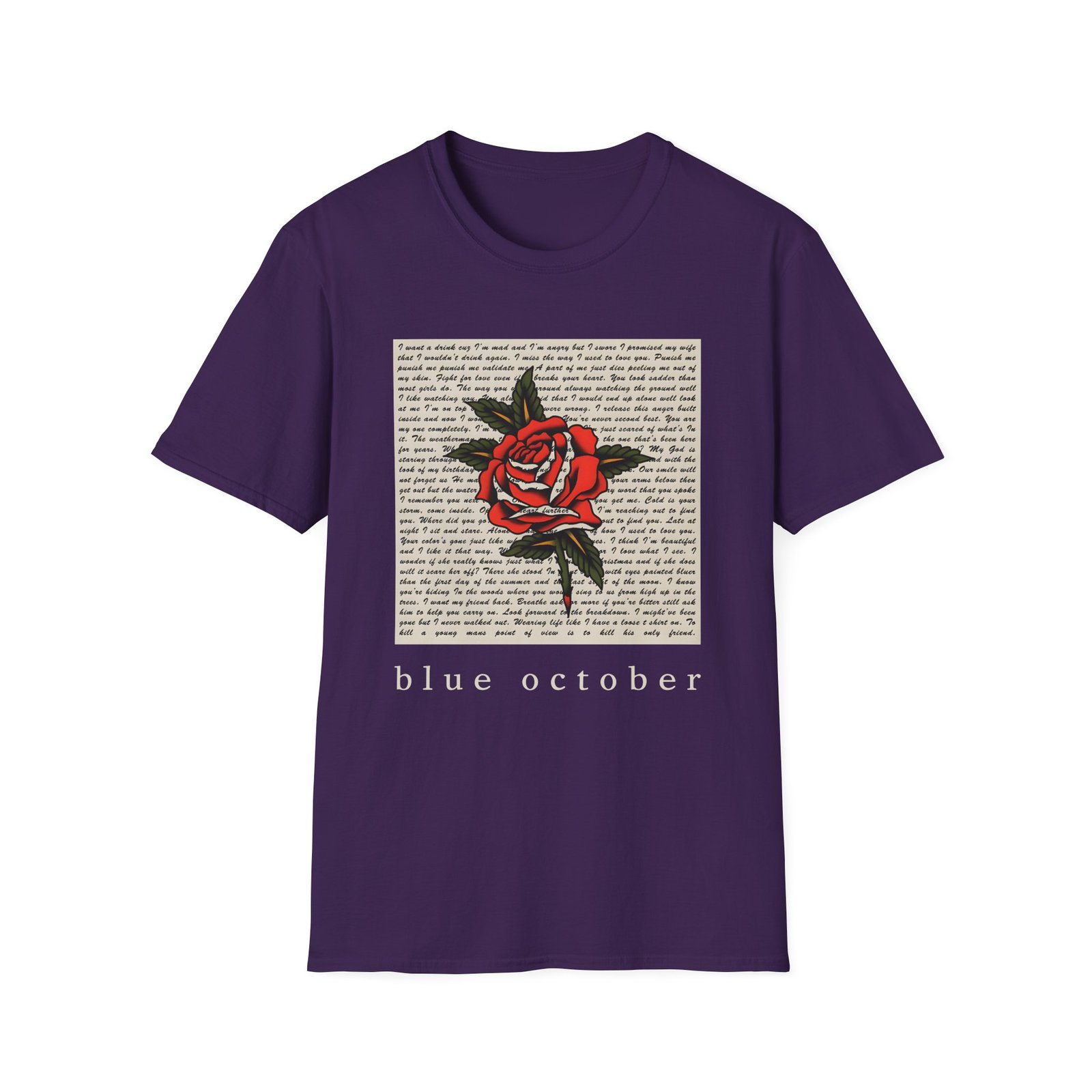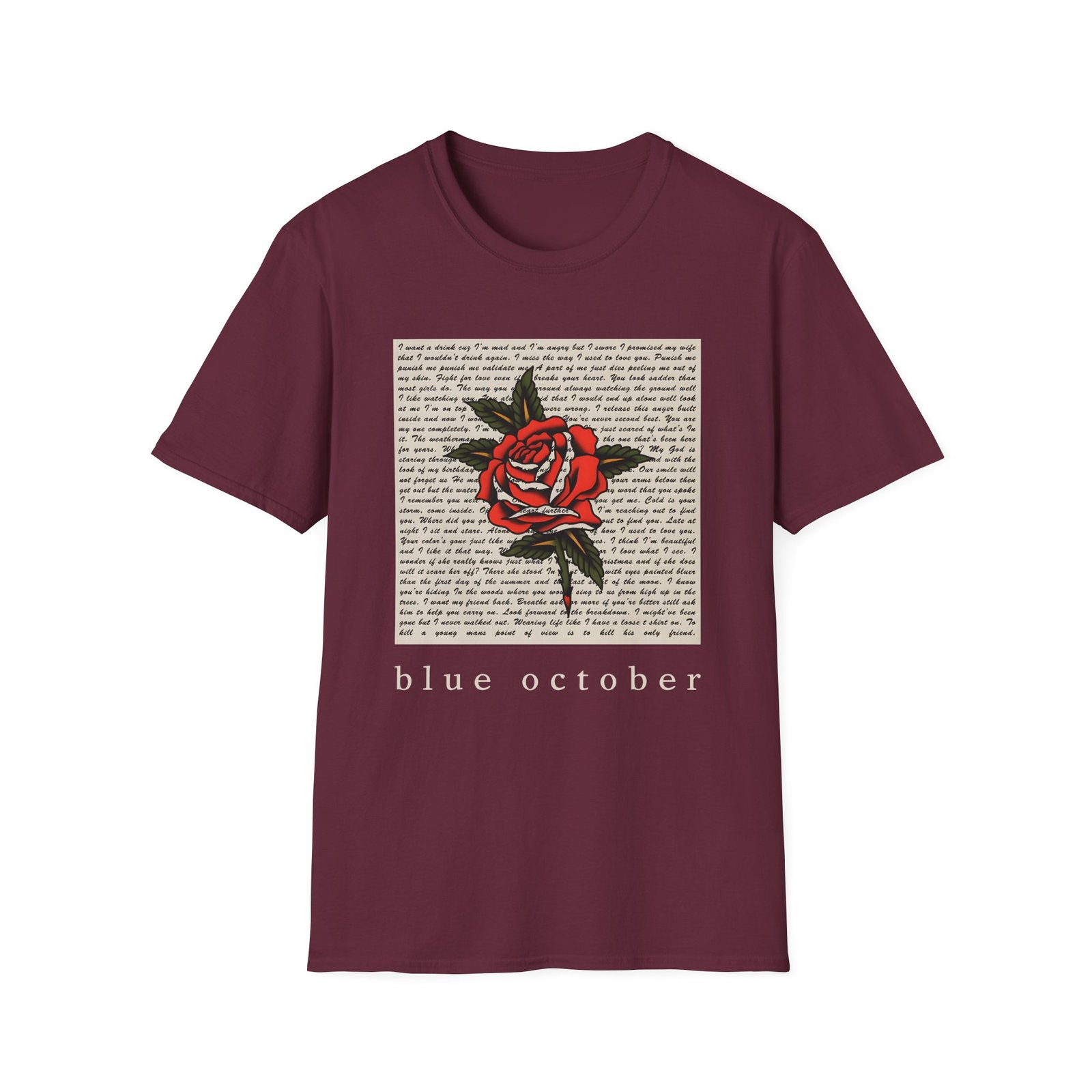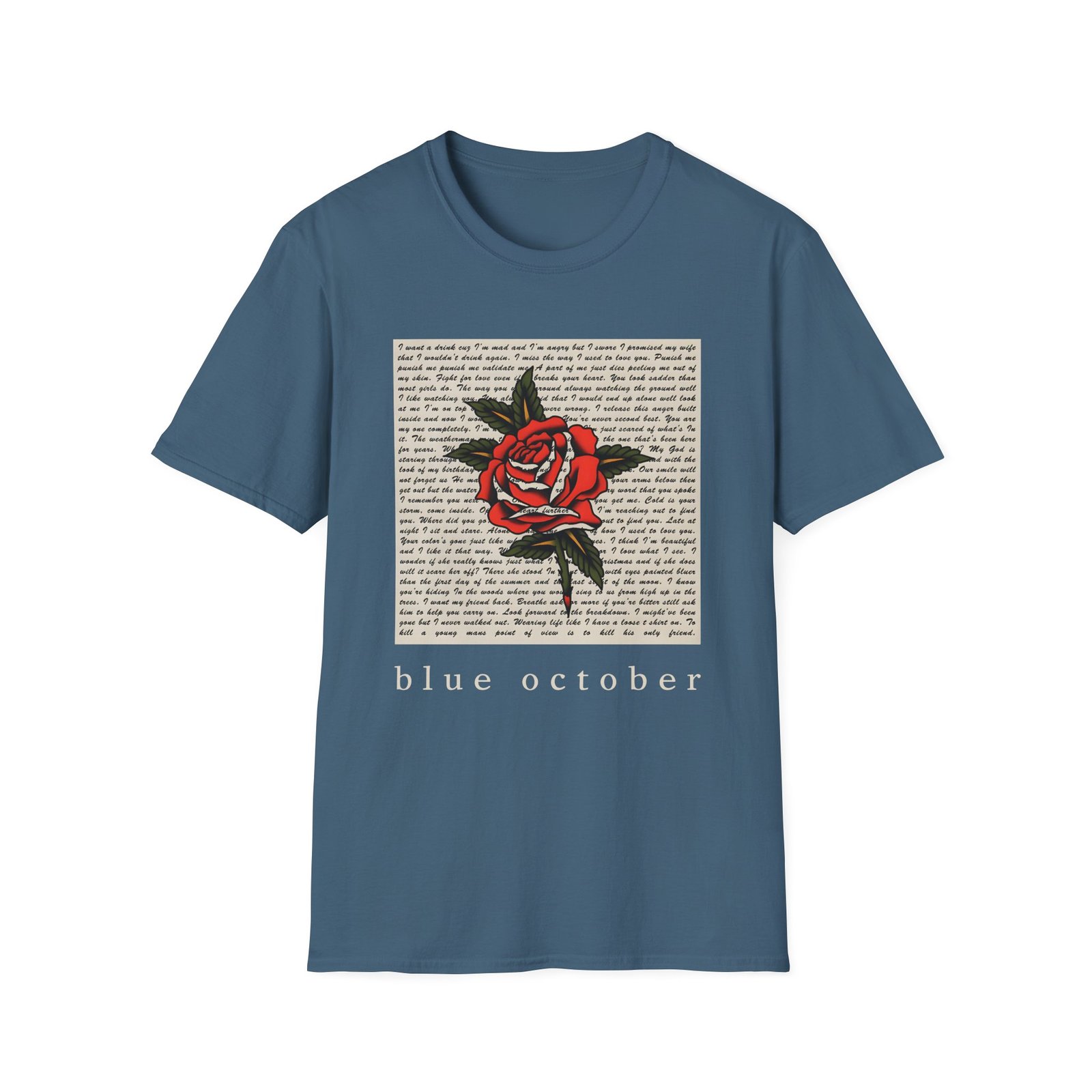 The Blue October Rose Lyric unisex soft-style t-shirt puts a new spin on casual comfort. Made from very soft materials, this tee is 100% cotton for solid colors. Heather colors and sports grey include polyester. The shoulders have twill tape for improved durability. There are no side seams. The collar is made with ribbed knitting to prevent curling damage.