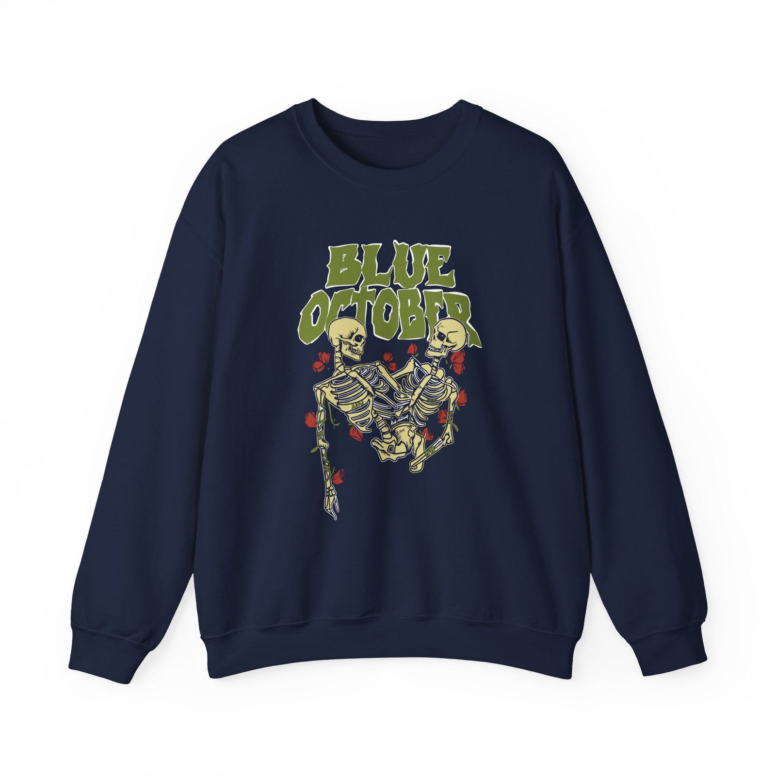 Ideal for any situation, a Blue October Skeleton Buddies unisex heavy blend crewneck sweatshirt is pure comfort. These garments are made from polyester and cotton. This combination helps designs come out looking fresh and beautiful. The collar is ribbed knit, so it retains its shape even after washing. There are no itchy side seams on these sweaters.