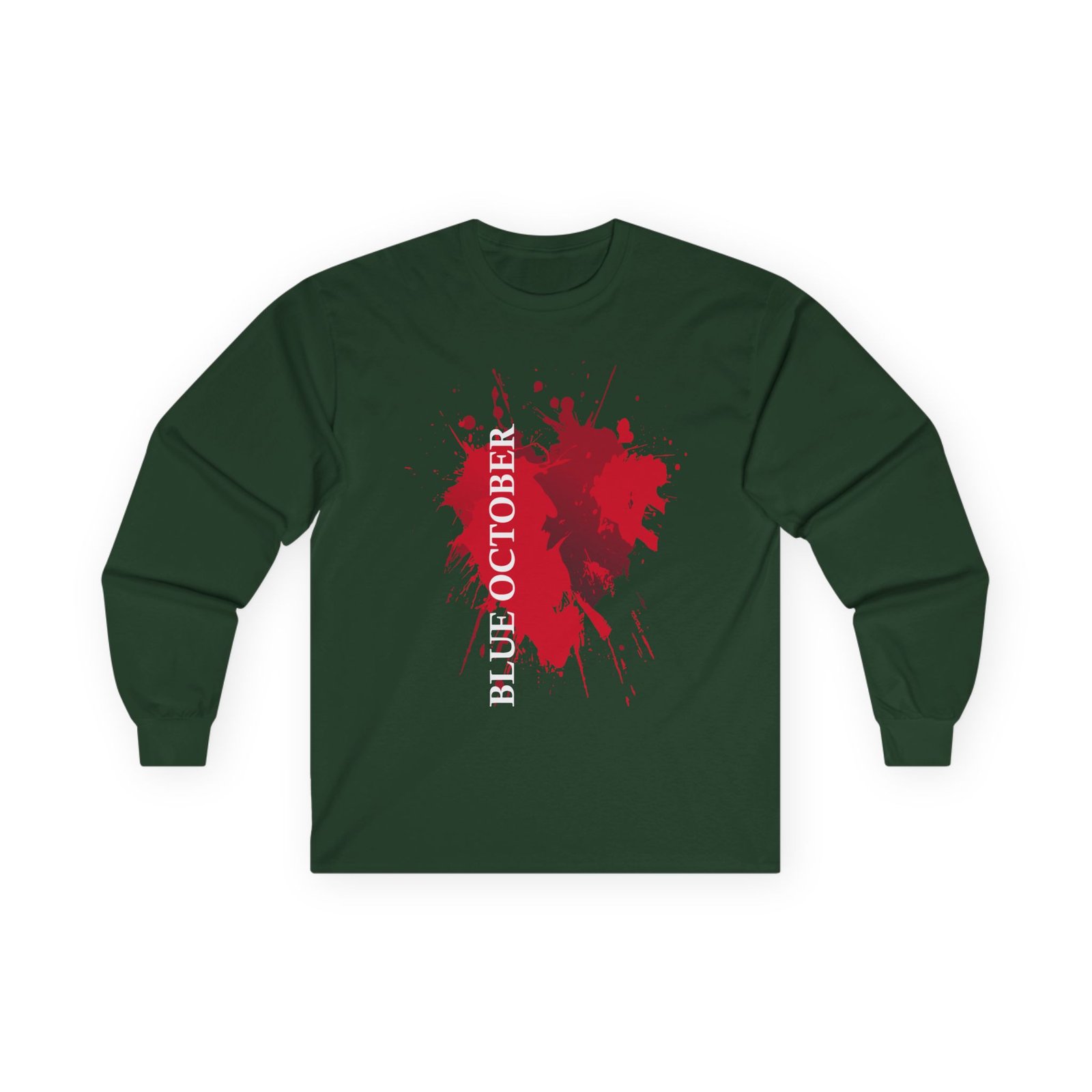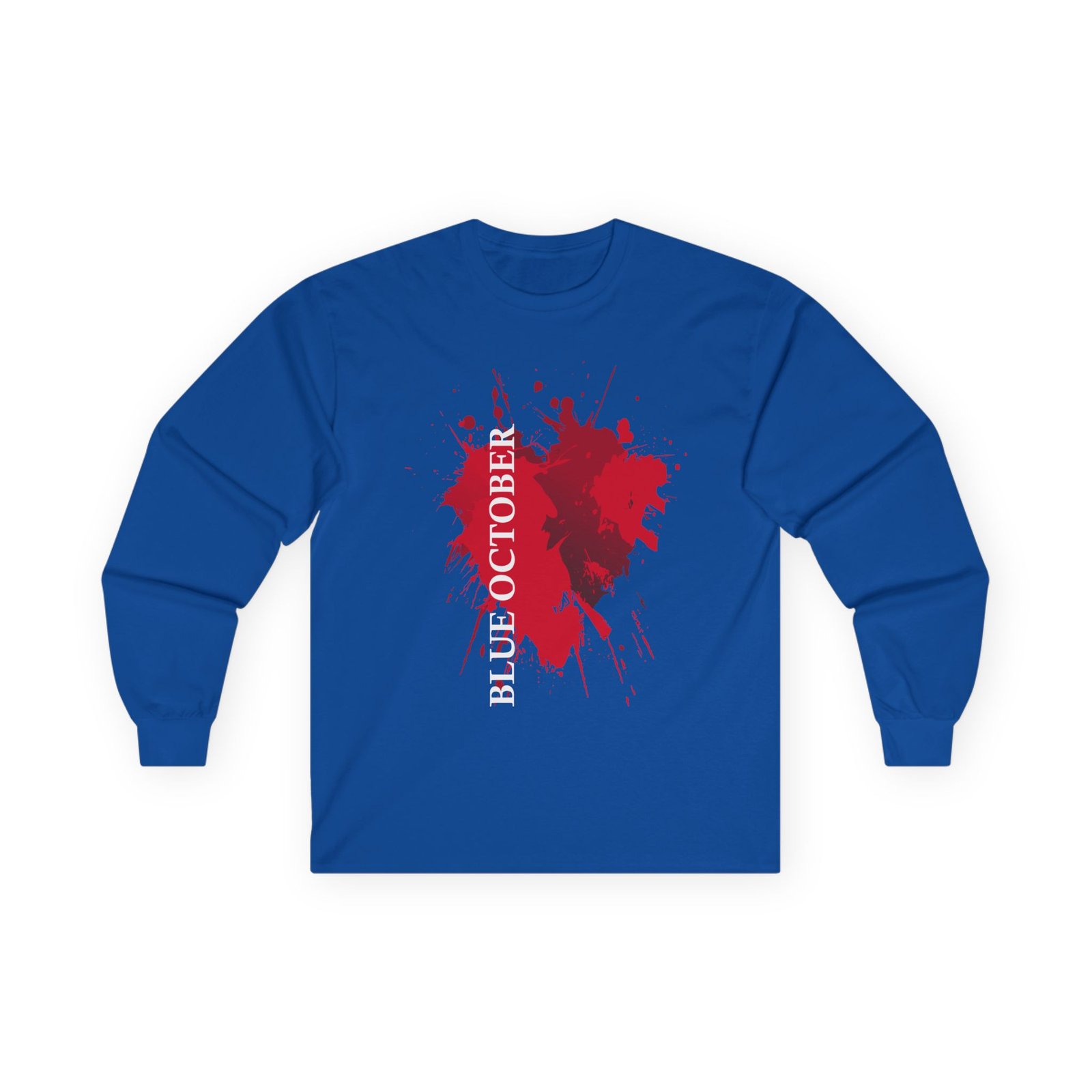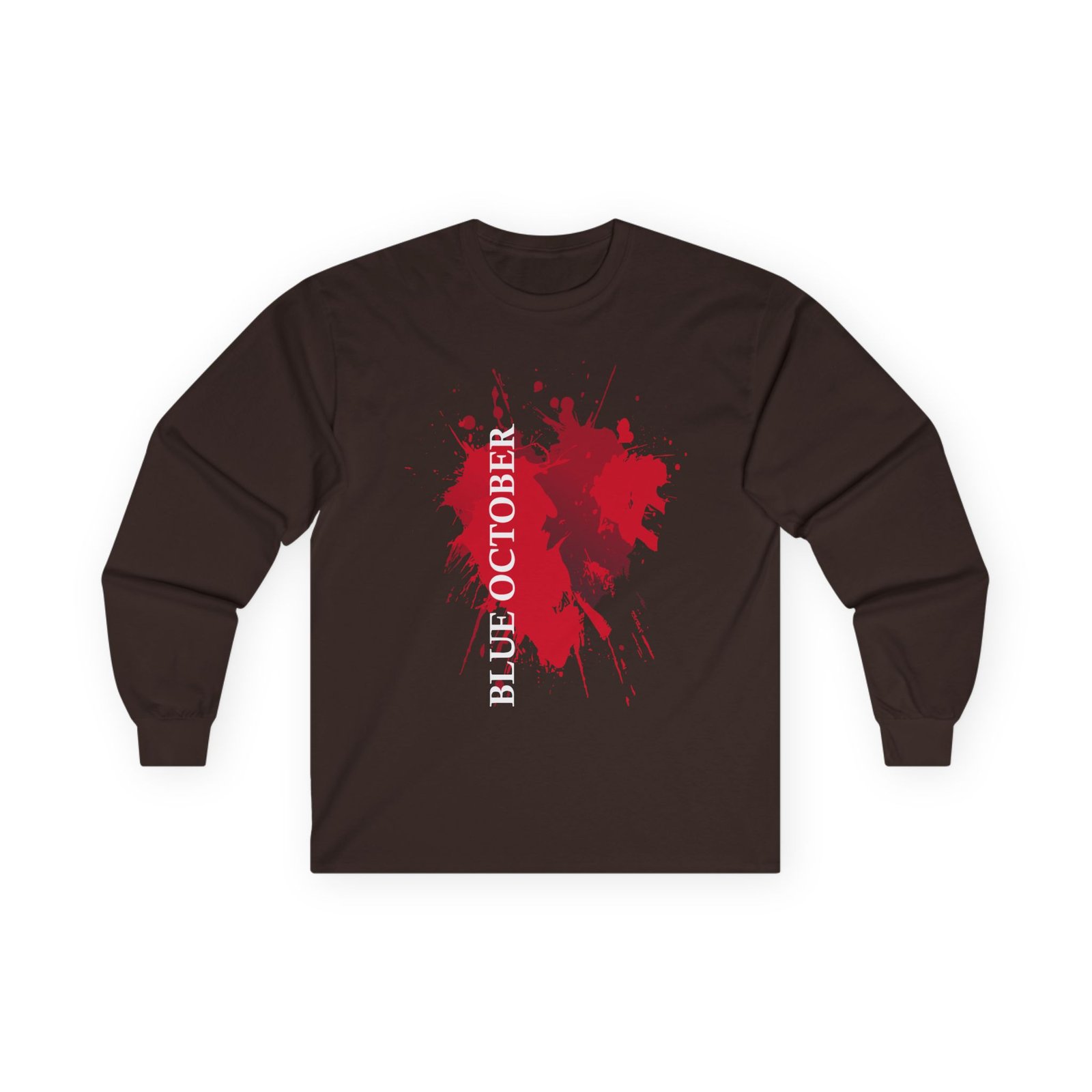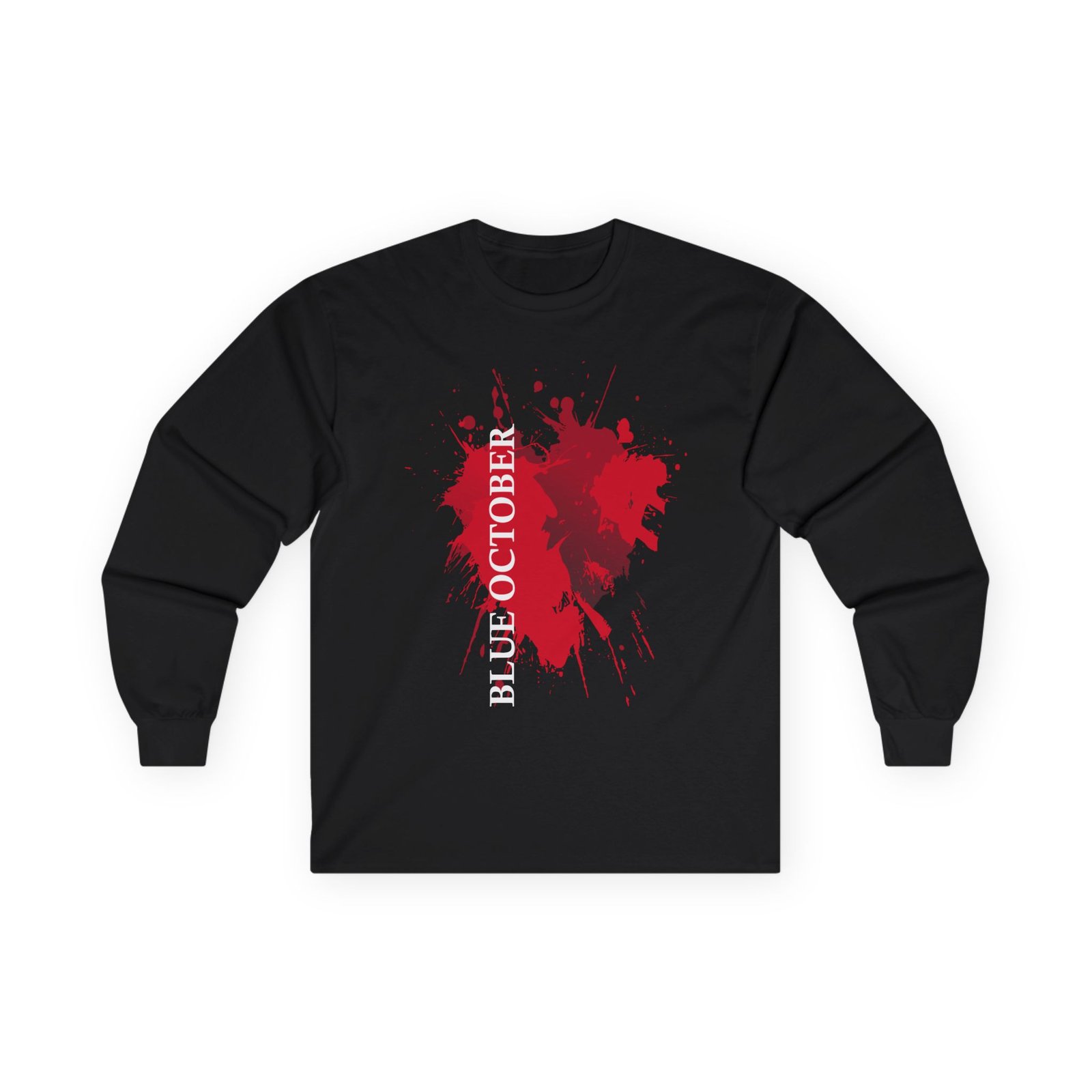 A bit more formal than a standard-issue t-shirt, the Blue October Splatter Heart ultra cotton long sleeve tee is a clear comfort winner. The sleeves also act as a nice frame. There are no side seams. The shoulders are taped for improved durability. This makes for a good fitting around the shoulders and neck. The cotton used for these shirts is environmentally friendly.
