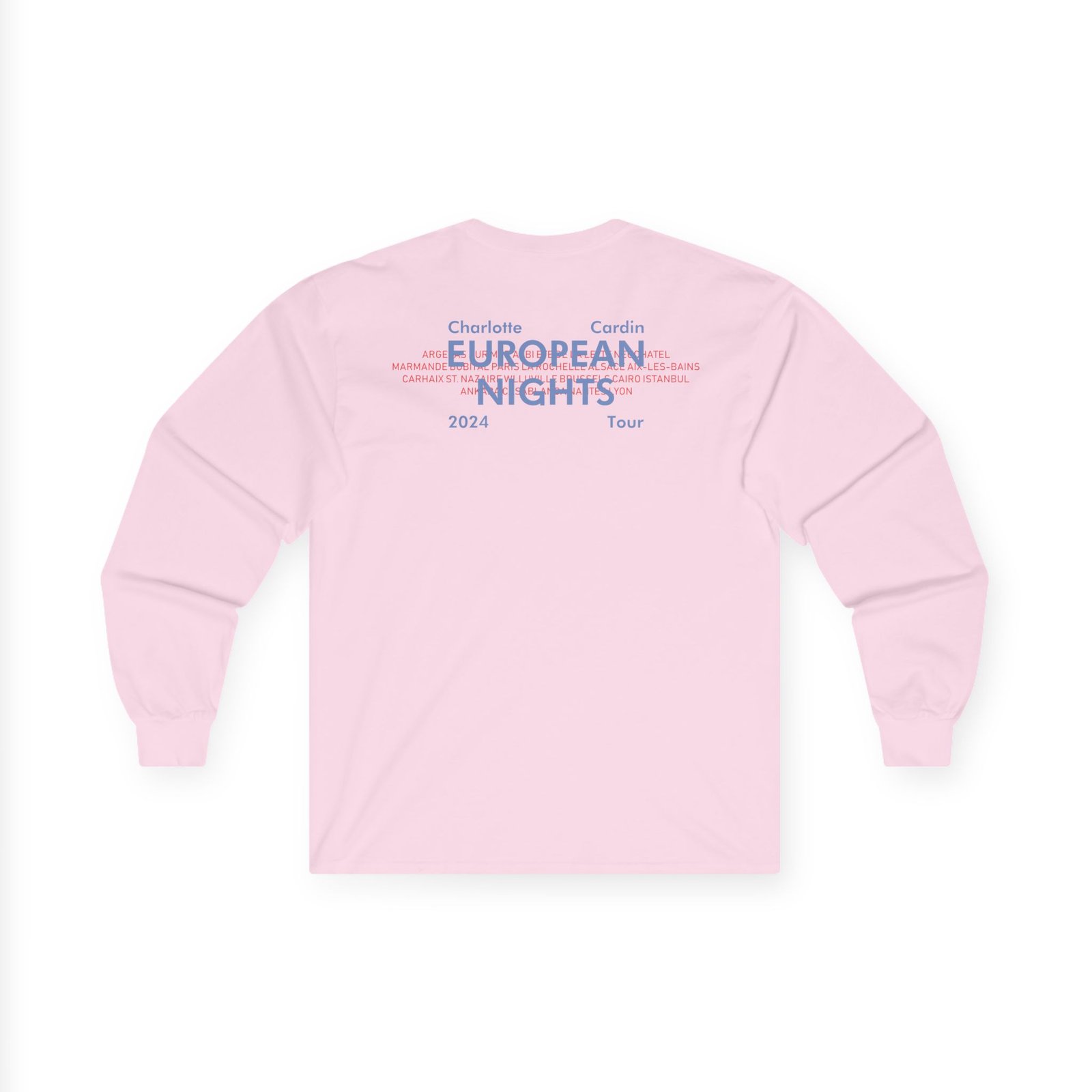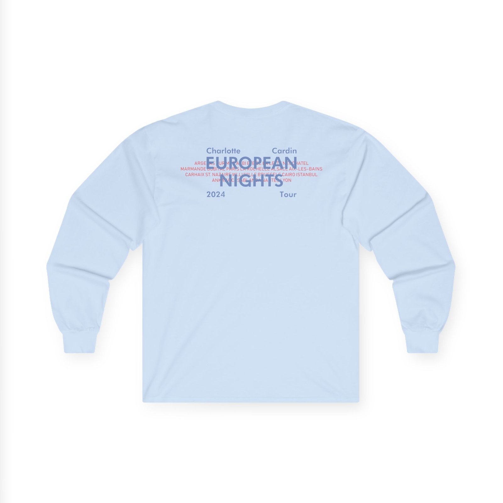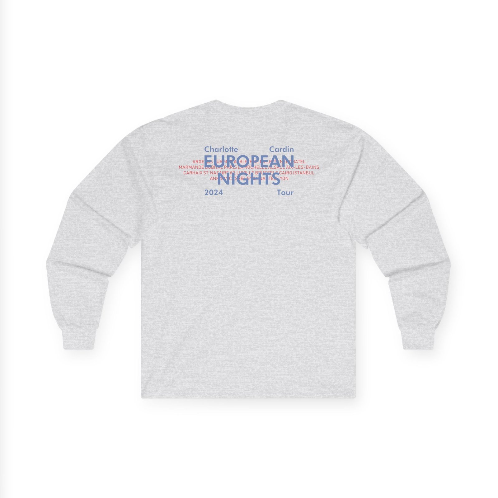 A bit more formal than a standard-issue t-shirt, the Charlotte Cardin Euro Nights Tour ultra cotton long sleeve tee is a clear comfort winner. The sleeves also act as a nice frame. There are no side seams. The shoulders are taped for improved durability. This makes for a good fitting around the shoulders and neck. The cotton used for these shirts is environmentally friendly.