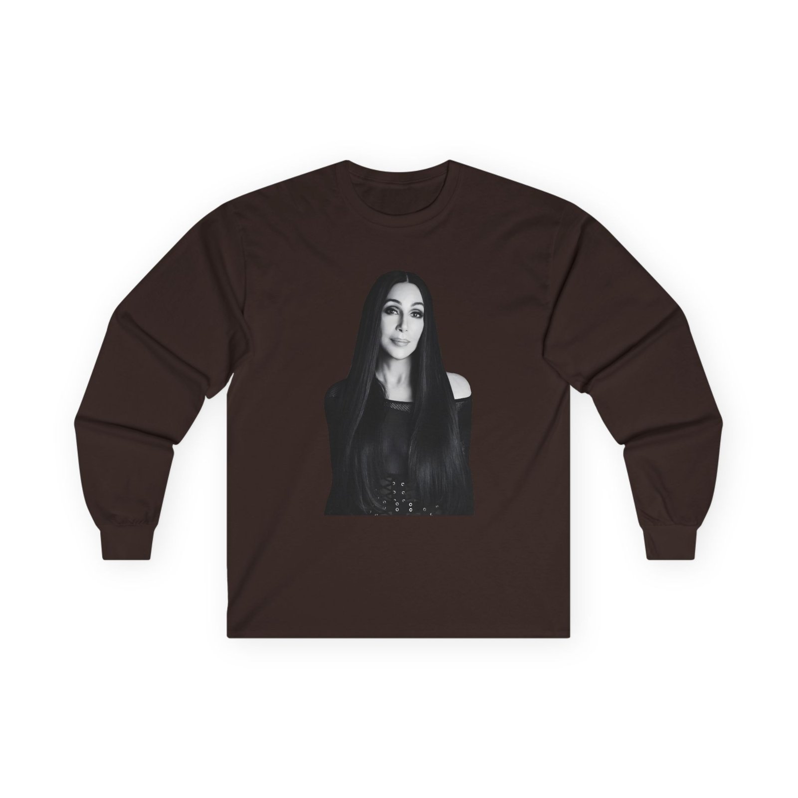 A bit more formal than a standard-issue t-shirt, the Cher Portrait Photo ultra cotton long sleeve tee is a clear comfort winner. The sleeves also act as a nice frame. There are no side seams. The shoulders are taped for improved durability. This makes for a good fitting around the shoulders and neck. The cotton used for these shirts is environmentally friendly.