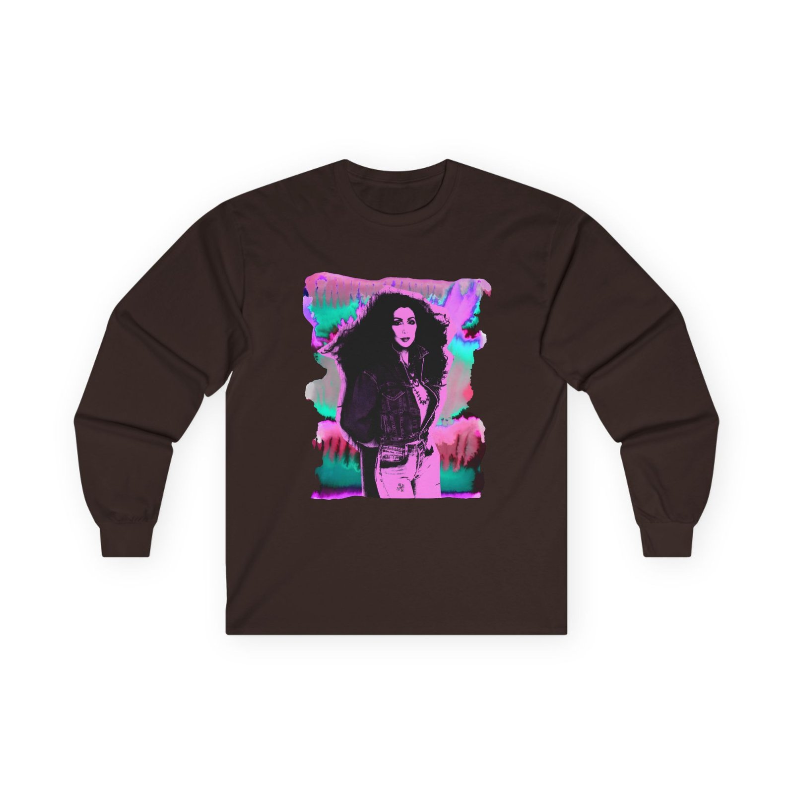 A bit more formal than a standard-issue t-shirt, the Cher Psychedelic Distressed ultra cotton long sleeve tee is a clear comfort winner. The sleeves also act as a nice frame. There are no side seams. The shoulders are taped for improved durability. This makes for a good fitting around the shoulders and neck. The cotton used for these shirts is environmentally friendly.
