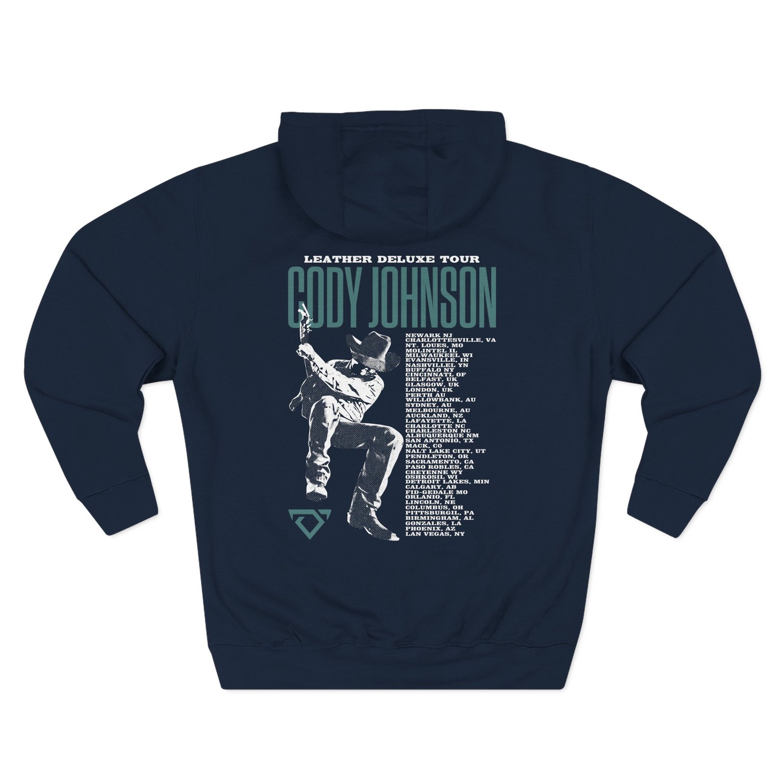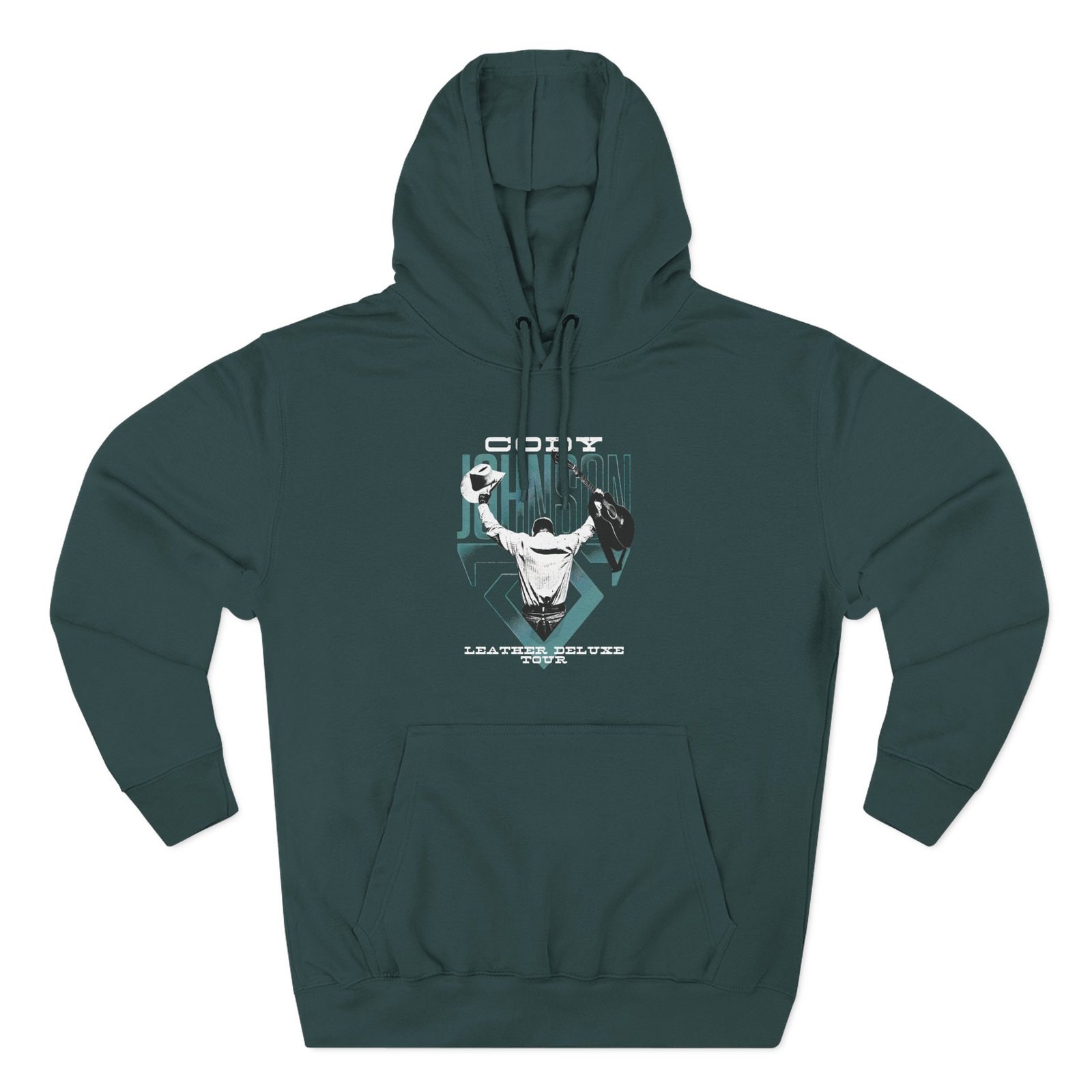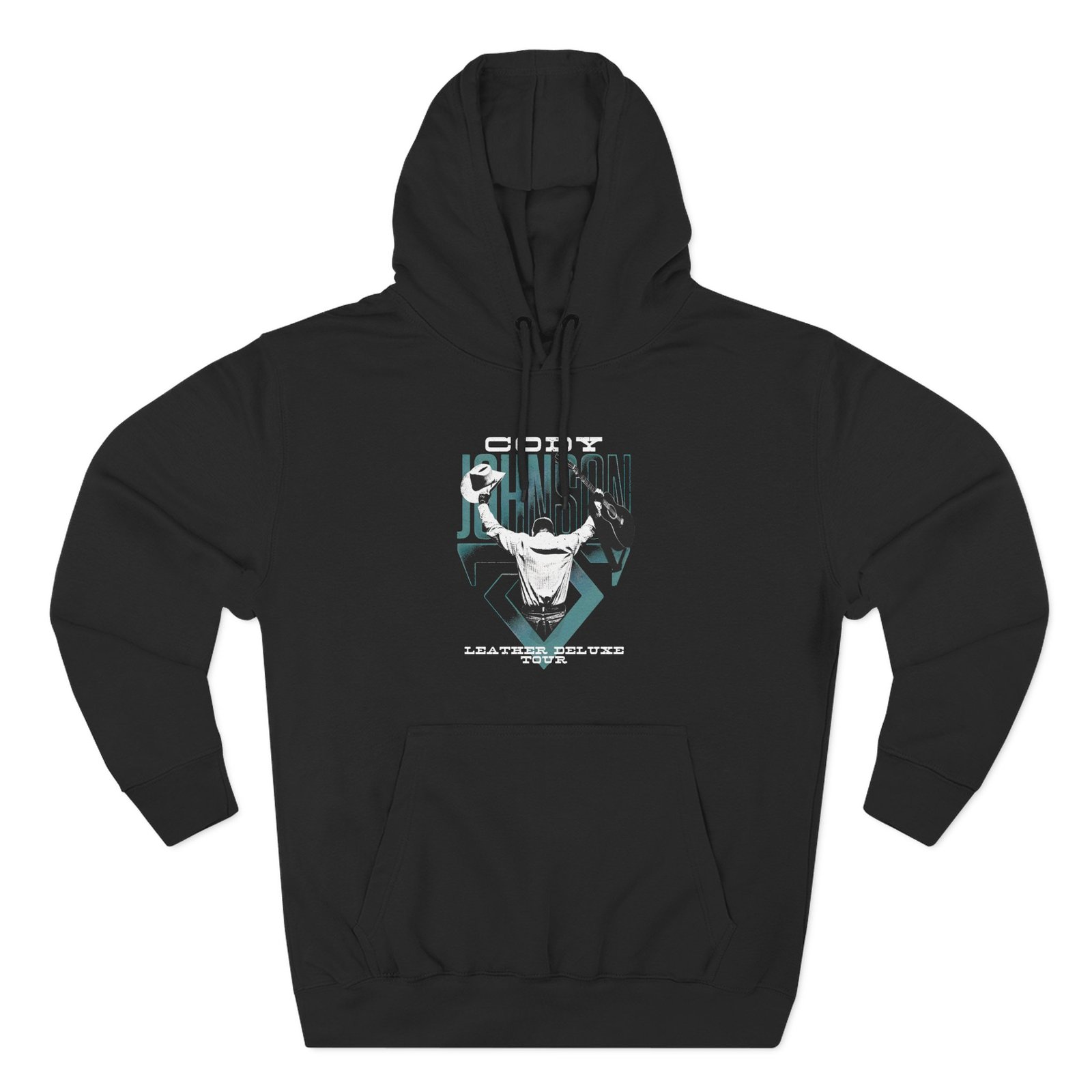 Beat the cold with this Cody Johnson Leather Deluxe Photo Tour premium pullover hoodie that’s just the right layer of warm and cozy. Made with three-panel fleece lining, this pullover is double stitched for durability and roomy. Pick one in your favorite color to match your style.