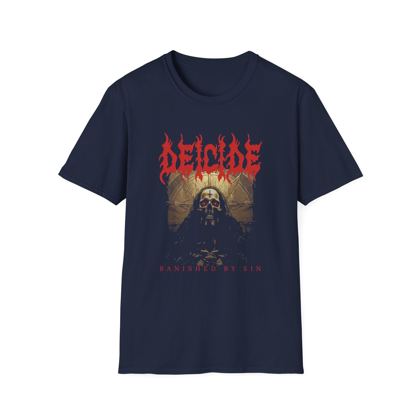 The Deicide Banished By Sin unisex soft-style t-shirt puts a new spin on casual comfort. Made from very soft materials, this tee is 100% cotton for solid colors. Heather colors and sports grey include polyester. The shoulders have twill tape for improved durability. There are no side seams. The collar is made with ribbed knitting to prevent curling damage.