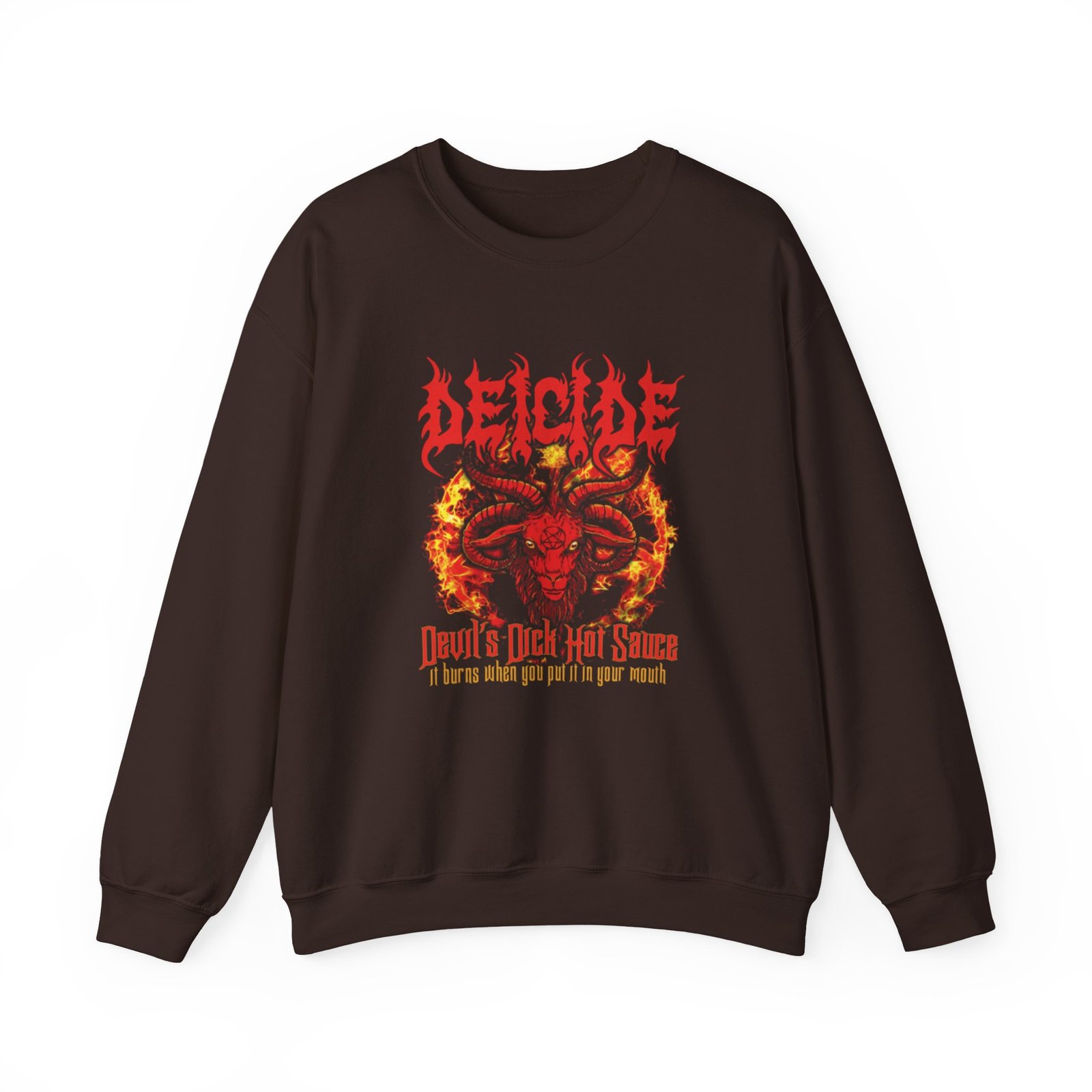 Ideal for any situation, a Deicide Devil's Dick Hot Sauce unisex heavy blend crewneck sweatshirt is pure comfort. These garments are made from polyester and cotton. This combination helps designs come out looking fresh and beautiful. The collar is ribbed knit, so it retains its shape even after washing. There are no itchy side seams on these sweaters.
