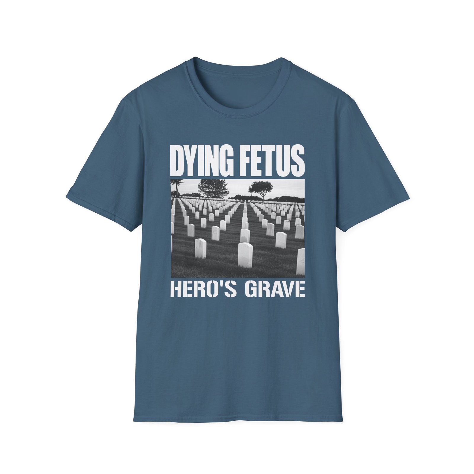 The Dying Fetus Hero's Grave unisex soft-style t-shirt puts a new spin on casual comfort. Made from very soft materials, this tee is 100% cotton for solid colors. Heather colors and sports grey include polyester. The shoulders have twill tape for improved durability. There are no side seams. The collar is made with ribbed knitting to prevent curling damage.
