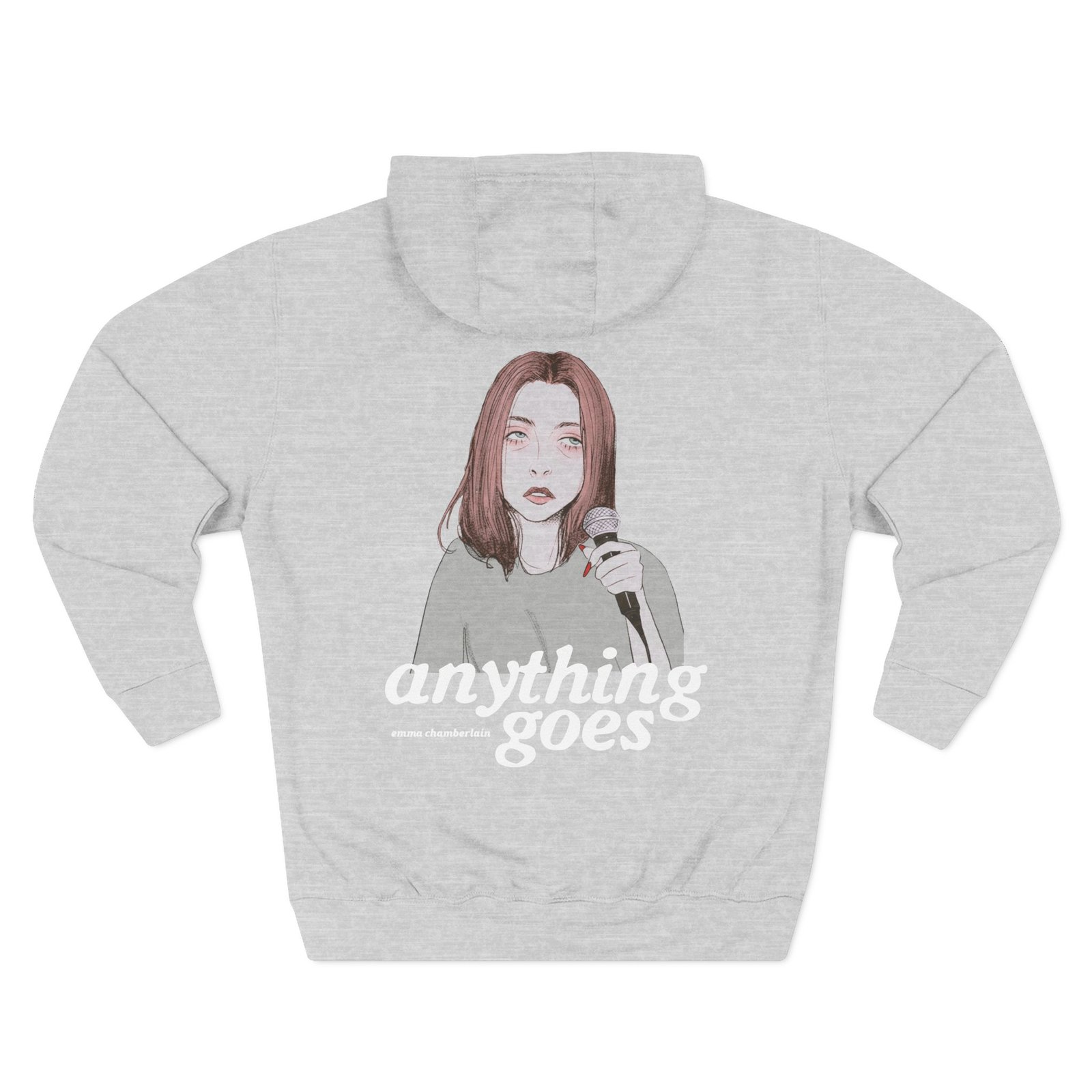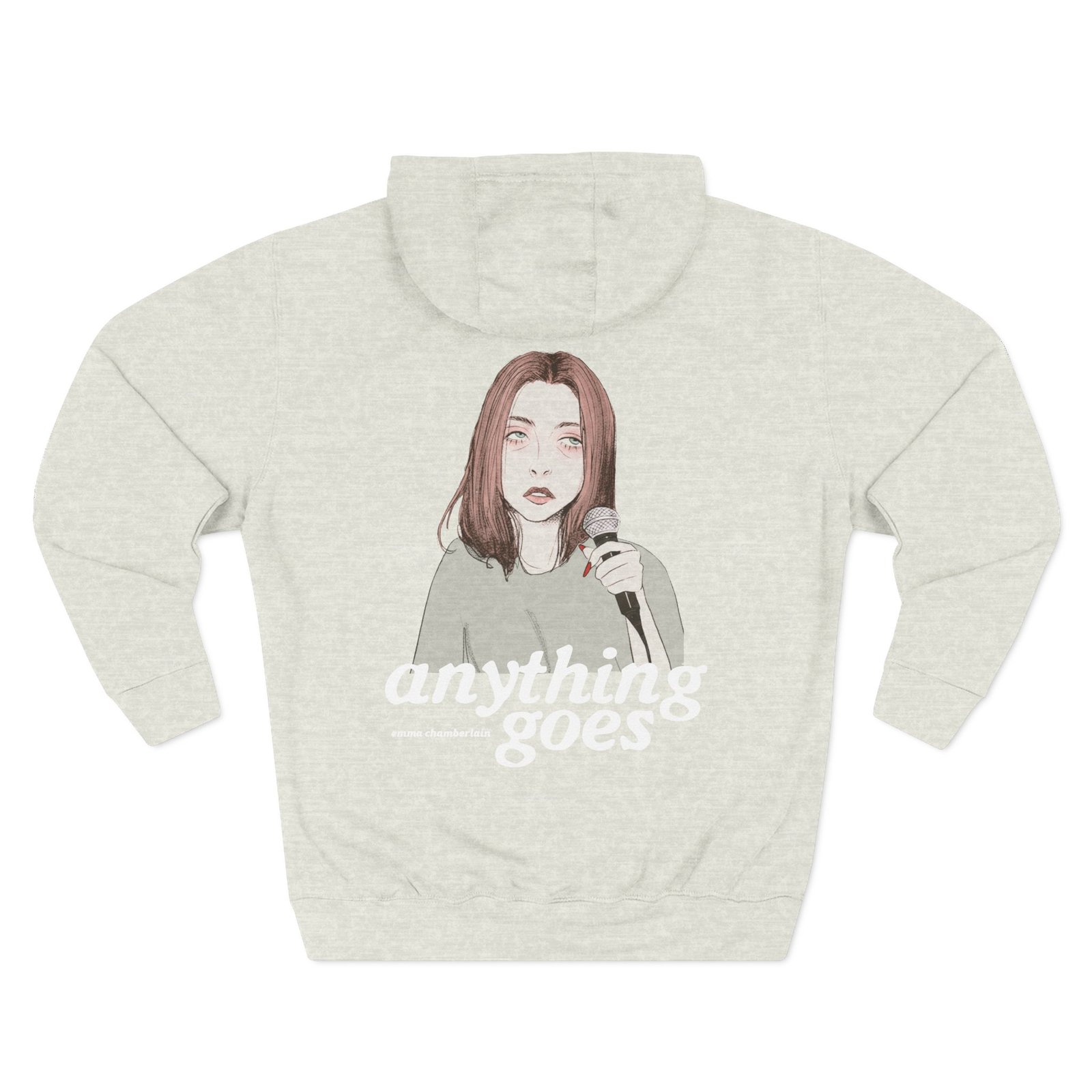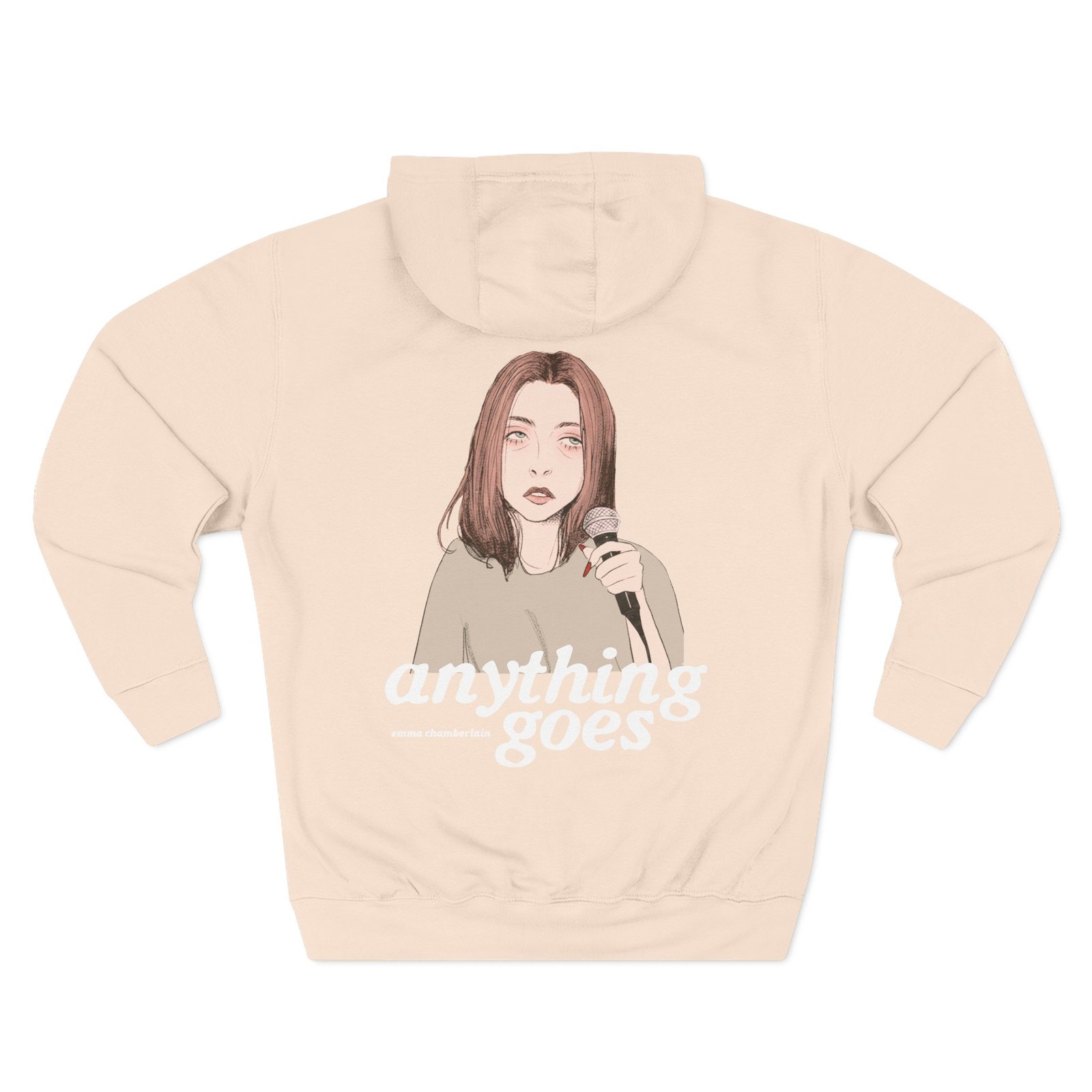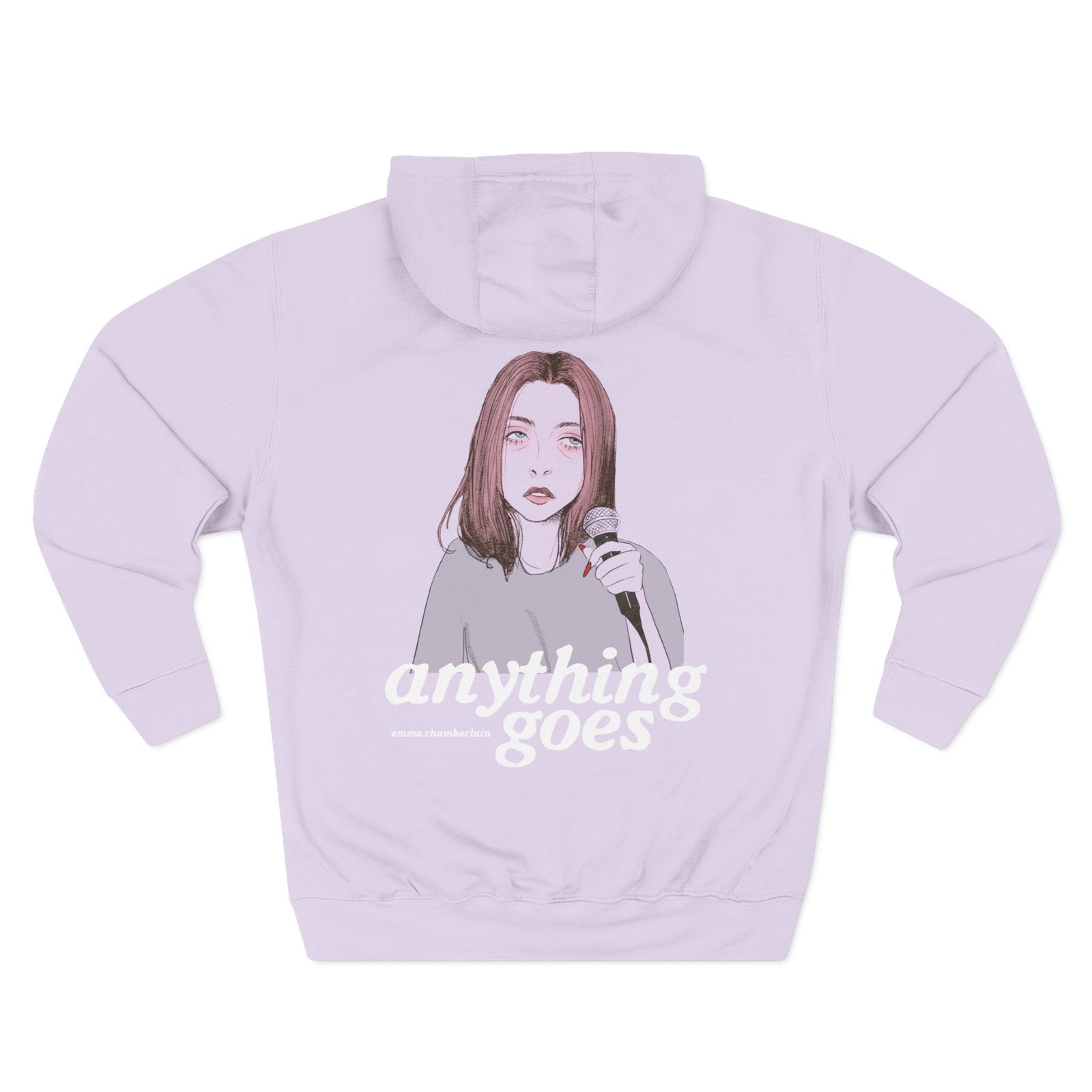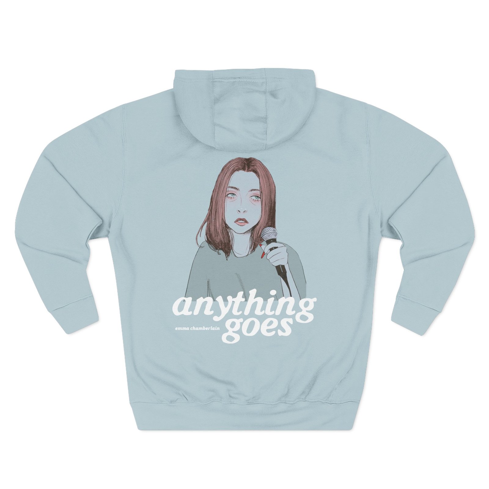 Beat the cold with this Emma Chamberlain Anything Goes premium pullover hoodie that’s just the right layer of warm and cozy. Made with three-panel fleece lining, this pullover is double stitched for durability and roomy. Pick one in your favorite color to match your style.