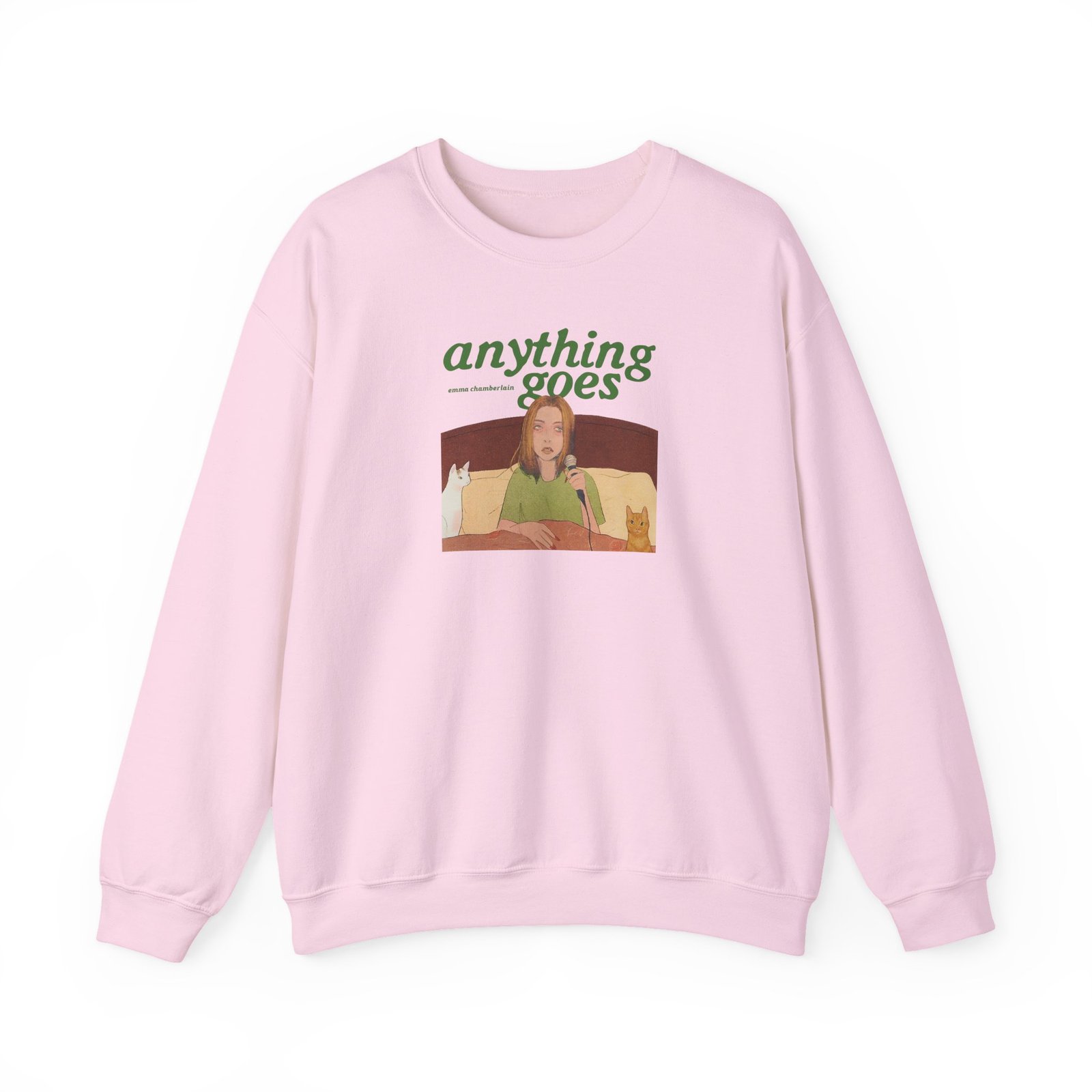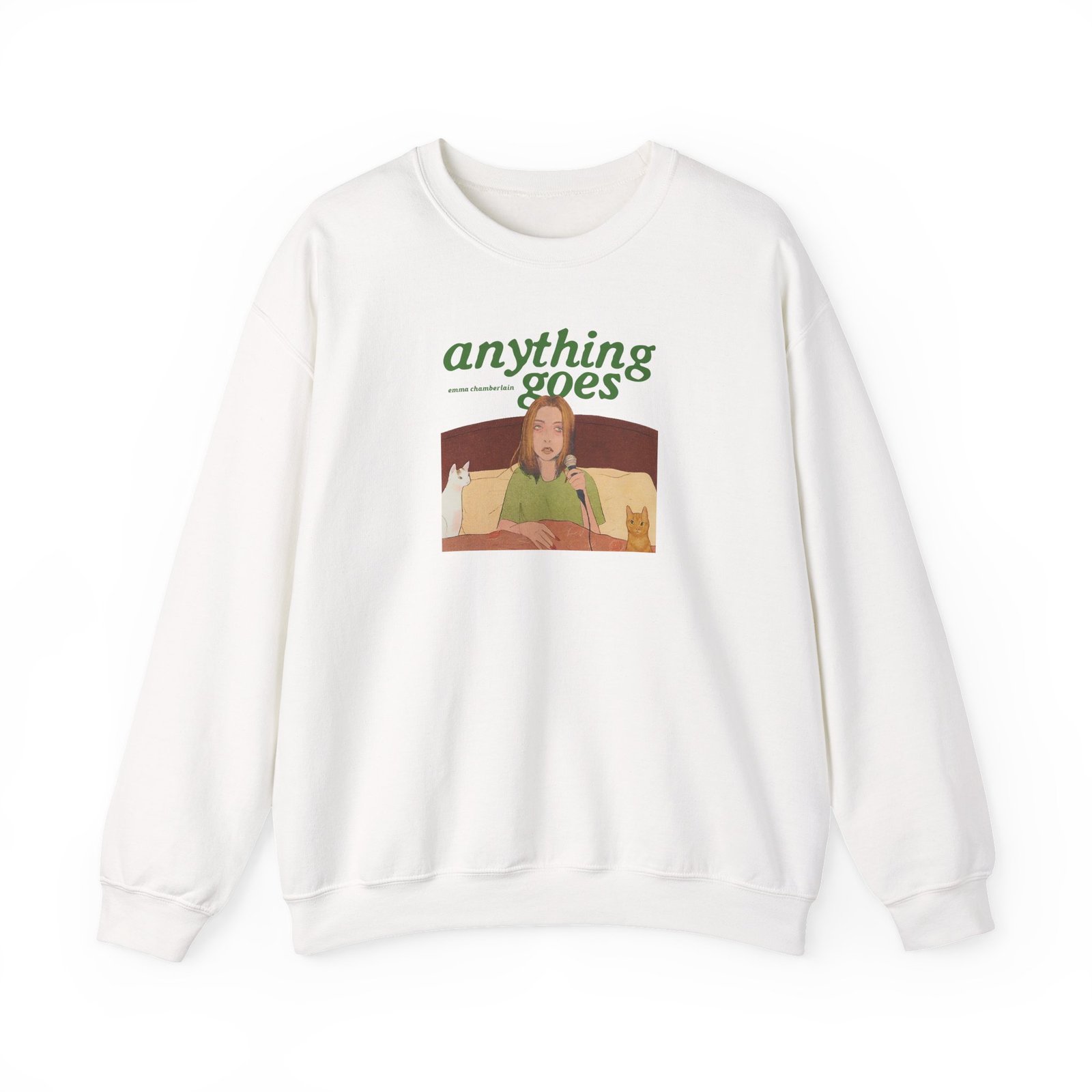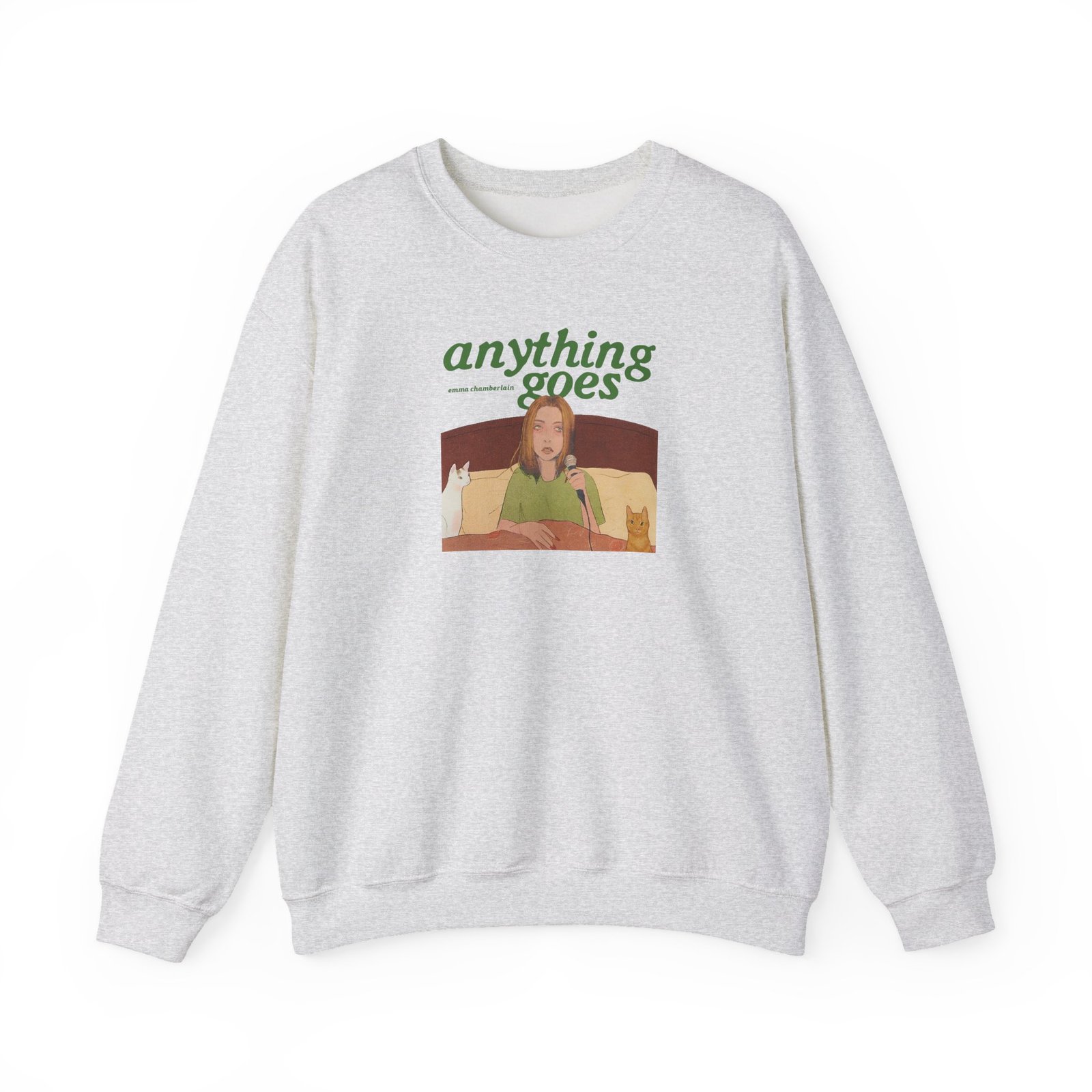 Ideal for any situation, a Emma Chamberlain Anything Goes unisex heavy blend crewneck sweatshirt is pure comfort. These garments are made from polyester and cotton. This combination helps designs come out looking fresh and beautiful. The collar is ribbed knit, so it retains its shape even after washing. There are no itchy side seams on these sweaters.