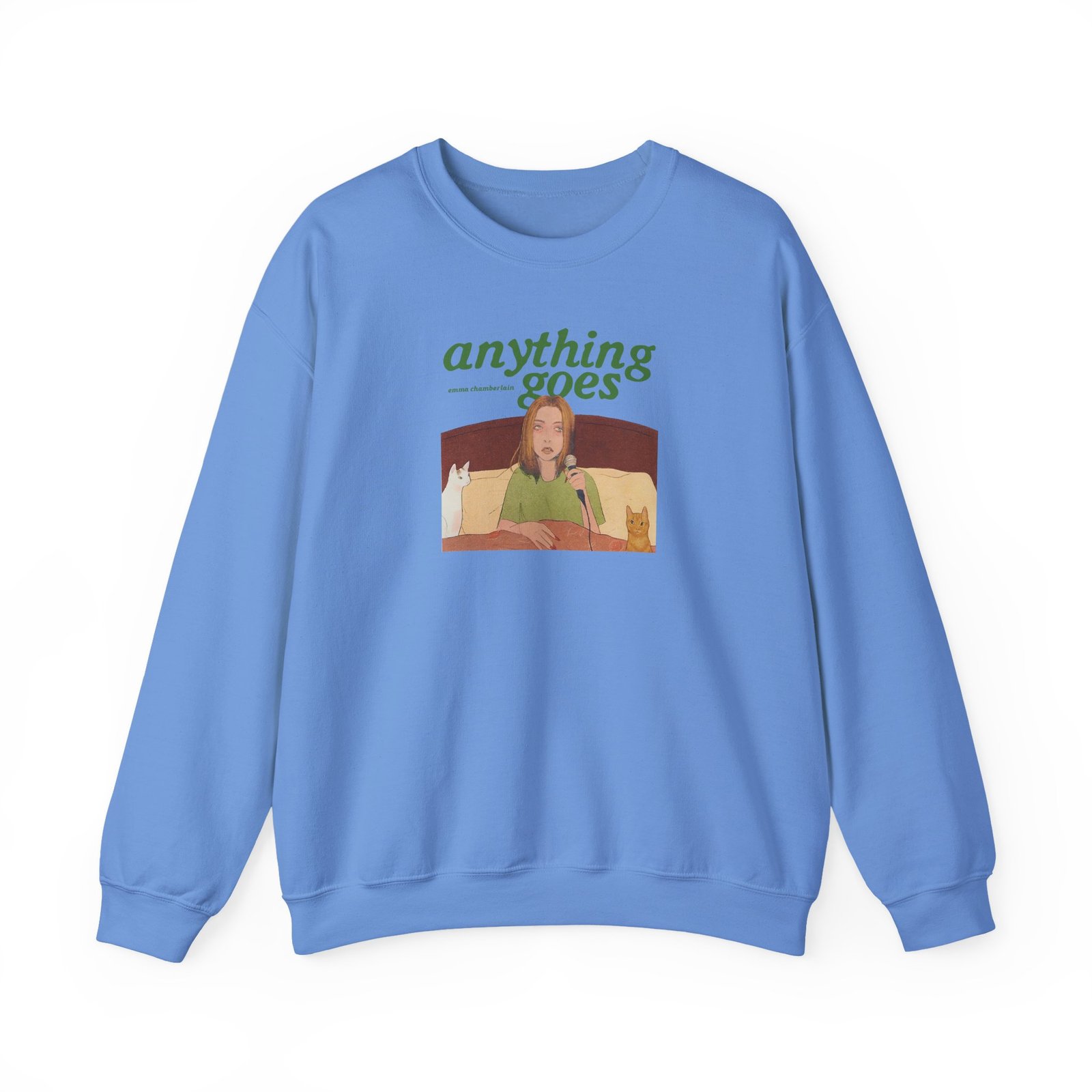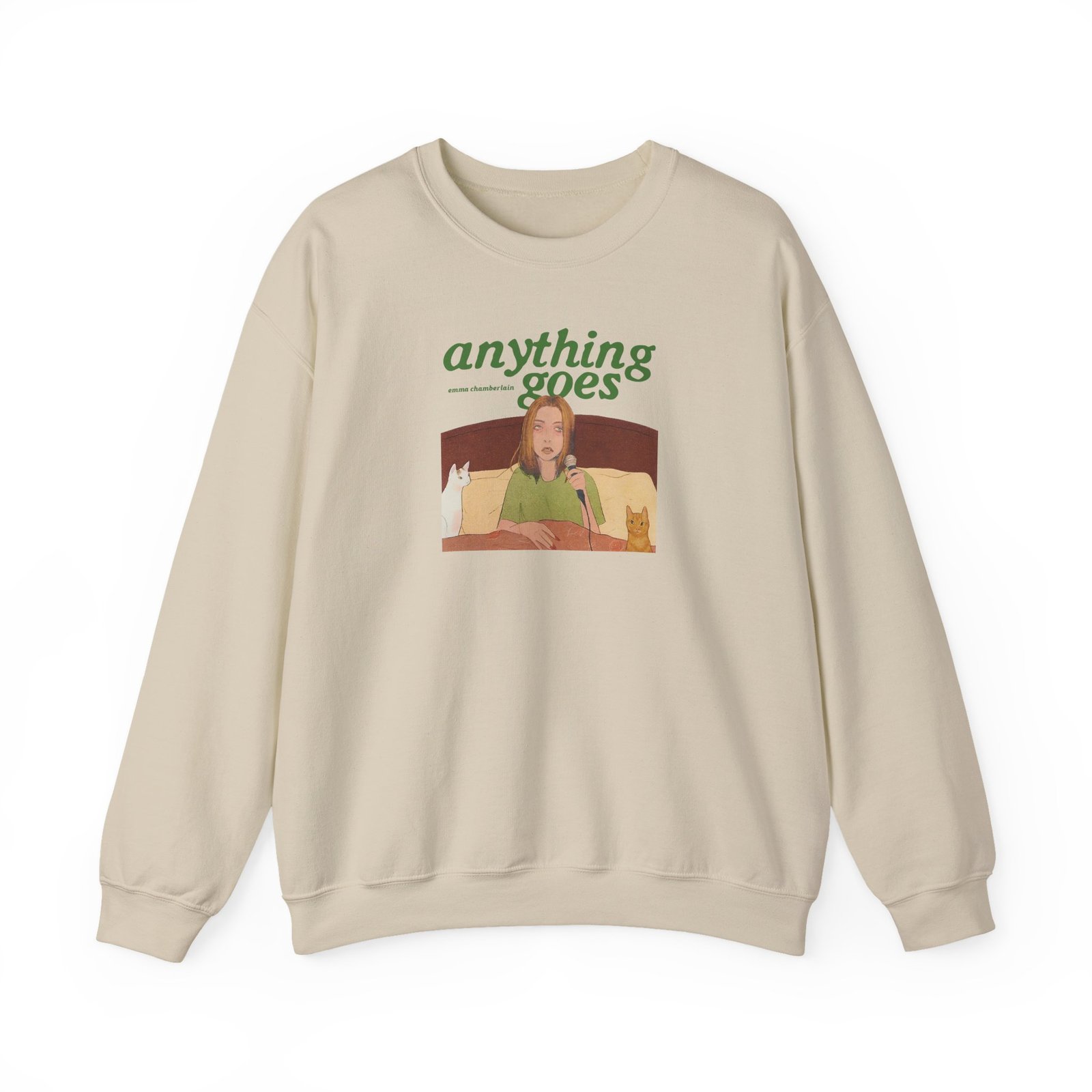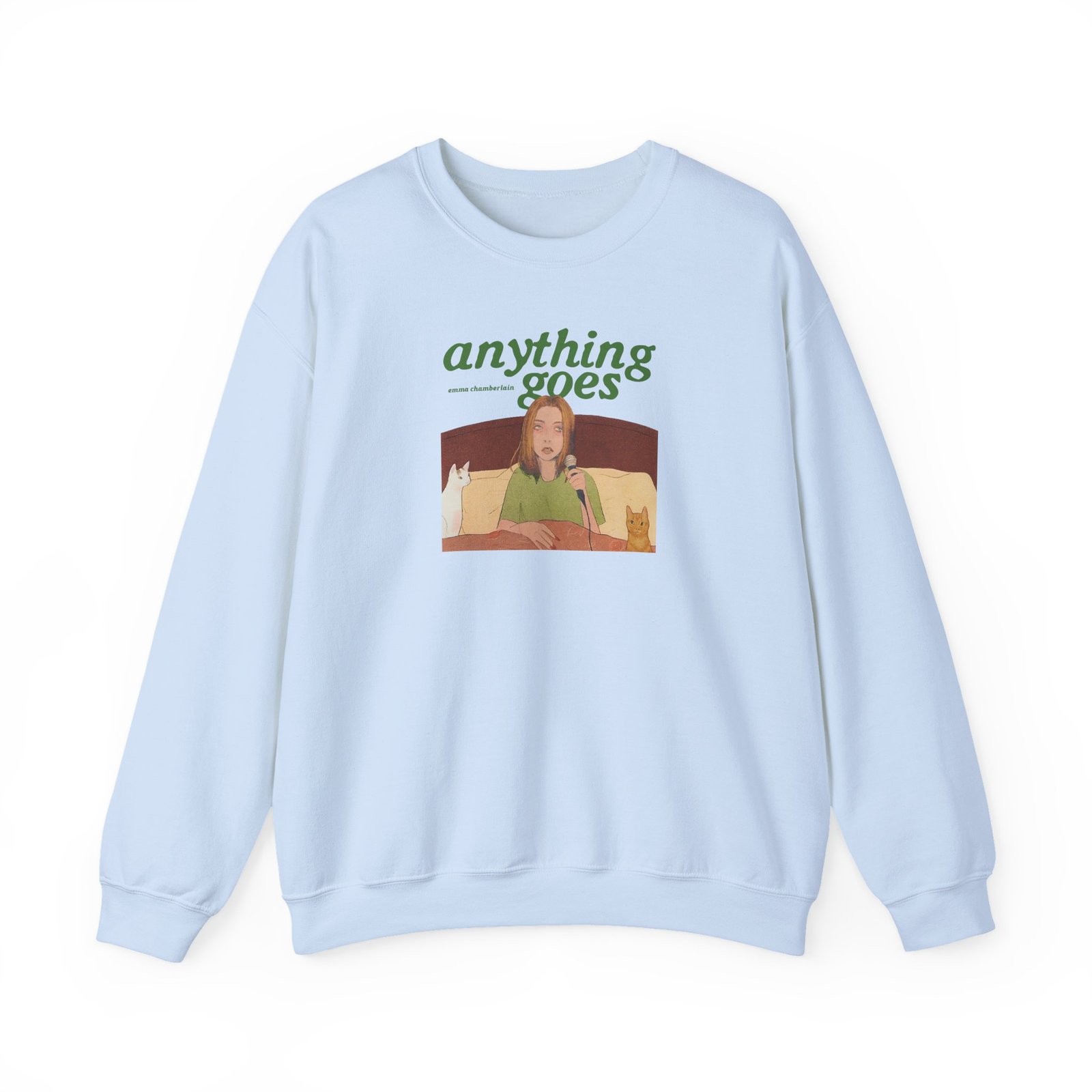 Ideal for any situation, a Emma Chamberlain Anything Goes unisex heavy blend crewneck sweatshirt is pure comfort. These garments are made from polyester and cotton. This combination helps designs come out looking fresh and beautiful. The collar is ribbed knit, so it retains its shape even after washing. There are no itchy side seams on these sweaters.