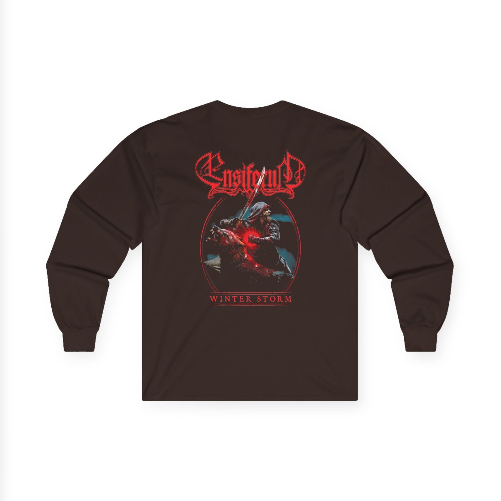A bit more formal than a standard-issue t-shirt, the Ensiferum Winter Storm Paganfest ultra cotton long sleeve tee is a clear comfort winner. The sleeves also act as a nice frame. There are no side seams. The shoulders are taped for improved durability. This makes for a good fitting around the shoulders and neck. The cotton used for these shirts is environmentally friendly.