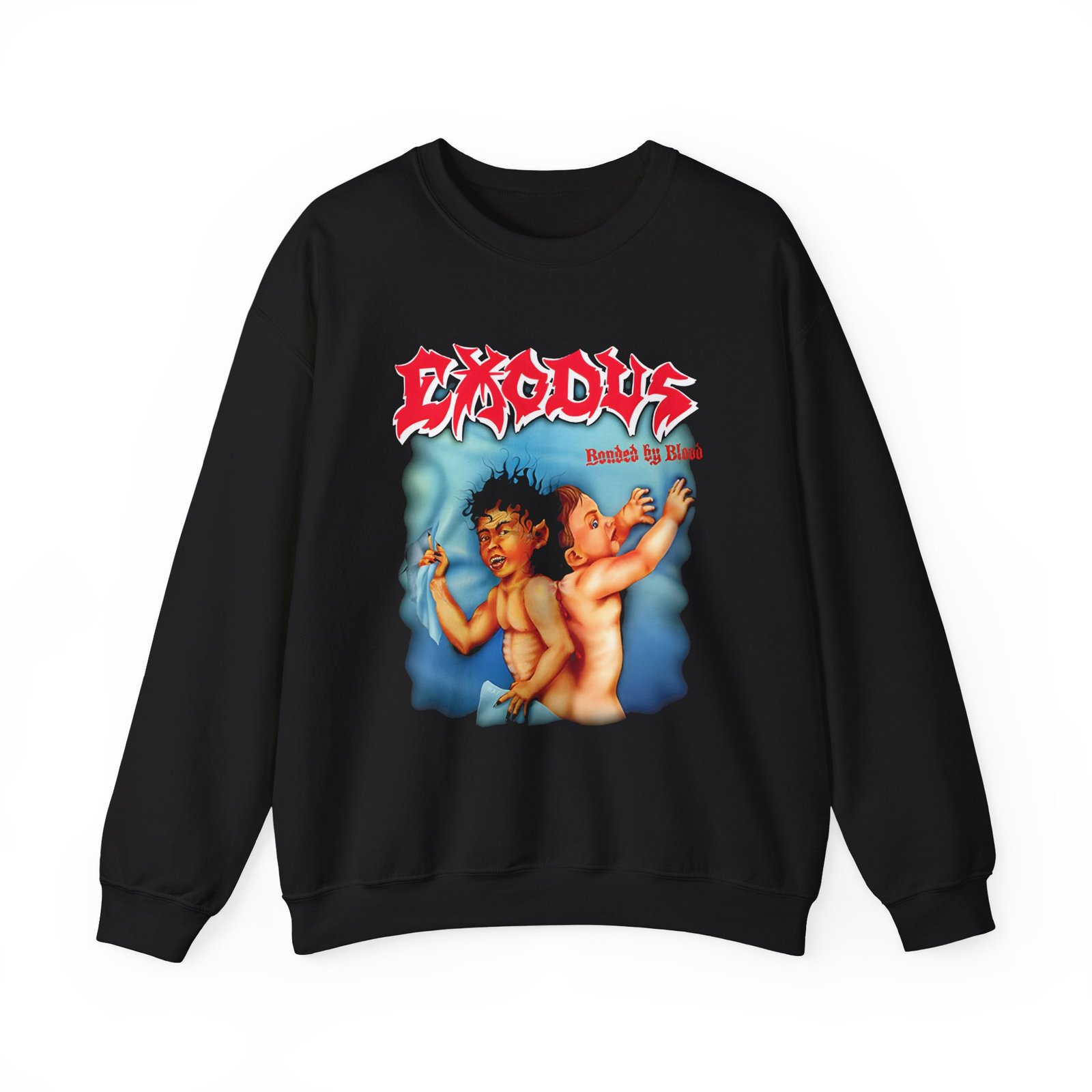 Ideal for any situation, a Exodus Bonded by Blood unisex heavy blend crewneck sweatshirt is pure comfort. These garments are made from polyester and cotton. This combination helps designs come out looking fresh and beautiful. The collar is ribbed knit, so it retains its shape even after washing. There are no itchy side seams on these sweaters.