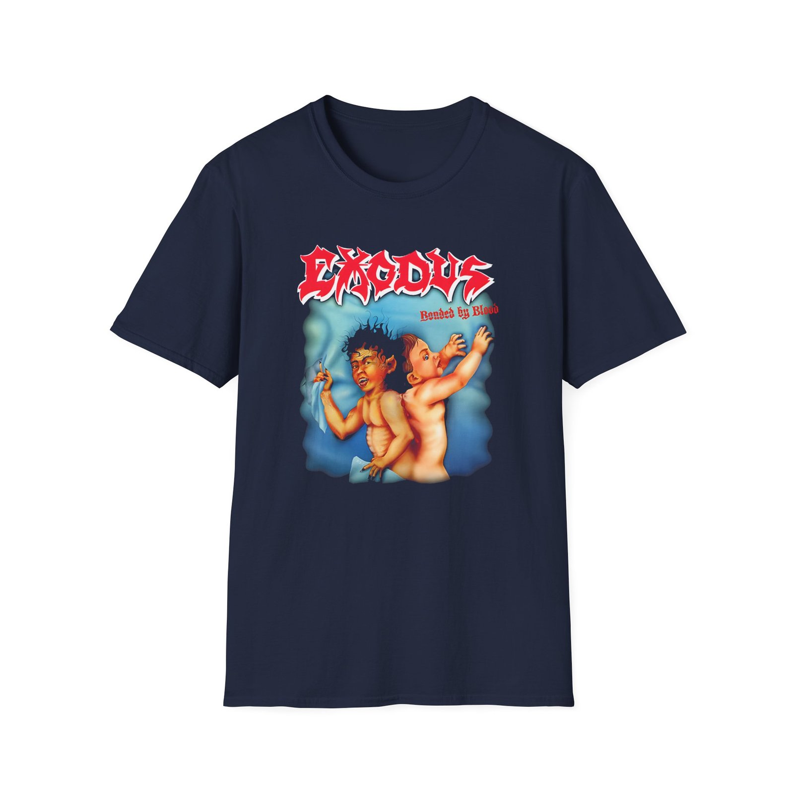 The Exodus Bonded by Blood unisex soft-style t-shirt puts a new spin on casual comfort. Made from very soft materials, this tee is 100% cotton for solid colors. Heather colors and sports grey include polyester. The shoulders have twill tape for improved durability. There are no side seams. The collar is made with ribbed knitting to prevent curling damage.