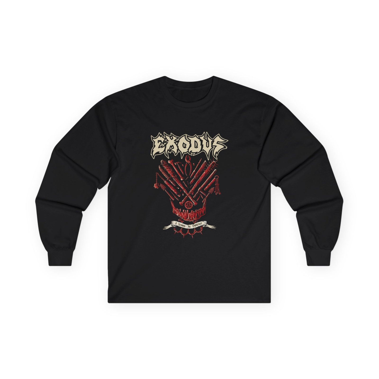 A bit more formal than a standard-issue t-shirt, the Exodus Lesson in Violence ultra cotton long sleeve tee is a clear comfort winner. The sleeves also act as a nice frame. There are no side seams. The shoulders are taped for improved durability. This makes for a good fitting around the shoulders and neck. The cotton used for these shirts is environmentally friendly.