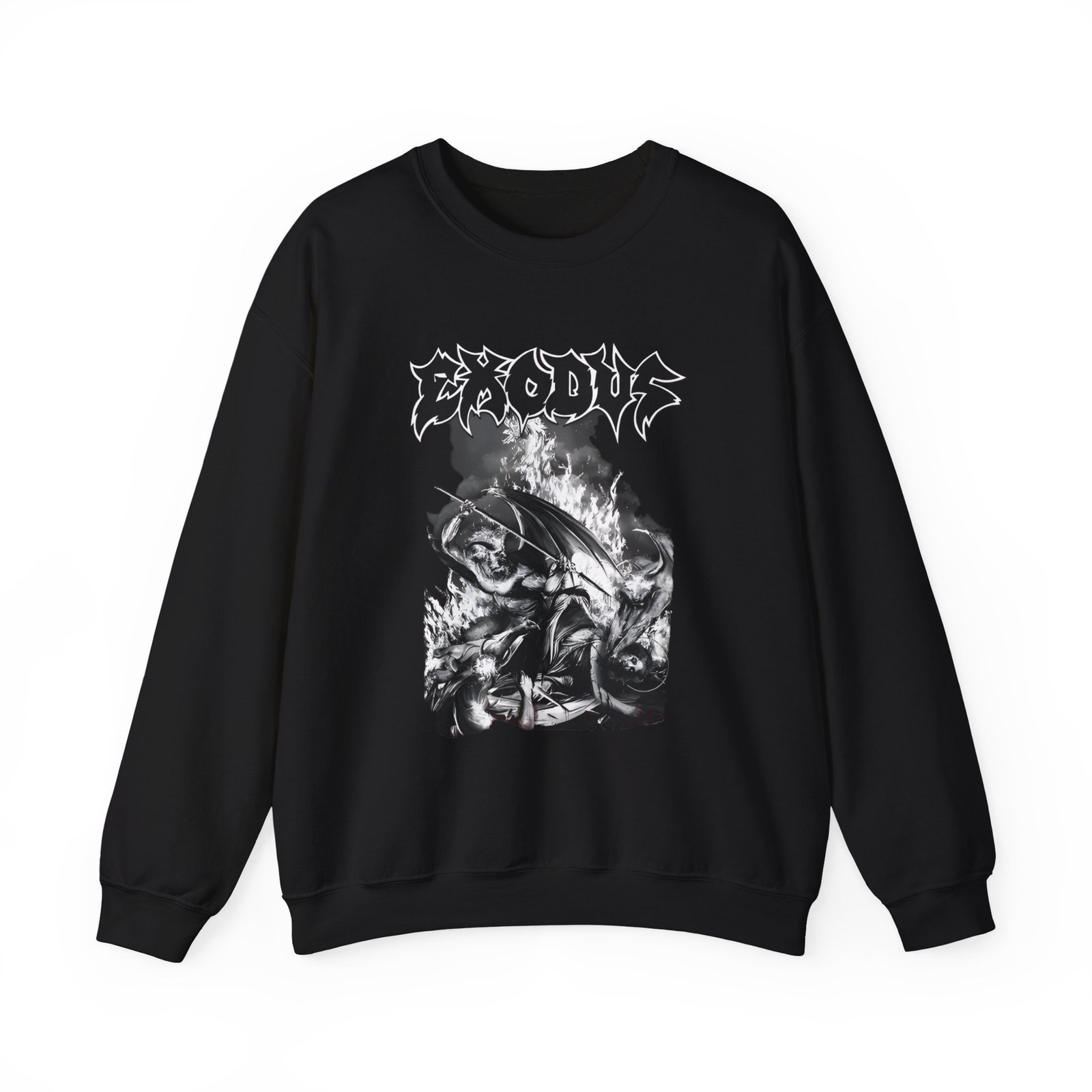 Ideal for any situation, a Exodus Now Thy Death unisex heavy blend crewneck sweatshirt is pure comfort. These garments are made from polyester and cotton. This combination helps designs come out looking fresh and beautiful. The collar is ribbed knit, so it retains its shape even after washing. There are no itchy side seams on these sweaters.