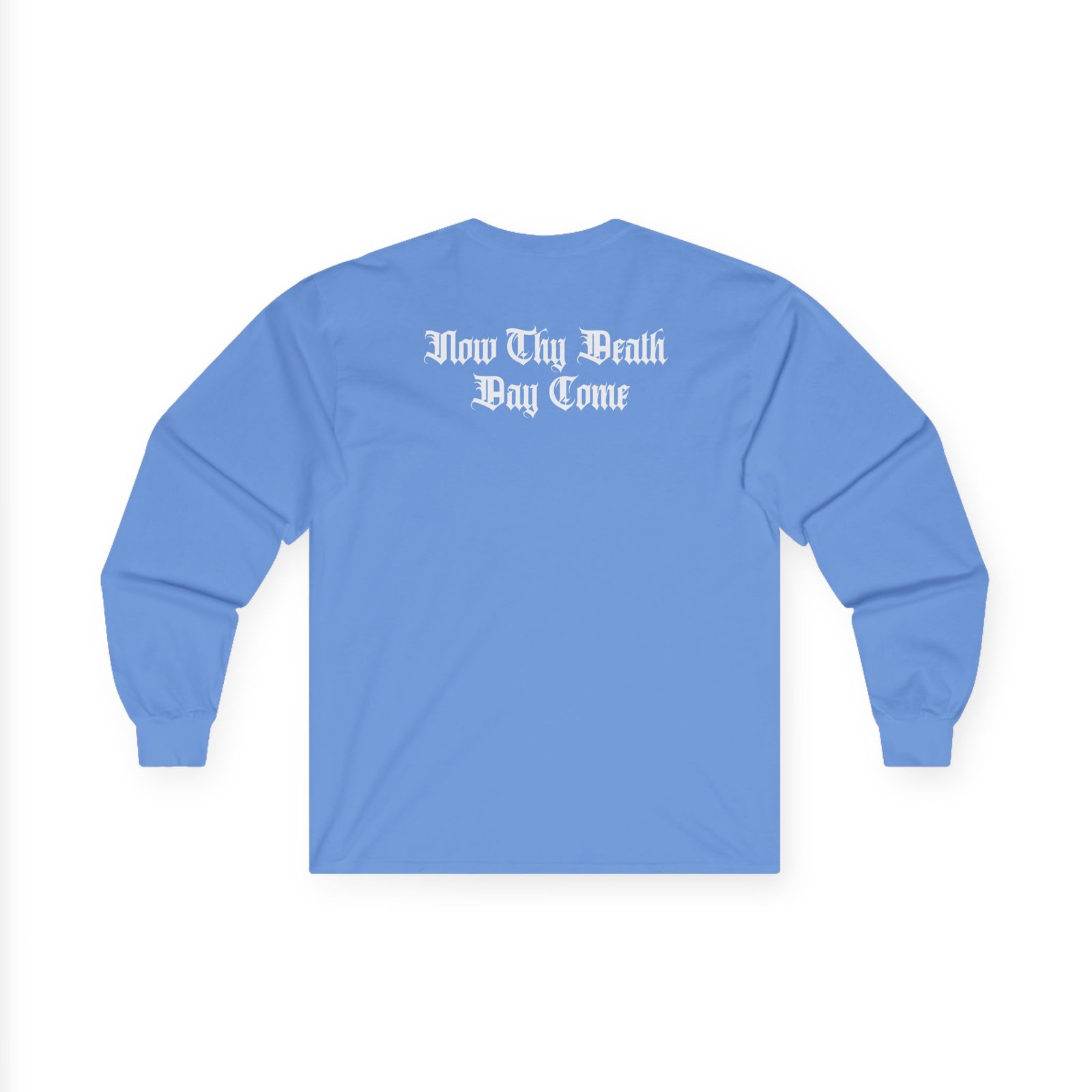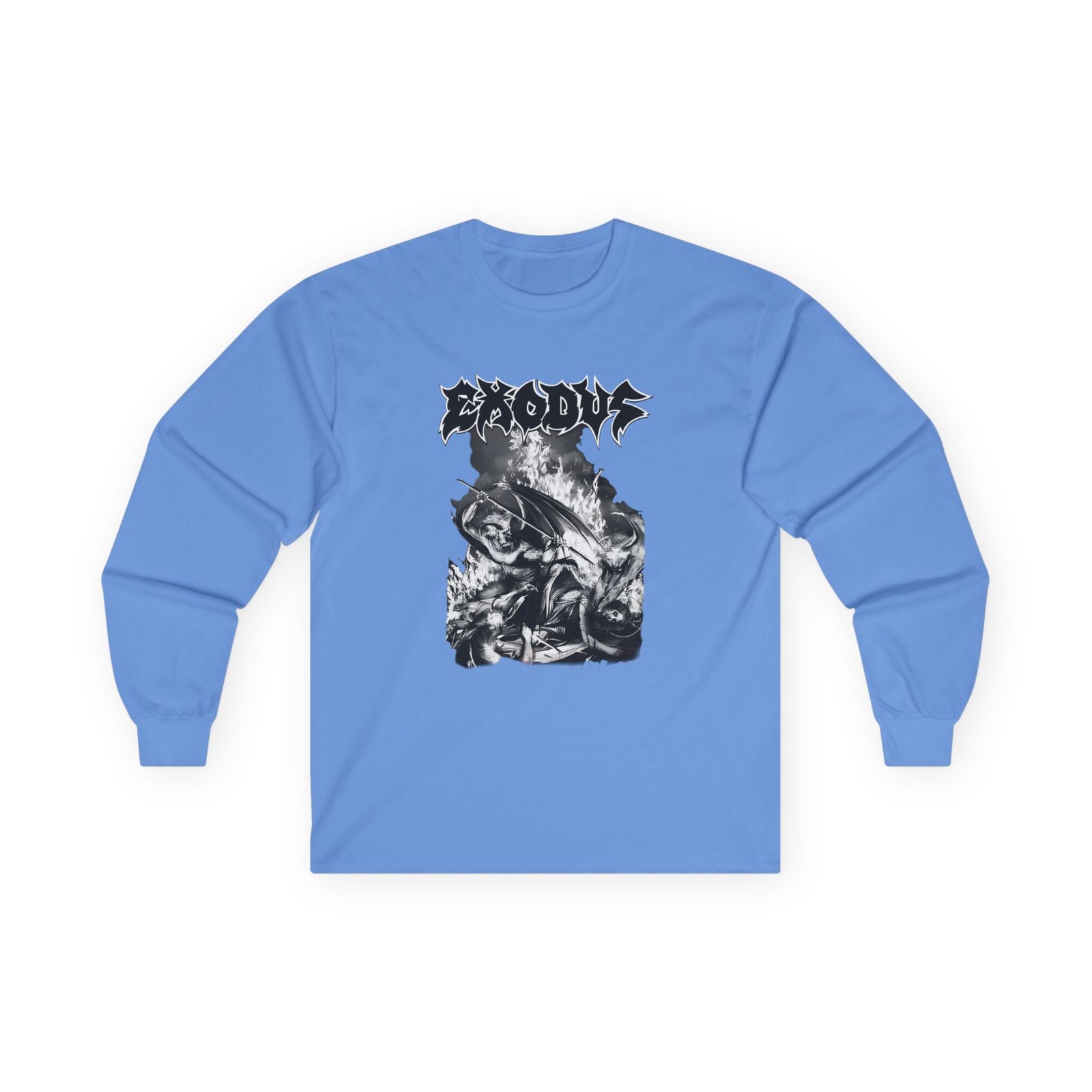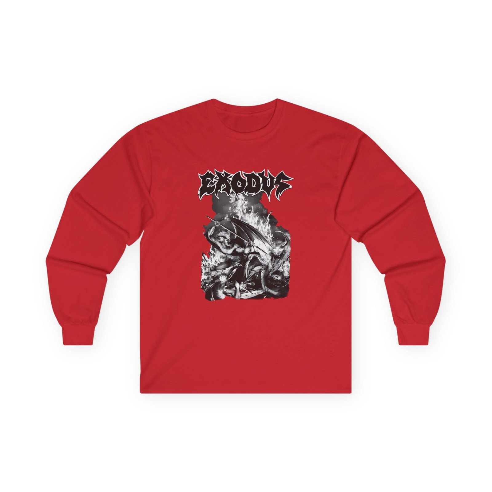 A bit more formal than a standard-issue t-shirt, the Exodus Now Thy Death ultra cotton long sleeve tee is a clear comfort winner. The sleeves also act as a nice frame. There are no side seams. The shoulders are taped for improved durability. This makes for a good fitting around the shoulders and neck. The cotton used for these shirts is environmentally friendly.