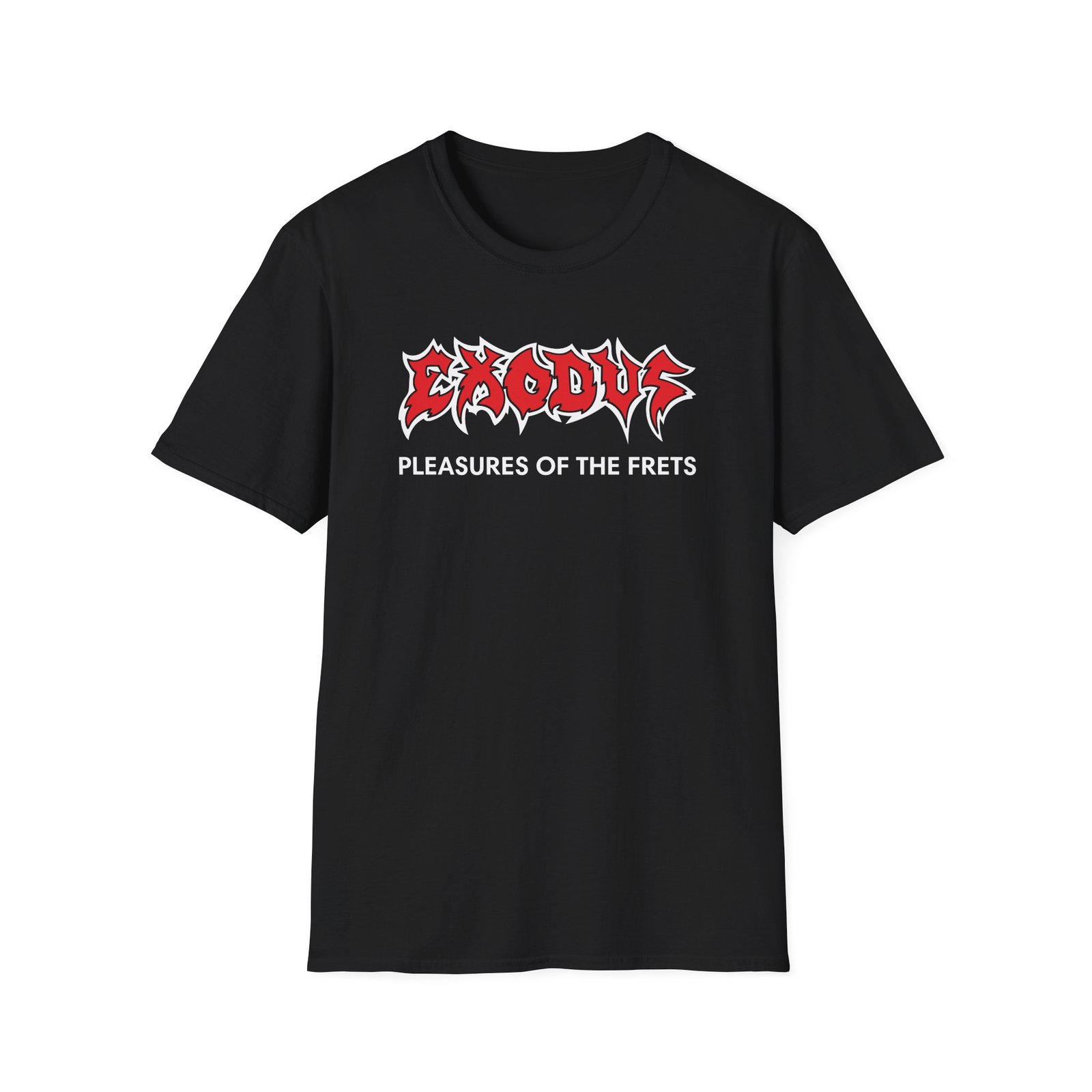 The Exodus Pleasures of the Frets unisex soft-style t-shirt puts a new spin on casual comfort. Made from very soft materials, this tee is 100% cotton for solid colors. Heather colors and sports grey include polyester. The shoulders have twill tape for improved durability. There are no side seams. The collar is made with ribbed knitting to prevent curling damage.