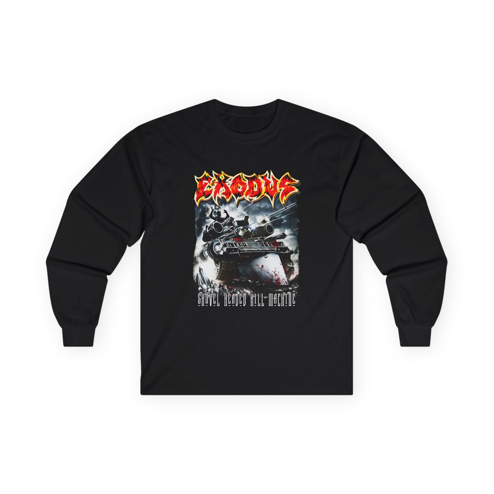 A bit more formal than a standard-issue t-shirt, the Exodus Shovel Headed Kill Machine ultra cotton long sleeve tee is a clear comfort winner. The sleeves also act as a nice frame. There are no side seams. The shoulders are taped for improved durability. This makes for a good fitting around the shoulders and neck. The cotton used for these shirts is environmentally friendly.