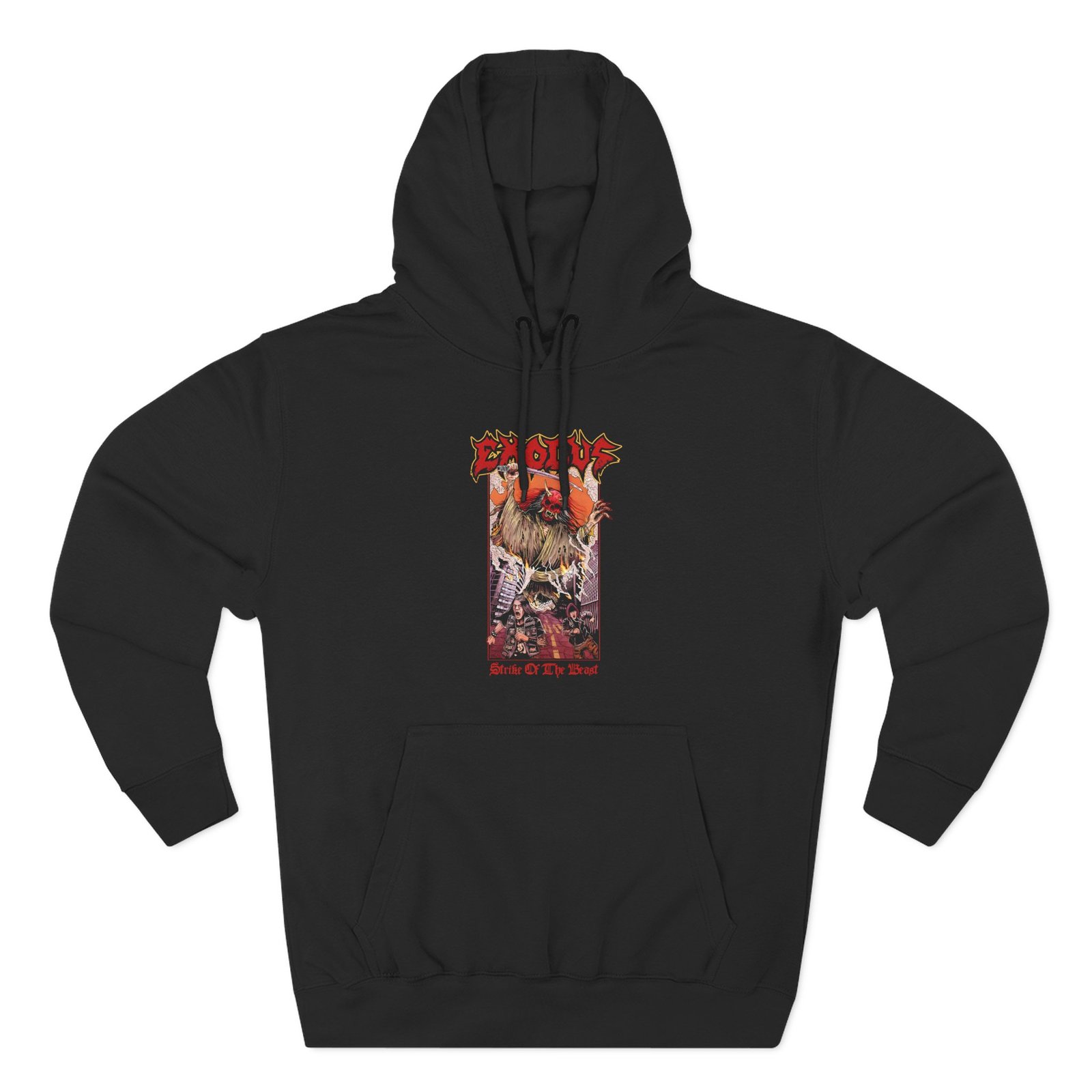 Beat the cold with this Exodus Strike of the Beast premium pullover hoodie that’s just the right layer of warm and cozy. Made with three-panel fleece lining, this pullover is double stitched for durability and roomy. Pick one in your favorite color to match your style.