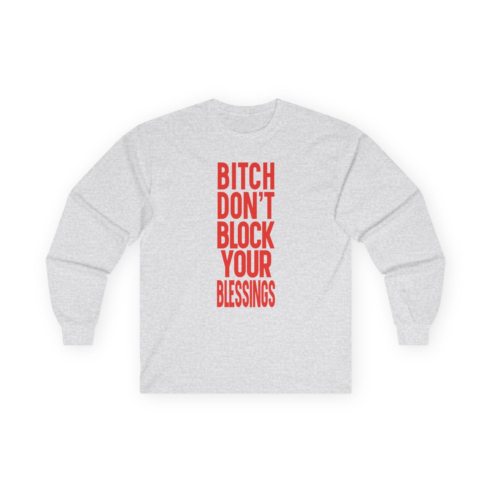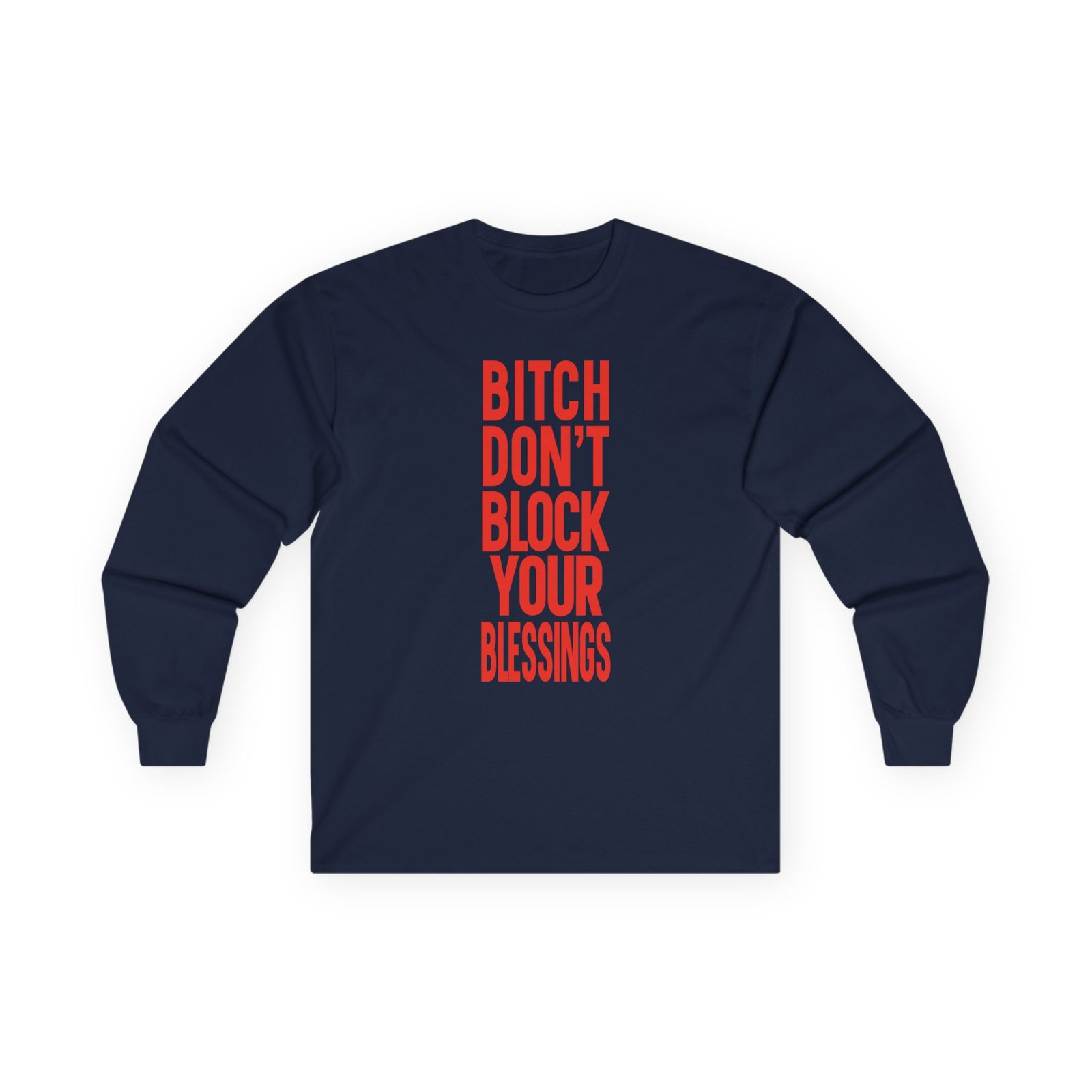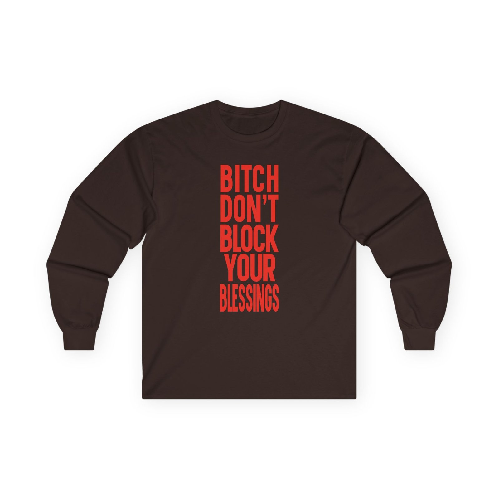 A bit more formal than a standard-issue t-shirt, the FMT Don't Block Your Blessings ultra cotton long sleeve tee is a clear comfort winner. The sleeves also act as a nice frame. There are no side seams. The shoulders are taped for improved durability. This makes for a good fitting around the shoulders and neck. The cotton used for these shirts is environmentally friendly.