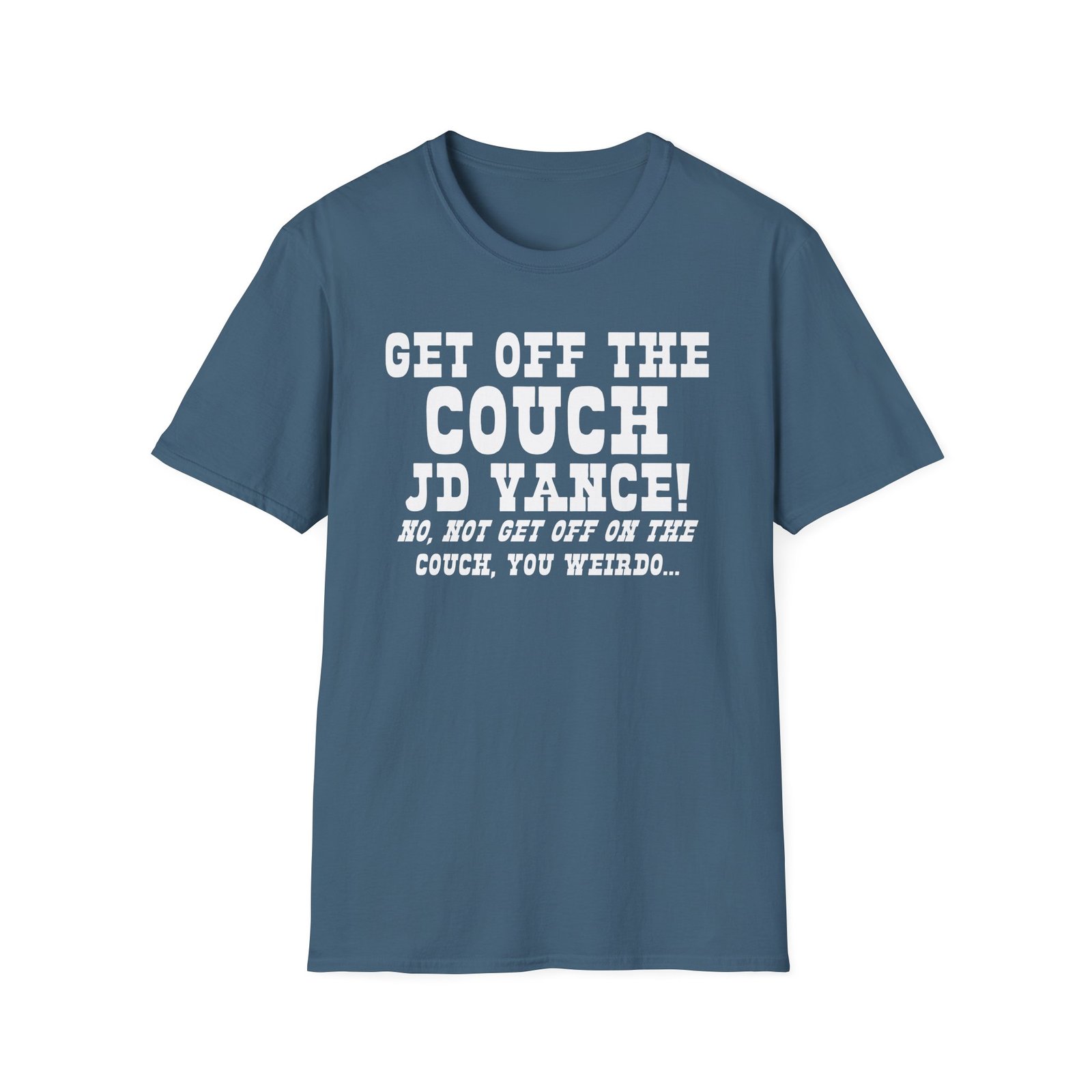 The Get Off the Couch Jd Vance unisex soft-style t-shirt puts a new spin on casual comfort. Made from very soft materials, this tee is 100% cotton for solid colors. Heather colors and sports grey include polyester. The shoulders have twill tape for improved durability. There are no side seams. The collar is made with ribbed knitting to prevent curling damage.