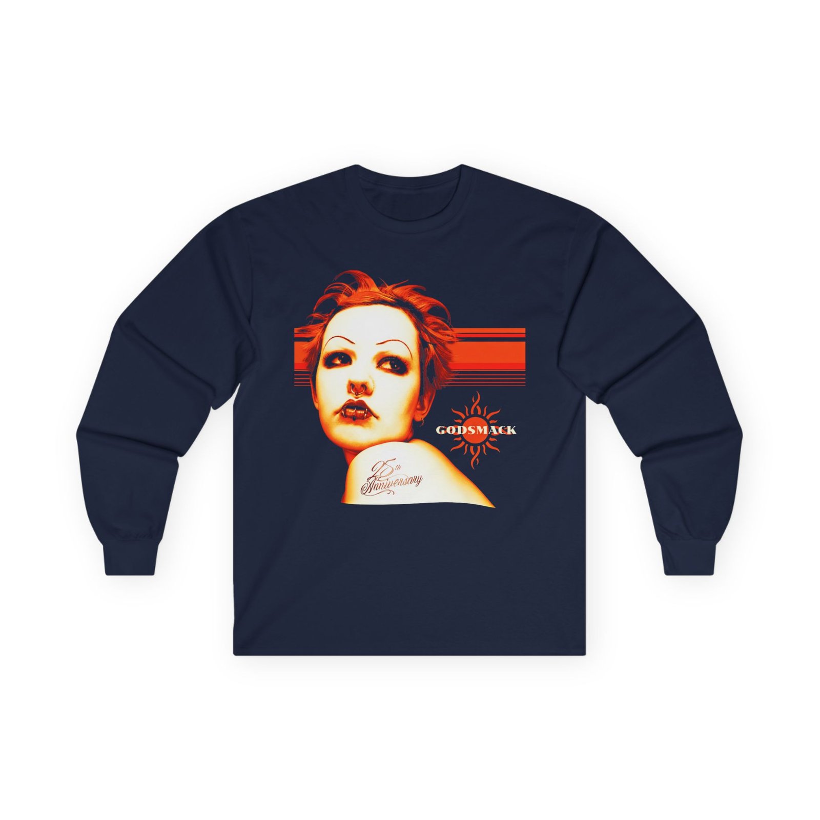 A bit more formal than a standard-issue t-shirt, the Godsmack 25th Anniversary ultra cotton long sleeve tee is a clear comfort winner. The sleeves also act as a nice frame. There are no side seams. The shoulders are taped for improved durability. This makes for a good fitting around the shoulders and neck. The cotton used for these shirts is environmentally friendly.