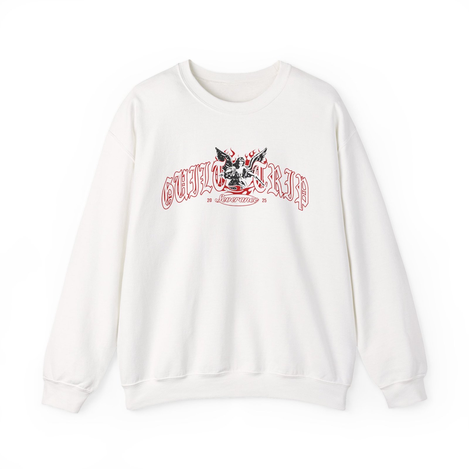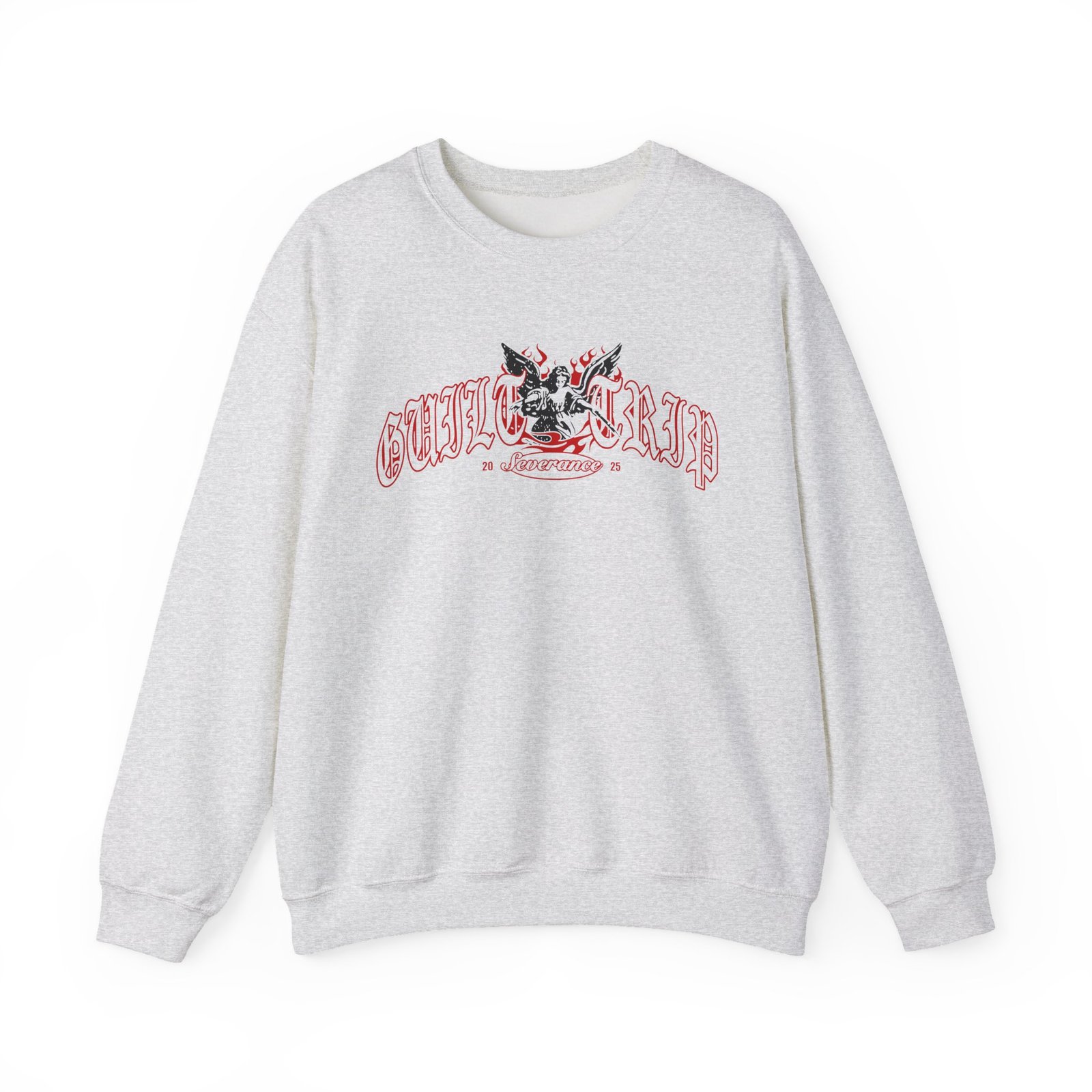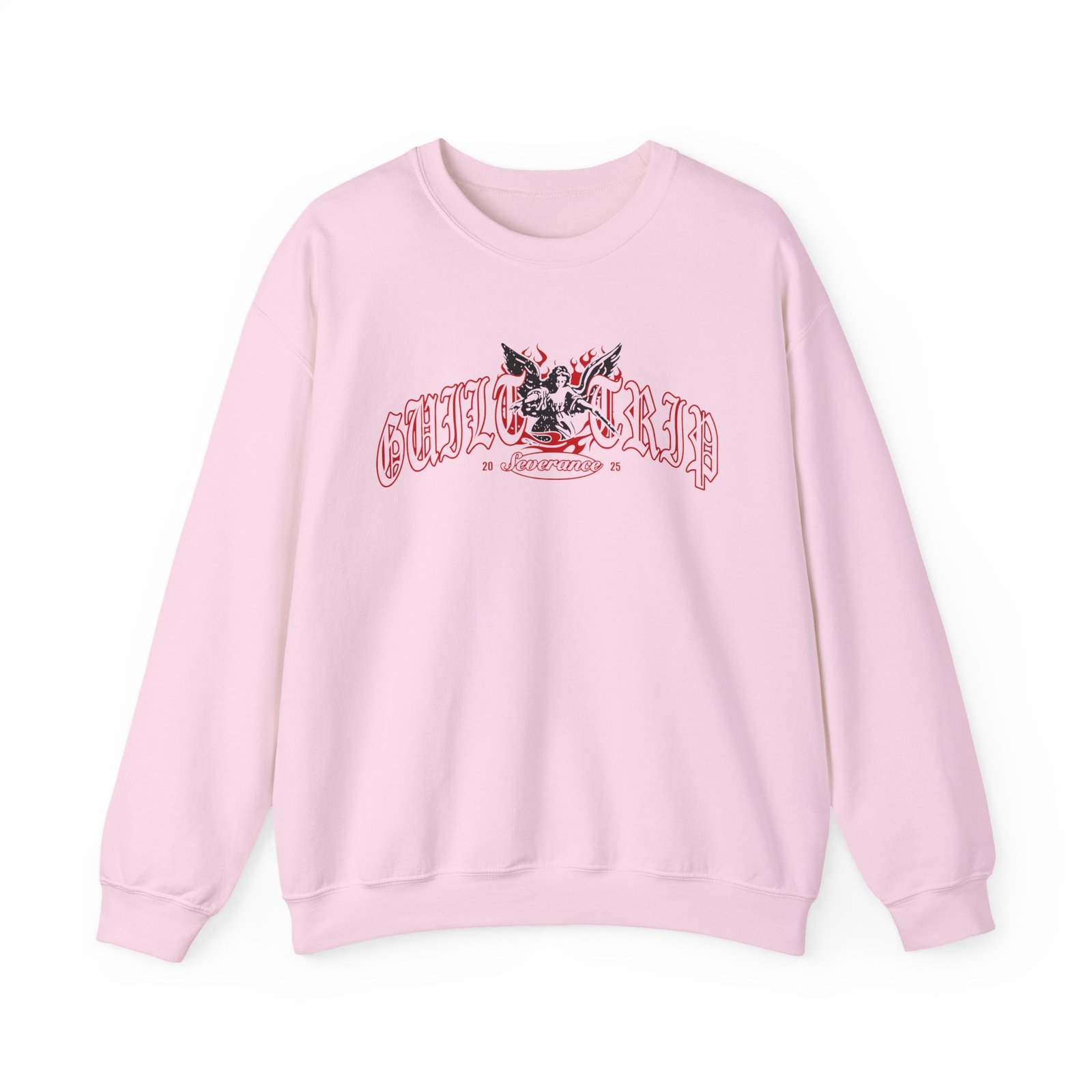 Ideal for any situation, a Guilt Trip Old English Angel unisex heavy blend crewneck sweatshirt is pure comfort. These garments are made from polyester and cotton. This combination helps designs come out looking fresh and beautiful. The collar is ribbed knit, so it retains its shape even after washing. There are no itchy side seams on these sweaters.