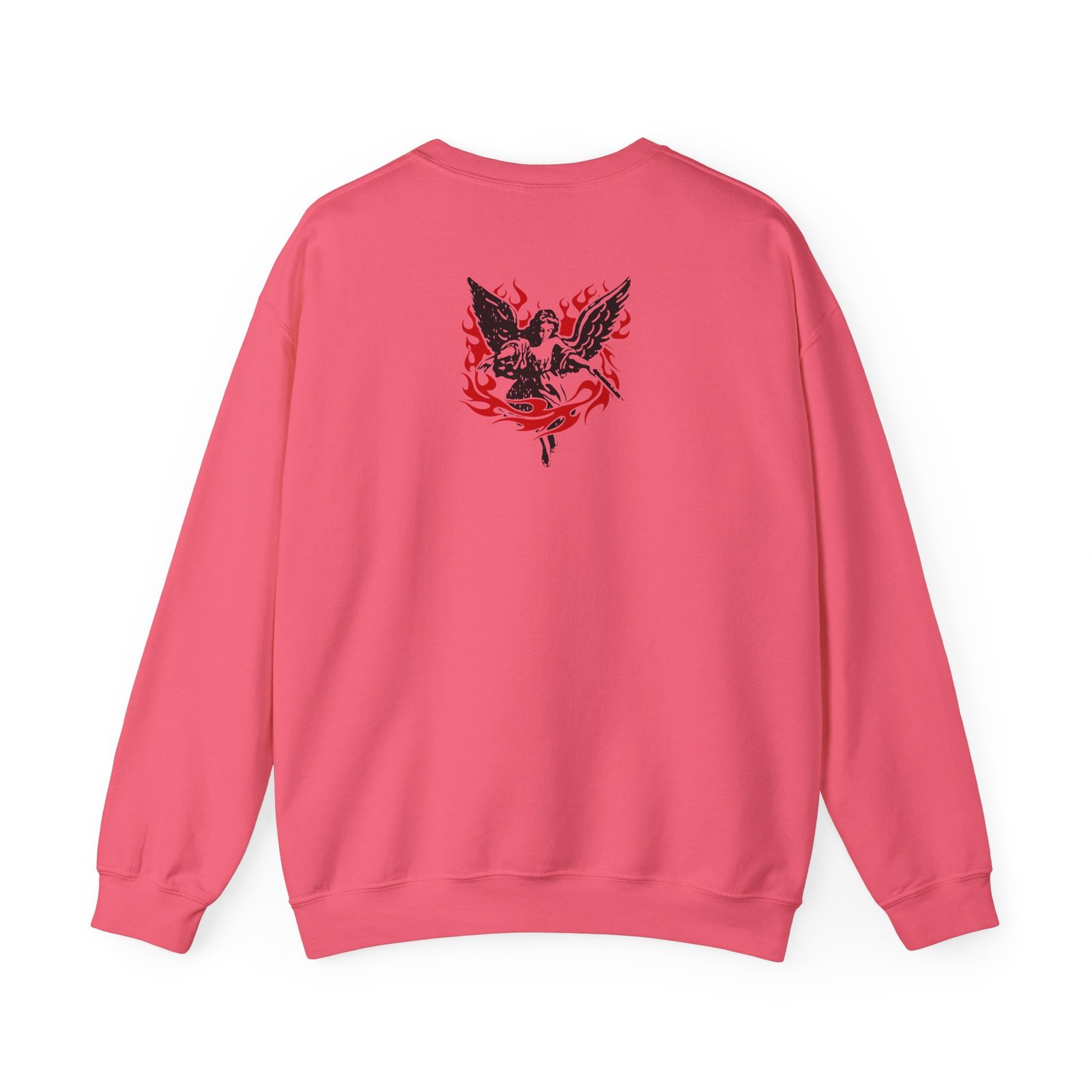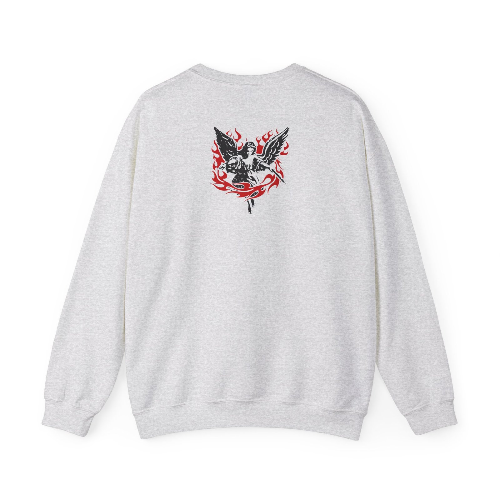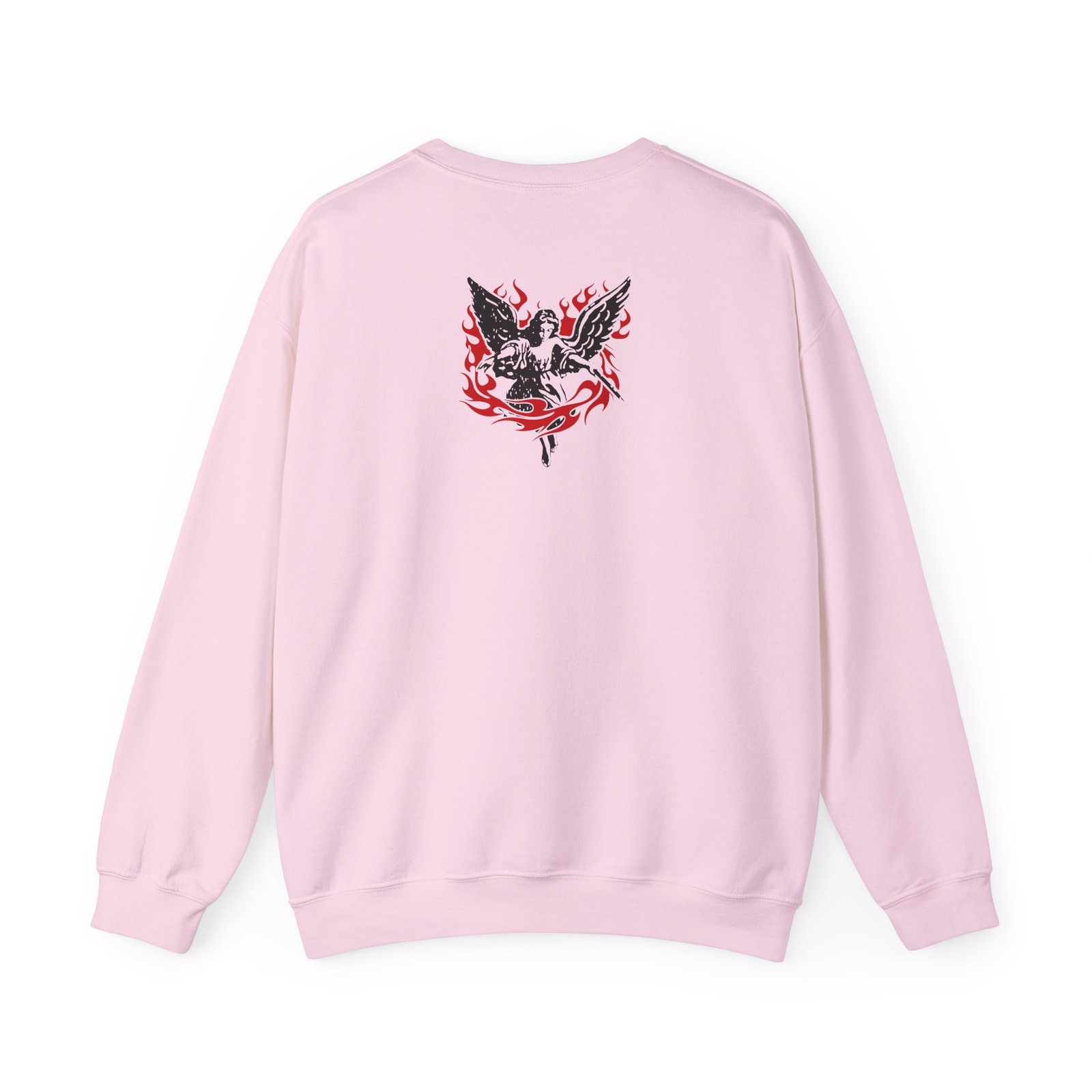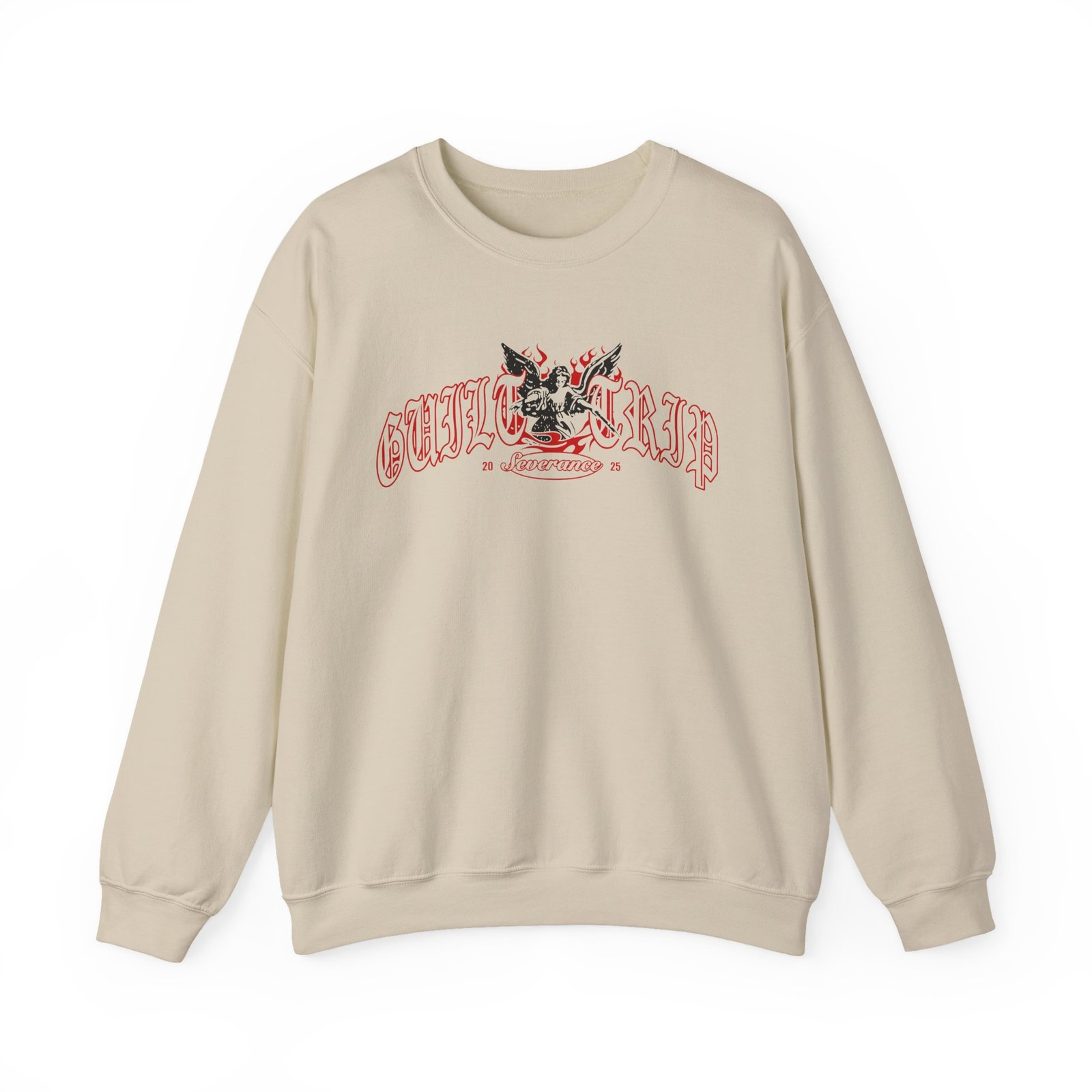 Ideal for any situation, a Guilt Trip Old English Angel unisex heavy blend crewneck sweatshirt is pure comfort. These garments are made from polyester and cotton. This combination helps designs come out looking fresh and beautiful. The collar is ribbed knit, so it retains its shape even after washing. There are no itchy side seams on these sweaters.