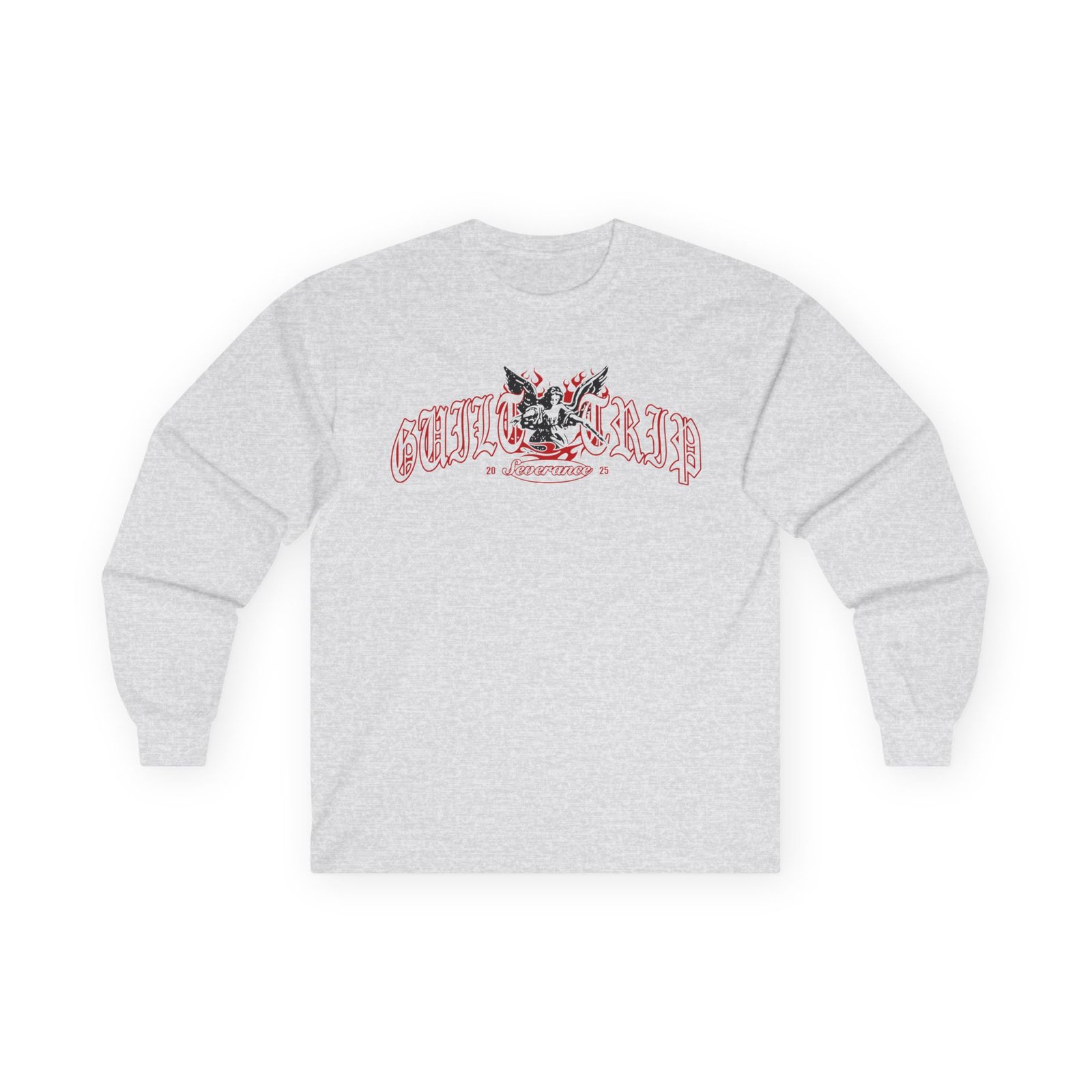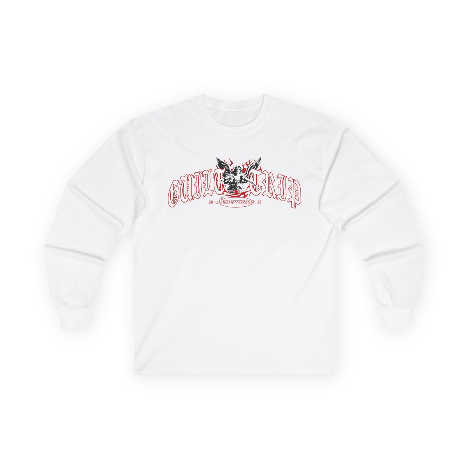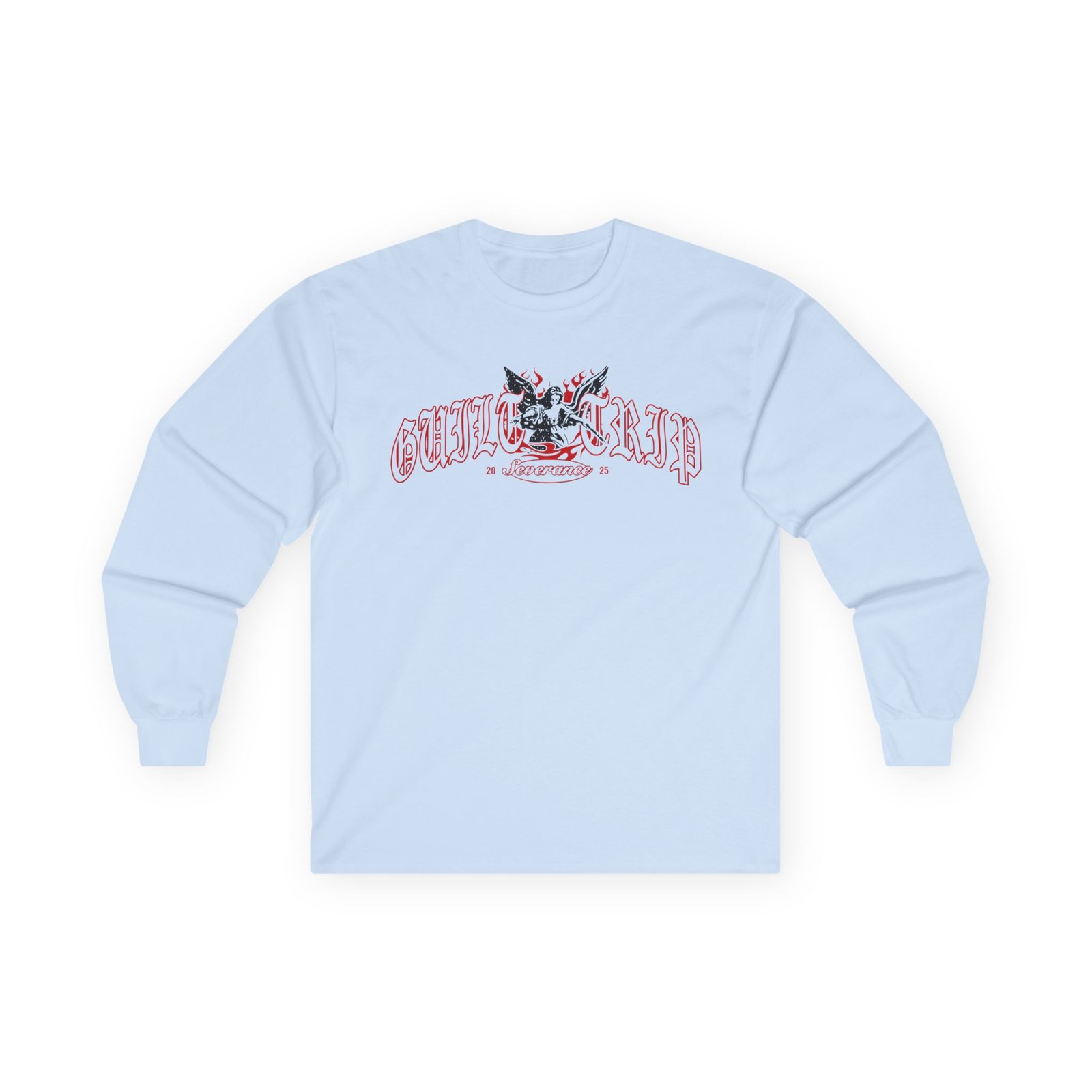 A bit more formal than a standard-issue t-shirt, the Guilt Trip Old English Angel ultra cotton long sleeve tee is a clear comfort winner. The sleeves also act as a nice frame. There are no side seams. The shoulders are taped for improved durability. This makes for a good fitting around the shoulders and neck. The cotton used for these shirts is environmentally friendly.