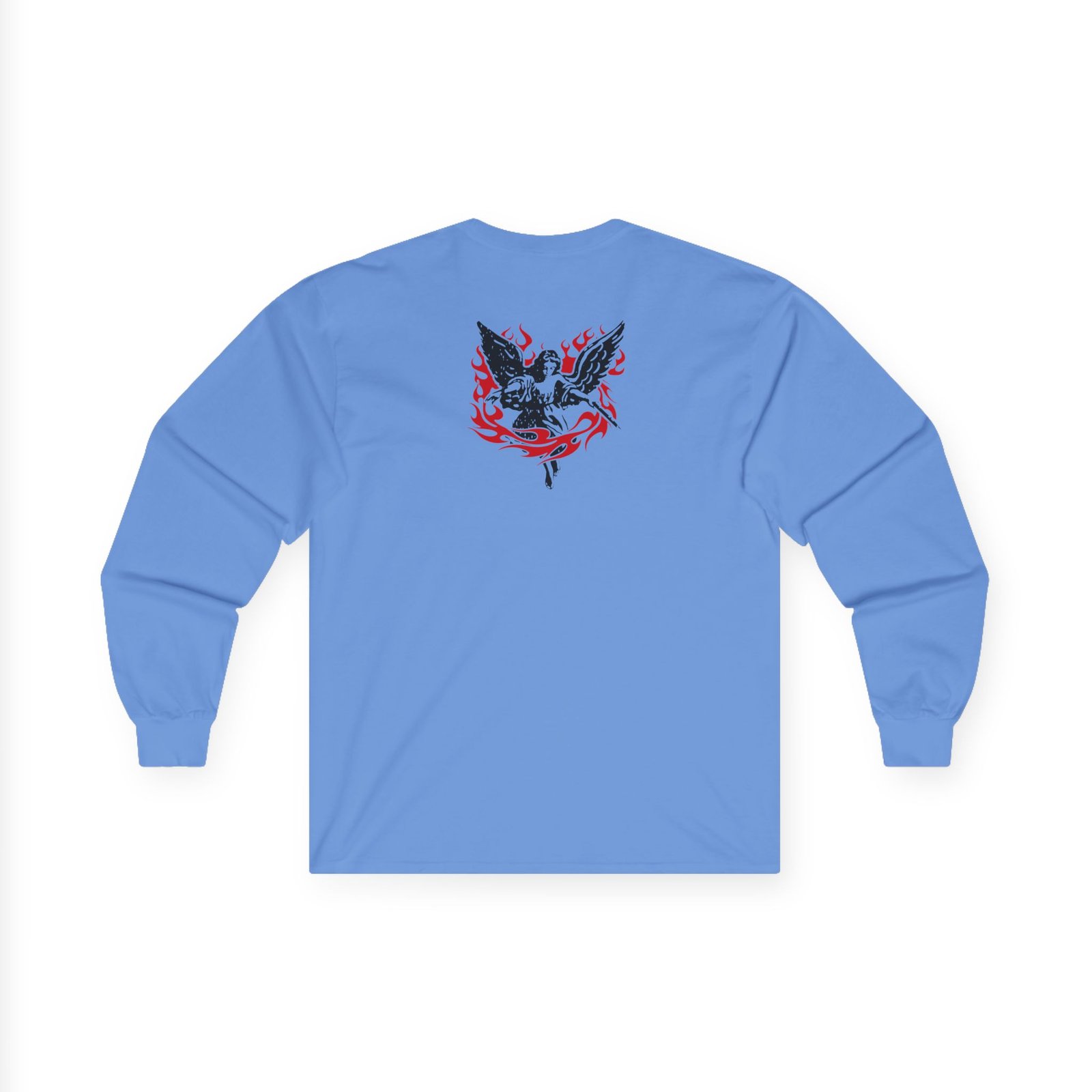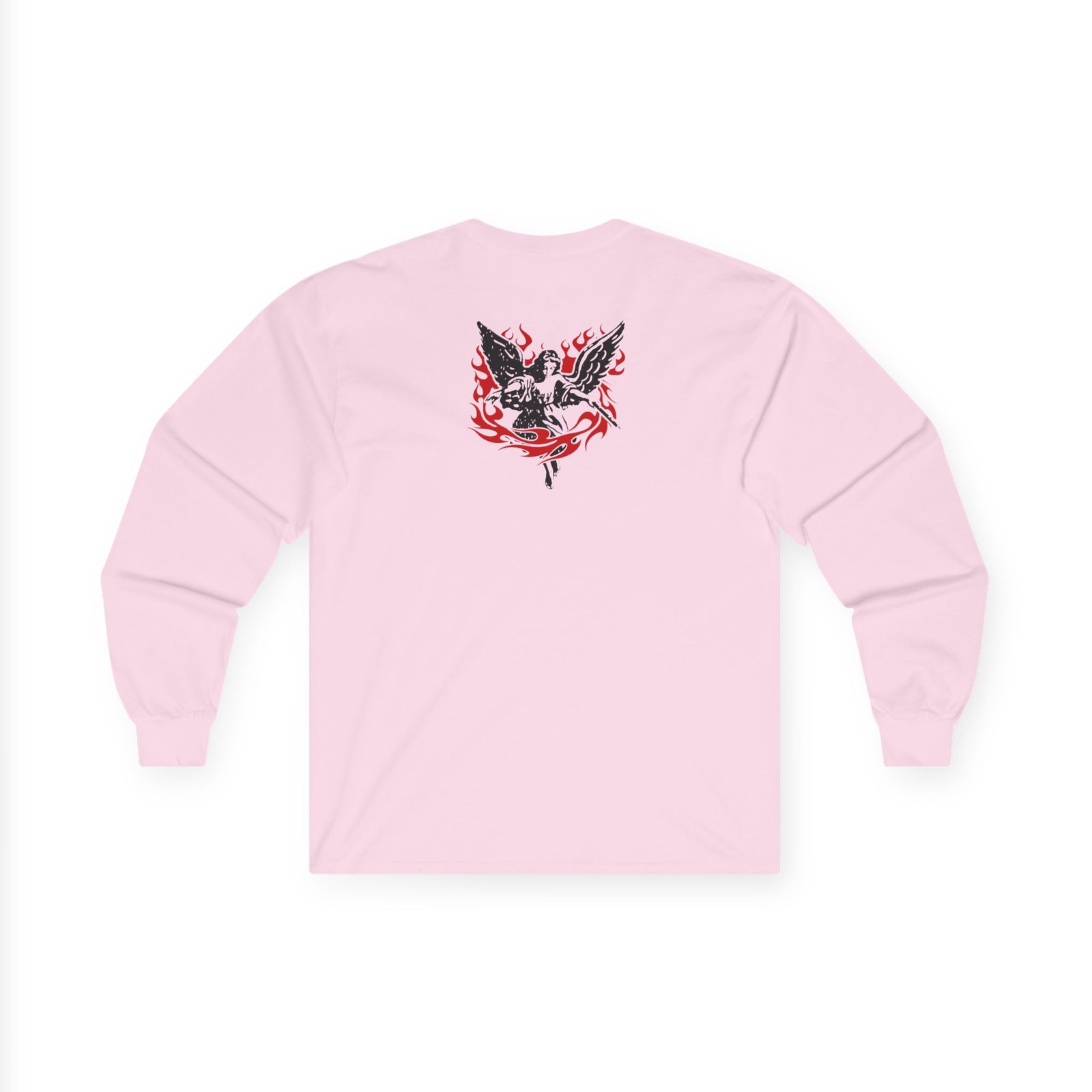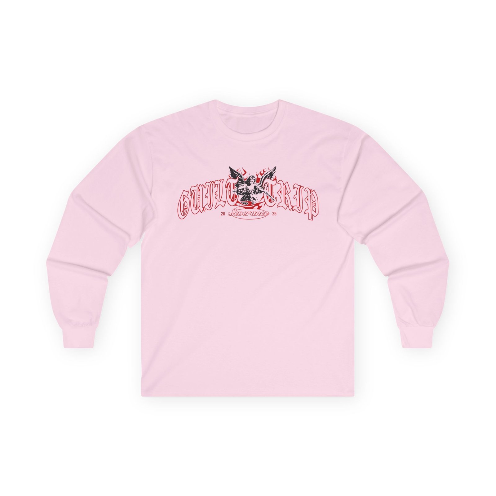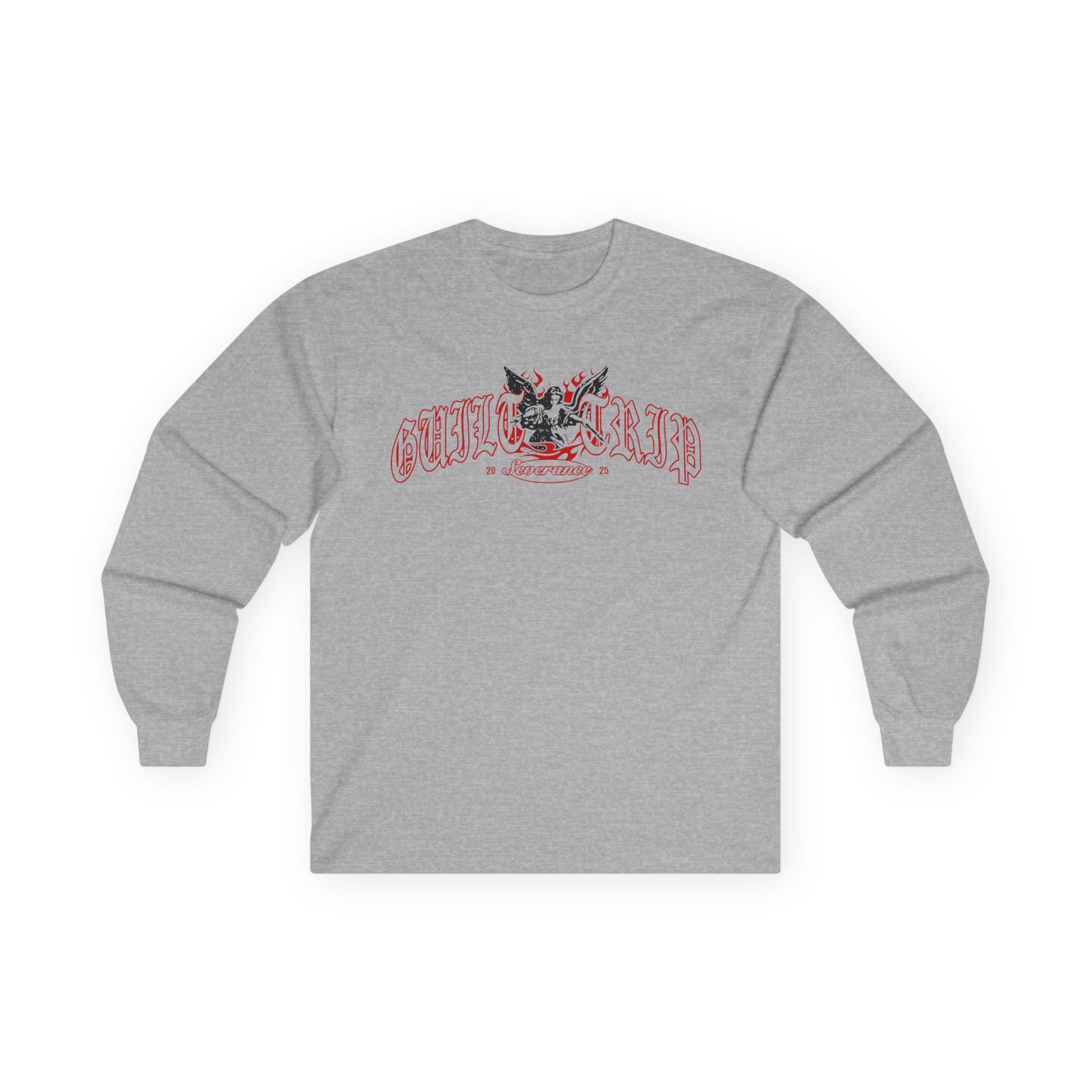 A bit more formal than a standard-issue t-shirt, the Guilt Trip Old English Angel ultra cotton long sleeve tee is a clear comfort winner. The sleeves also act as a nice frame. There are no side seams. The shoulders are taped for improved durability. This makes for a good fitting around the shoulders and neck. The cotton used for these shirts is environmentally friendly.