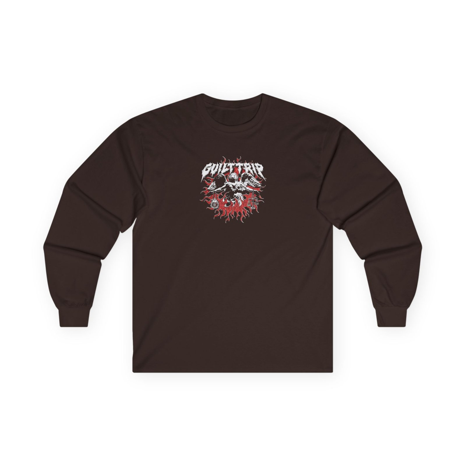A bit more formal than a standard-issue t-shirt, the Guilt Trip Tribal Angel ultra cotton long sleeve tee is a clear comfort winner. The sleeves also act as a nice frame. There are no side seams. The shoulders are taped for improved durability. This makes for a good fitting around the shoulders and neck. The cotton used for these shirts is environmentally friendly.