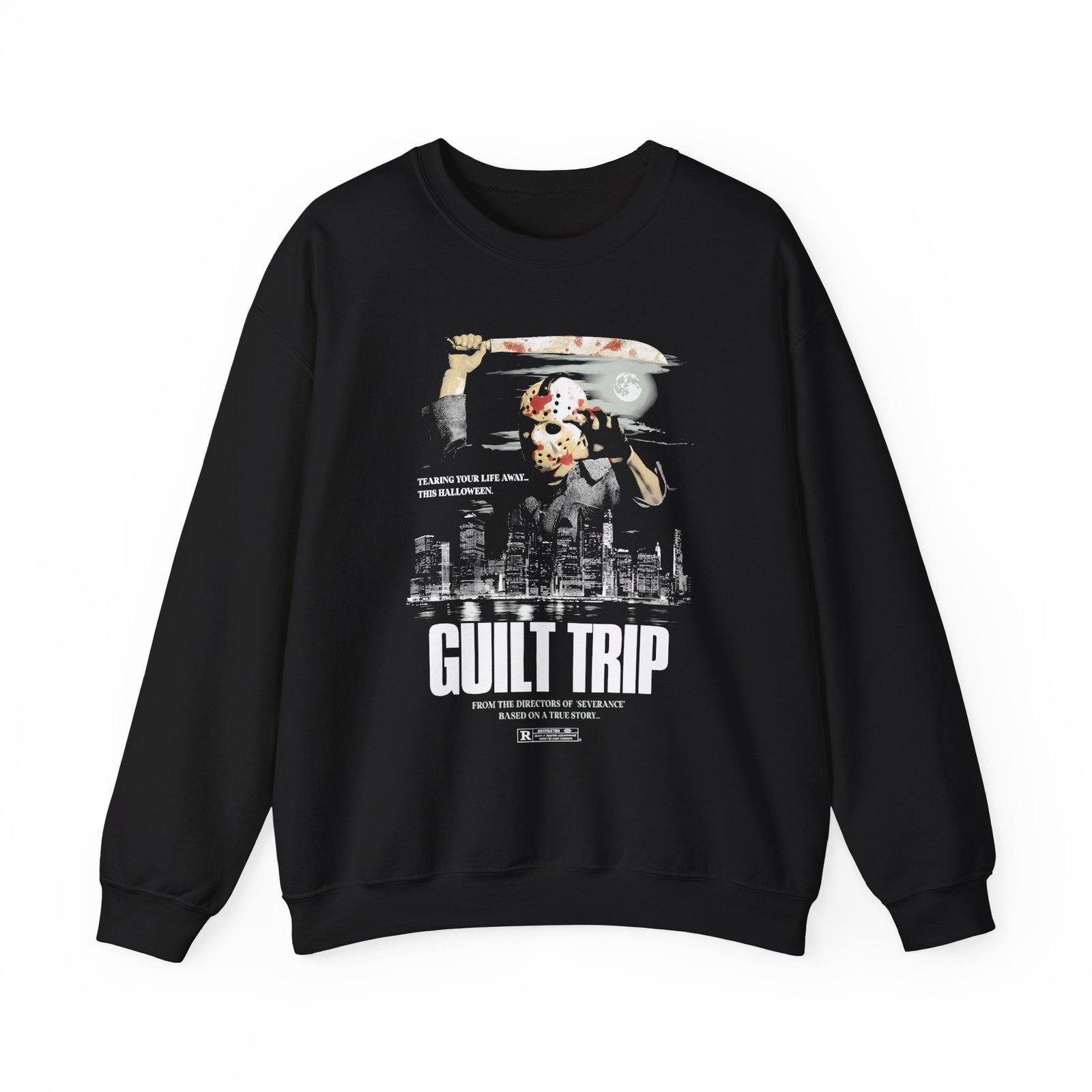 Ideal for any situation, a Guilt Trip Voorhees unisex heavy blend crewneck sweatshirt is pure comfort. These garments are made from polyester and cotton. This combination helps designs come out looking fresh and beautiful. The collar is ribbed knit, so it retains its shape even after washing. There are no itchy side seams on these sweaters.