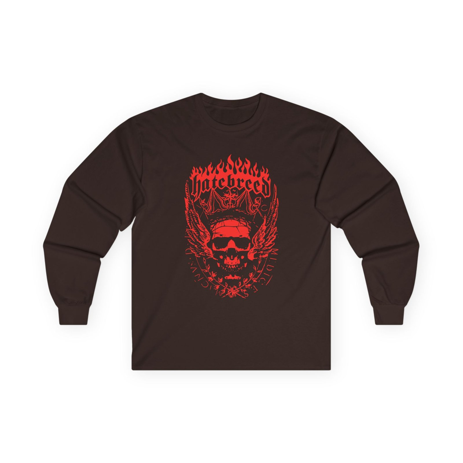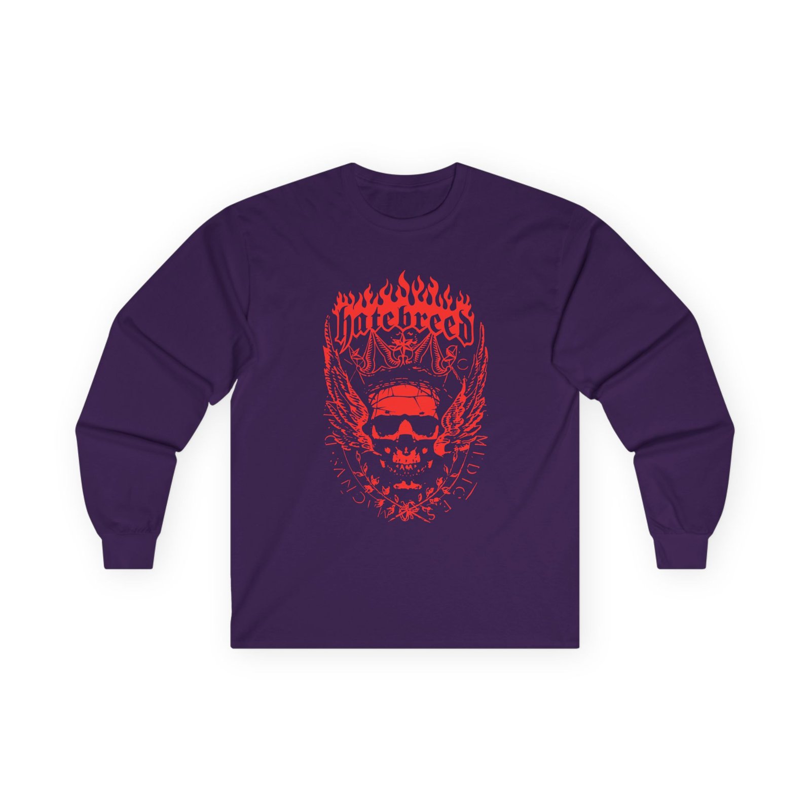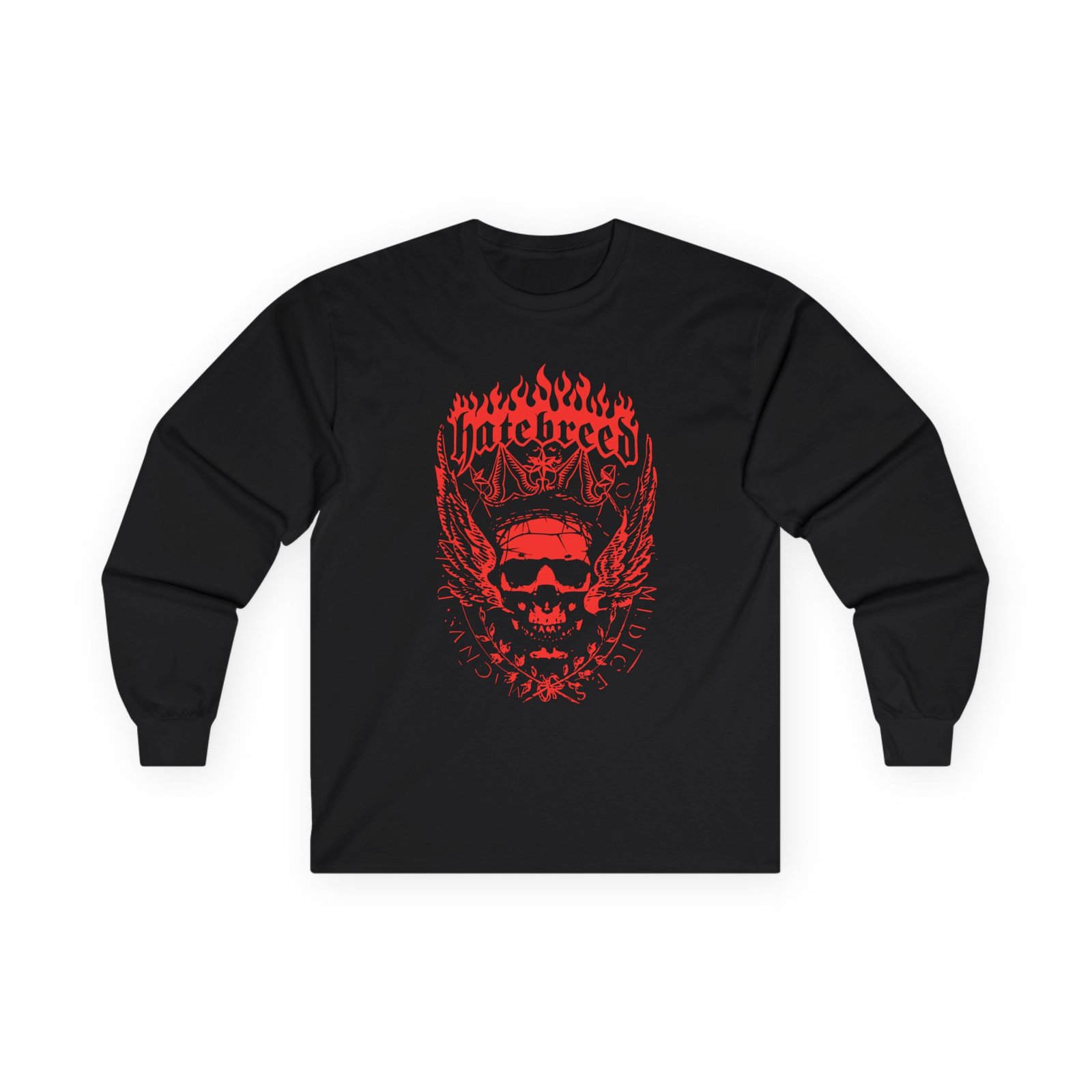 A bit more formal than a standard-issue t-shirt, the Hatebreed Crown ultra cotton long sleeve tee is a clear comfort winner. The sleeves also act as a nice frame. There are no side seams. The shoulders are taped for improved durability. This makes for a good fitting around the shoulders and neck. The cotton used for these shirts is environmentally friendly.