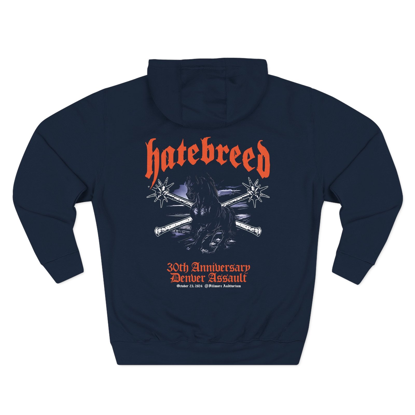 Beat the cold with this Hatebreed Denver Event premium pullover hoodie that’s just the right layer of warm and cozy. Made with three-panel fleece lining, this pullover is double stitched for durability and roomy. Pick one in your favorite color to match your style.