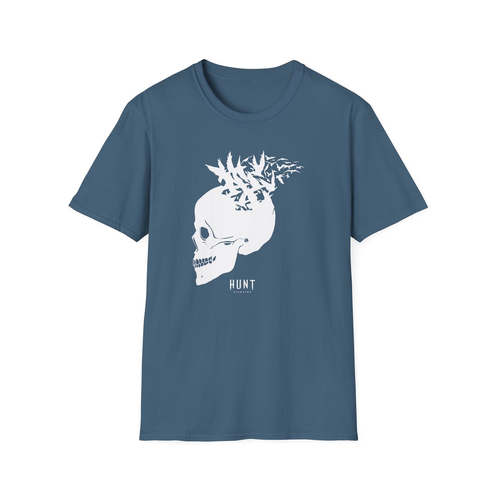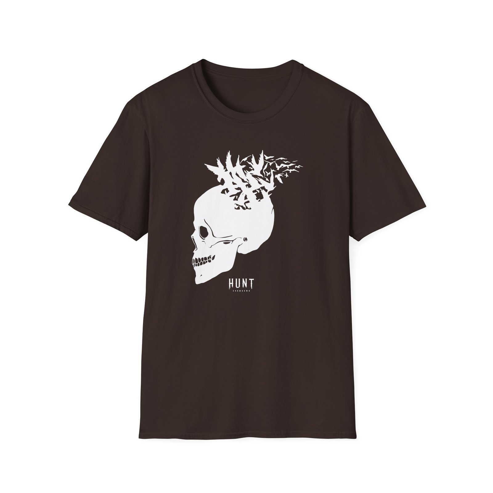 The Hunt Show Down Skull unisex soft-style t-shirt puts a new spin on casual comfort. Made from very soft materials, this tee is 100% cotton for solid colors. Heather colors and sports grey include polyester. The shoulders have twill tape for improved durability. There are no side seams. The collar is made with ribbed knitting to prevent curling damage.