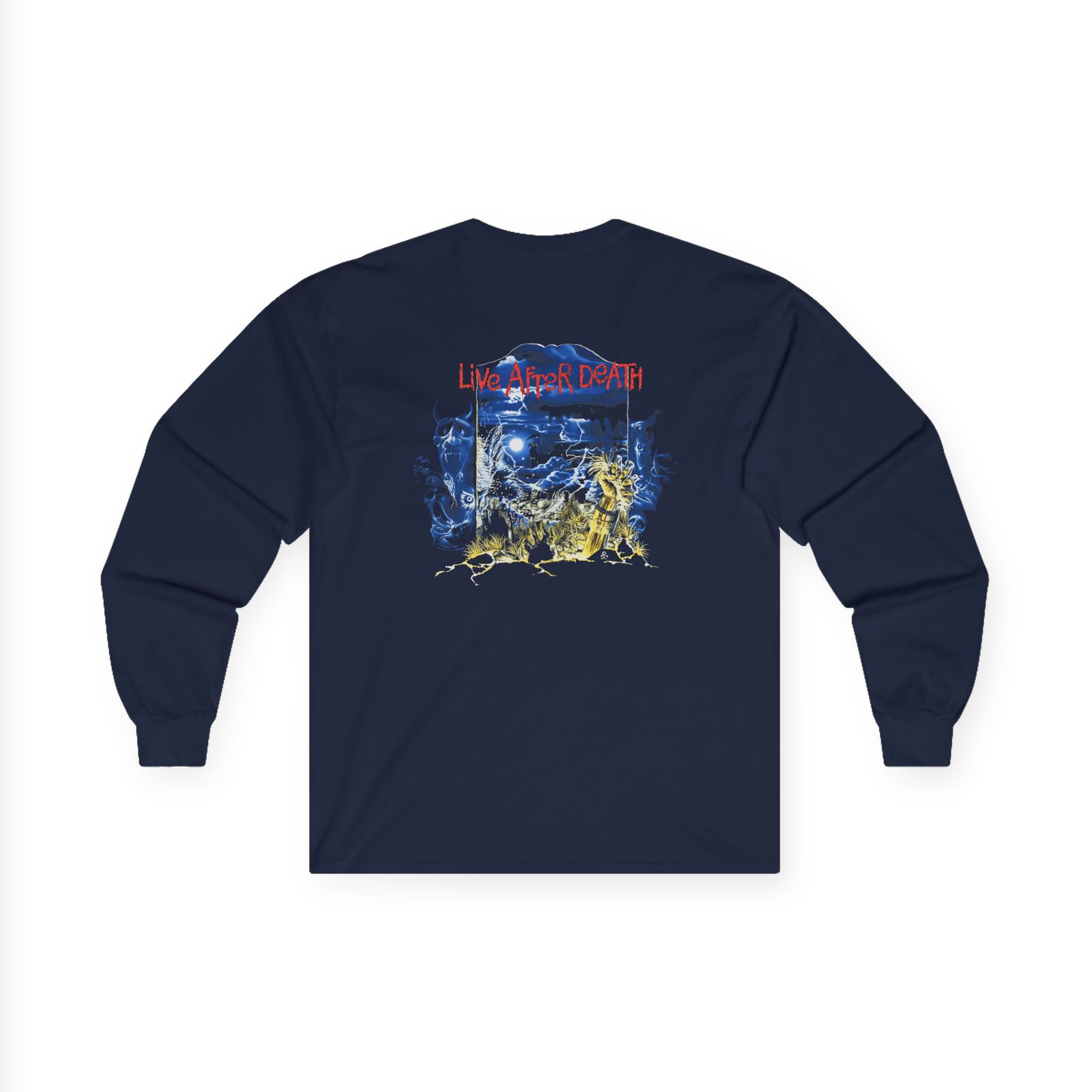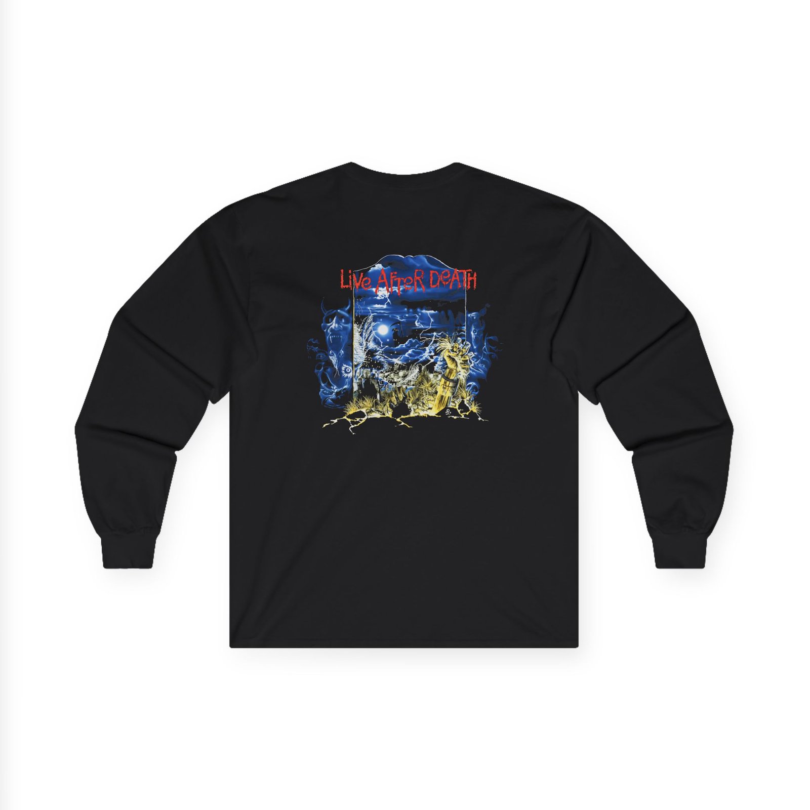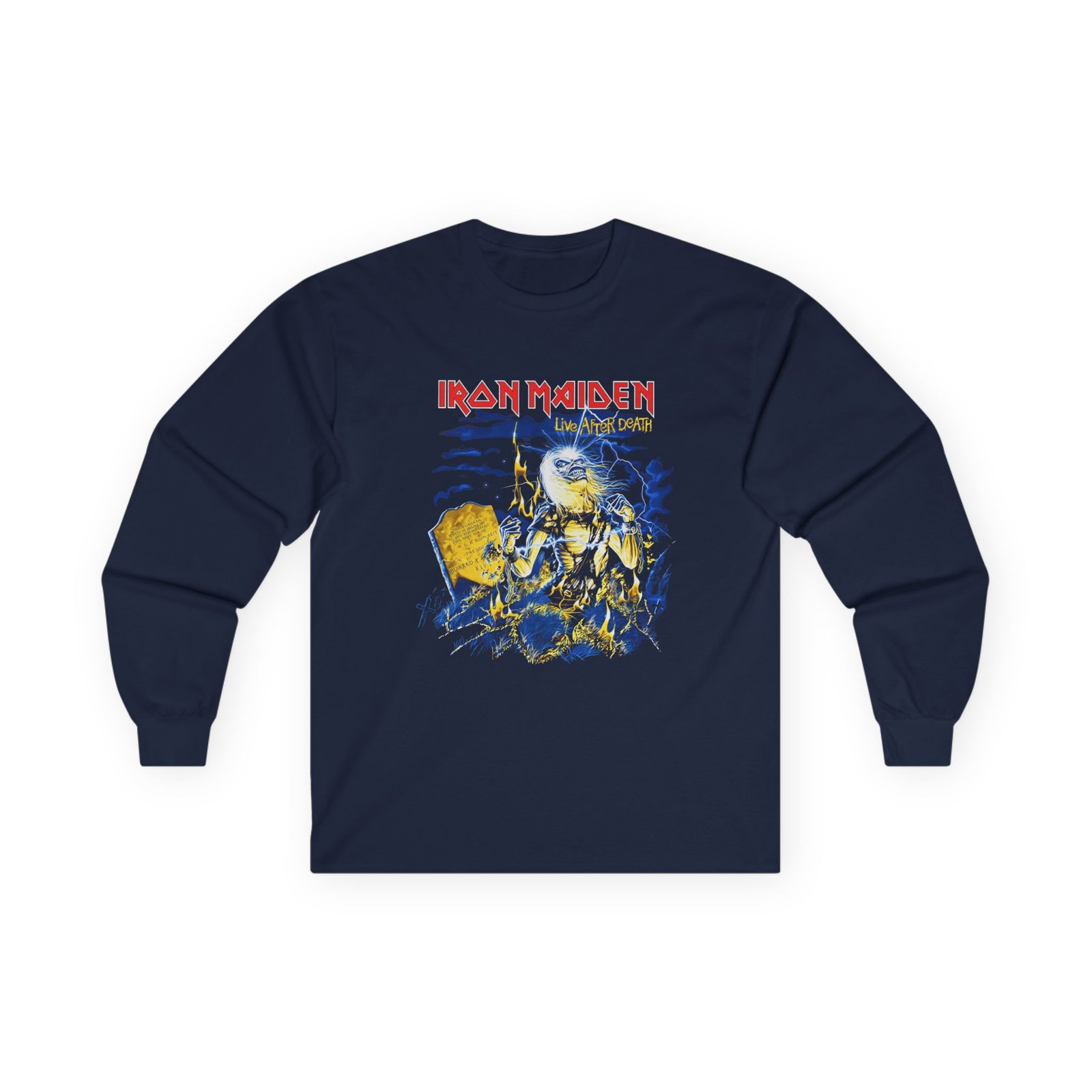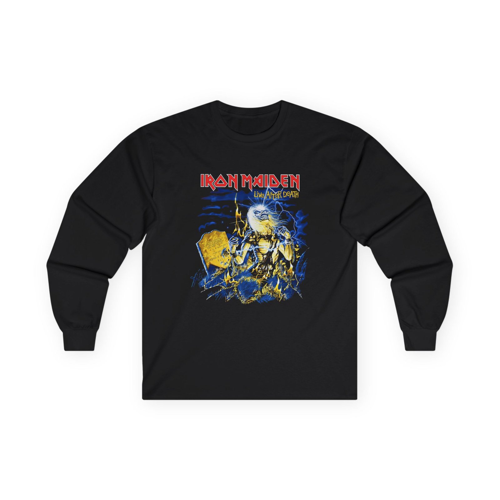 A bit more formal than a standard-issue t-shirt, the Iron Maiden Live After Death 40th Anniversary ultra cotton long sleeve tee is a clear comfort winner. The sleeves also act as a nice frame. There are no side seams. The shoulders are taped for improved durability. This makes for a good fitting around the shoulders and neck. The cotton used for these shirts is environmentally friendly.