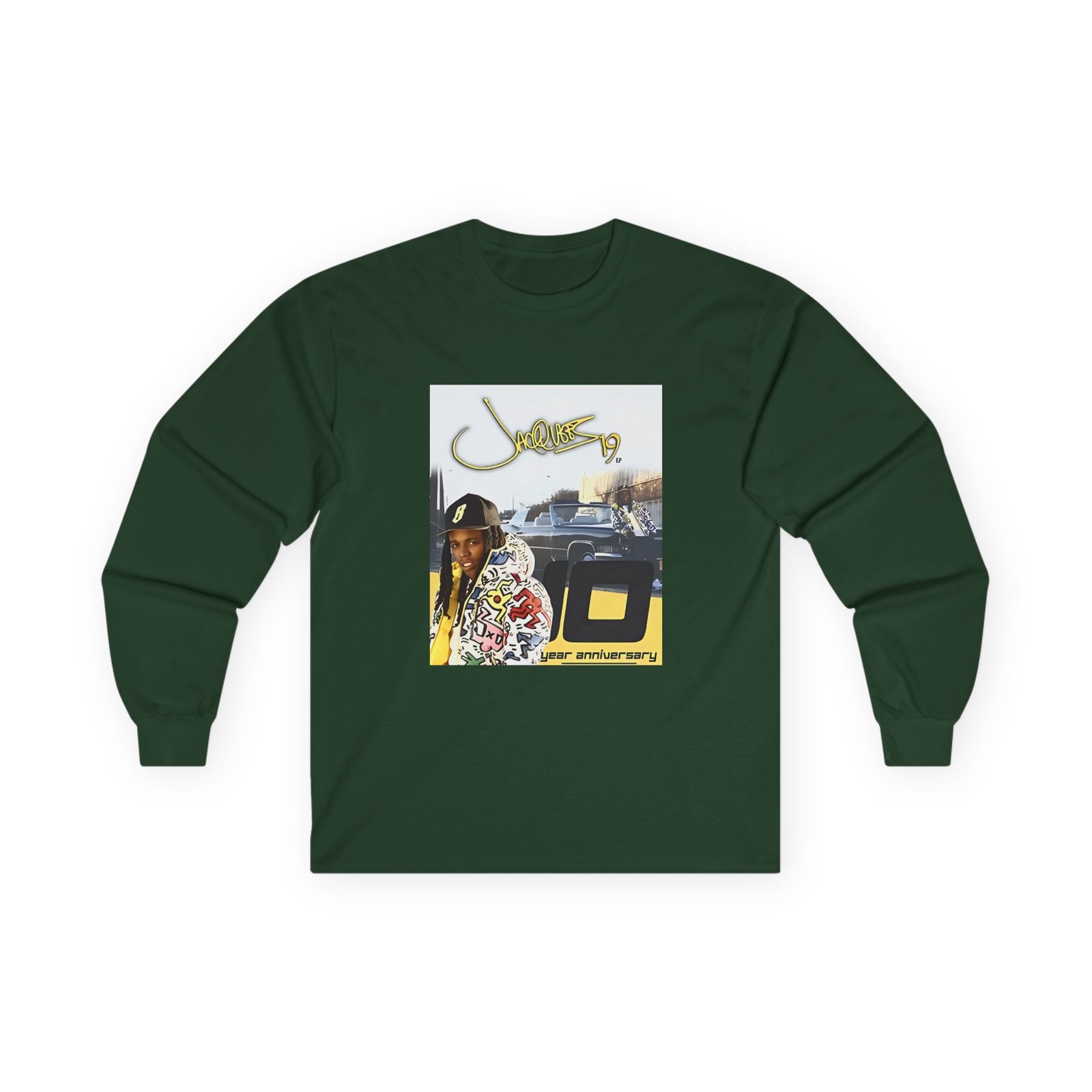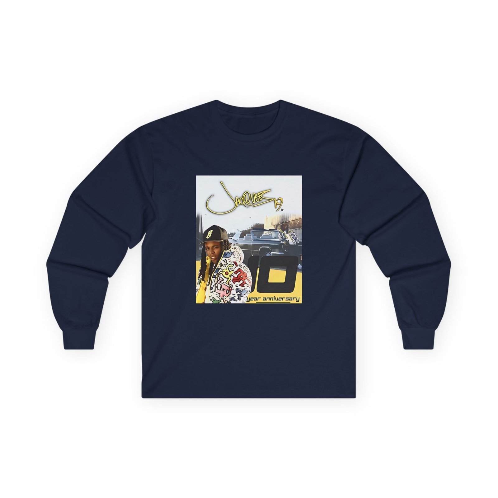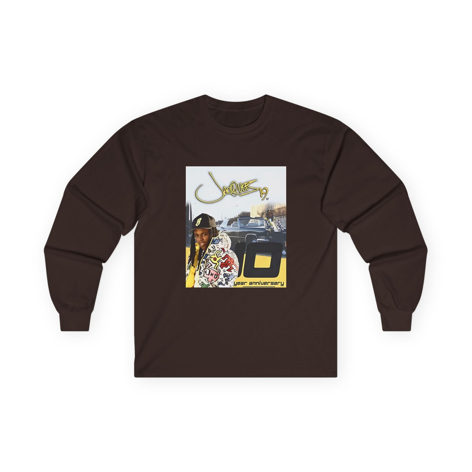 A bit more formal than a standard-issue t-shirt, the Jacquees 19” 10 Year Anniversary ultra cotton long sleeve tee is a clear comfort winner. The sleeves also act as a nice frame. There are no side seams. The shoulders are taped for improved durability. This makes for a good fitting around the shoulders and neck. The cotton used for these shirts is environmentally friendly.