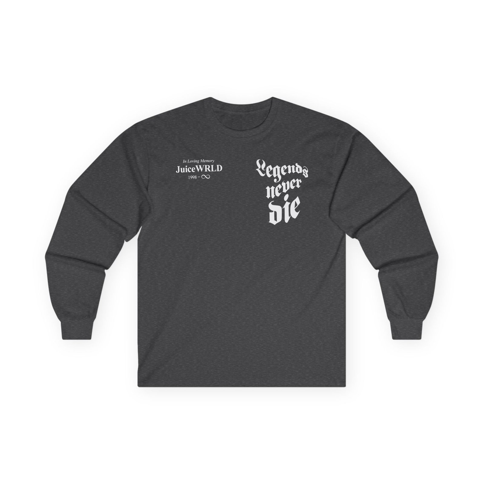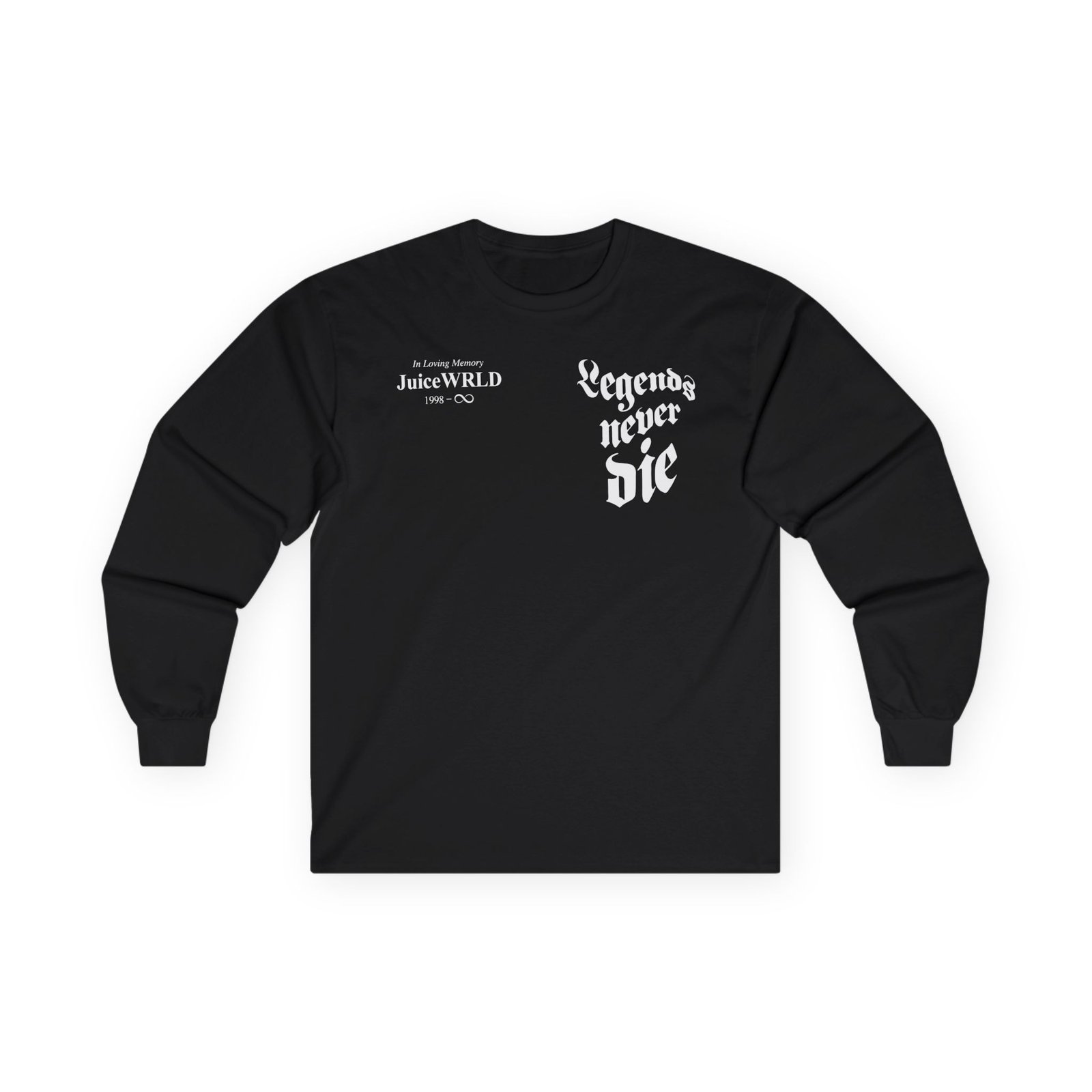 A bit more formal than a standard-issue t-shirt, the Legends Never Die Juice WRLD 999 Club ultra cotton long sleeve tee is a clear comfort winner. The sleeves also act as a nice frame. There are no side seams. The shoulders are taped for improved durability. This makes for a good fitting around the shoulders and neck. The cotton used for these shirts is environmentally friendly.